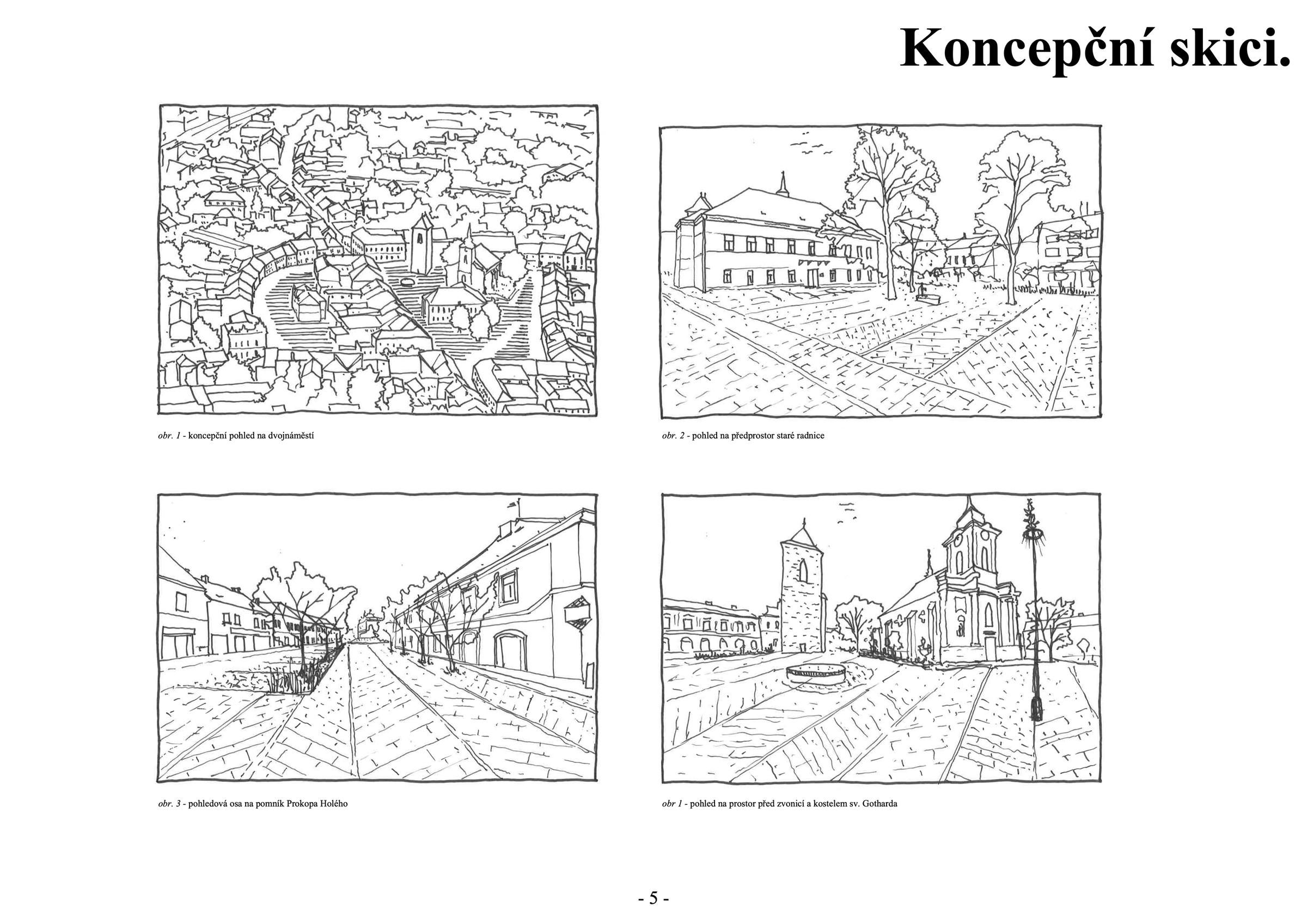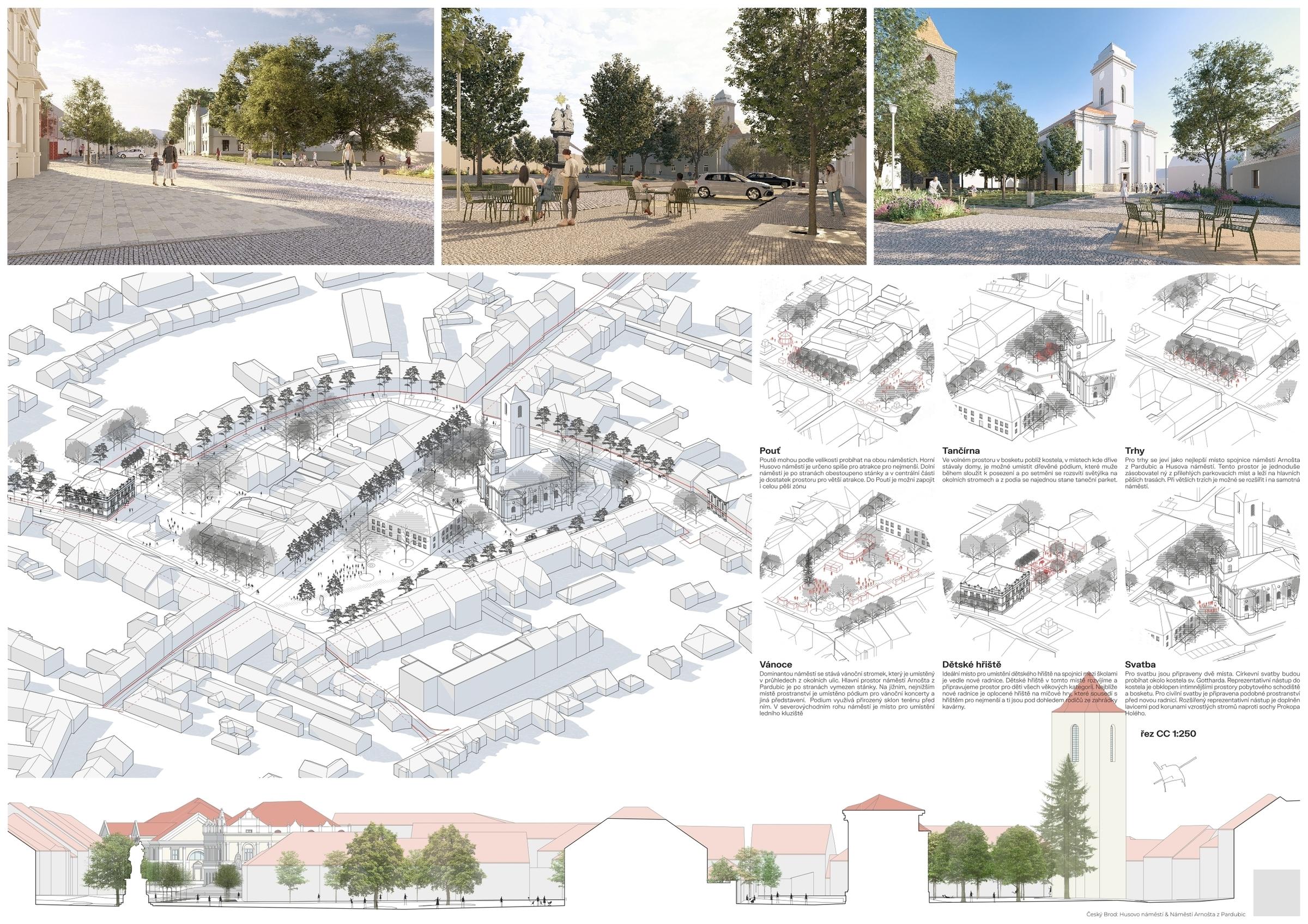 The urban design unites the two squares into one central urban space with several functional parts. This idea is supported by a unified theme in the paving pattern. Motor traffic is relegated to the outer edge of the square, allowing pedestrians maximum freedom of movement while staying within its entire inner area. One of the square's landmarks is house No. 1, the old town hall, in front of which is naturally the main gathering space for markets, festivals, or other social events. The proposal envisages the preservation of the trio of mature lime trees that define the intimate center of gravity of the space. (I) The most striking and oldest landmark is the church of St. Gotthard with its late Gothic bell tower, to which we propose a dignified forecourt complete with a new fountain and a place for erecting a Christmas tree or maypole. (II.) The link between these two spaces is formed by a newly created pedestrian promenade lining the parterre of the meat market, which, by excluding car traffic, becomes an ideal space for leisure time in the front gardens in connection with the active parterre. We propose a representative forecourt for the new town hall and the monument to Procopius the Great, with a residential tree line, which allows, among other things, wedding ceremonies to take place. (III.) Behind the elementary school building is the most intimate part of the whole area, and we propose a sitting area in the shade of the trees. (IV.) We close the gap left by the former brewery with a temporary building serving as a refreshment area, toilets and facilities for a multifunctional playground, or a summer cinema (V.), serving the general public and children from the nearby primary school buildings.