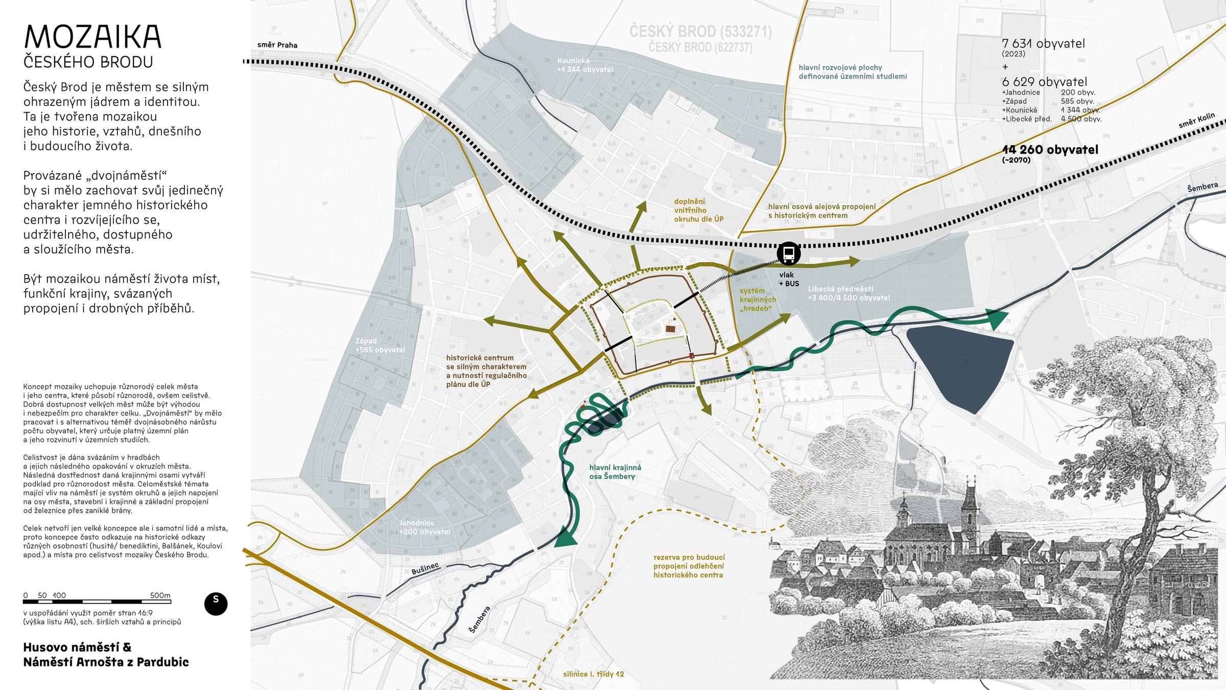 Český Brod is a town with a strong core and identity. The identity is a mosaic of history, relationships, and the lives of the people who make up the town. In the interconnected "dual town", the unique character of a welcoming and vibrant historic centre, an accessible and serving town, and a growing and developing settlement, develops. The mosaic concept captures the diverse whole of the town and its center, acting differently in detail and holistically on the whole. The square is a mosaic of the life of places, functional landscapes, bound connections, and small stories.