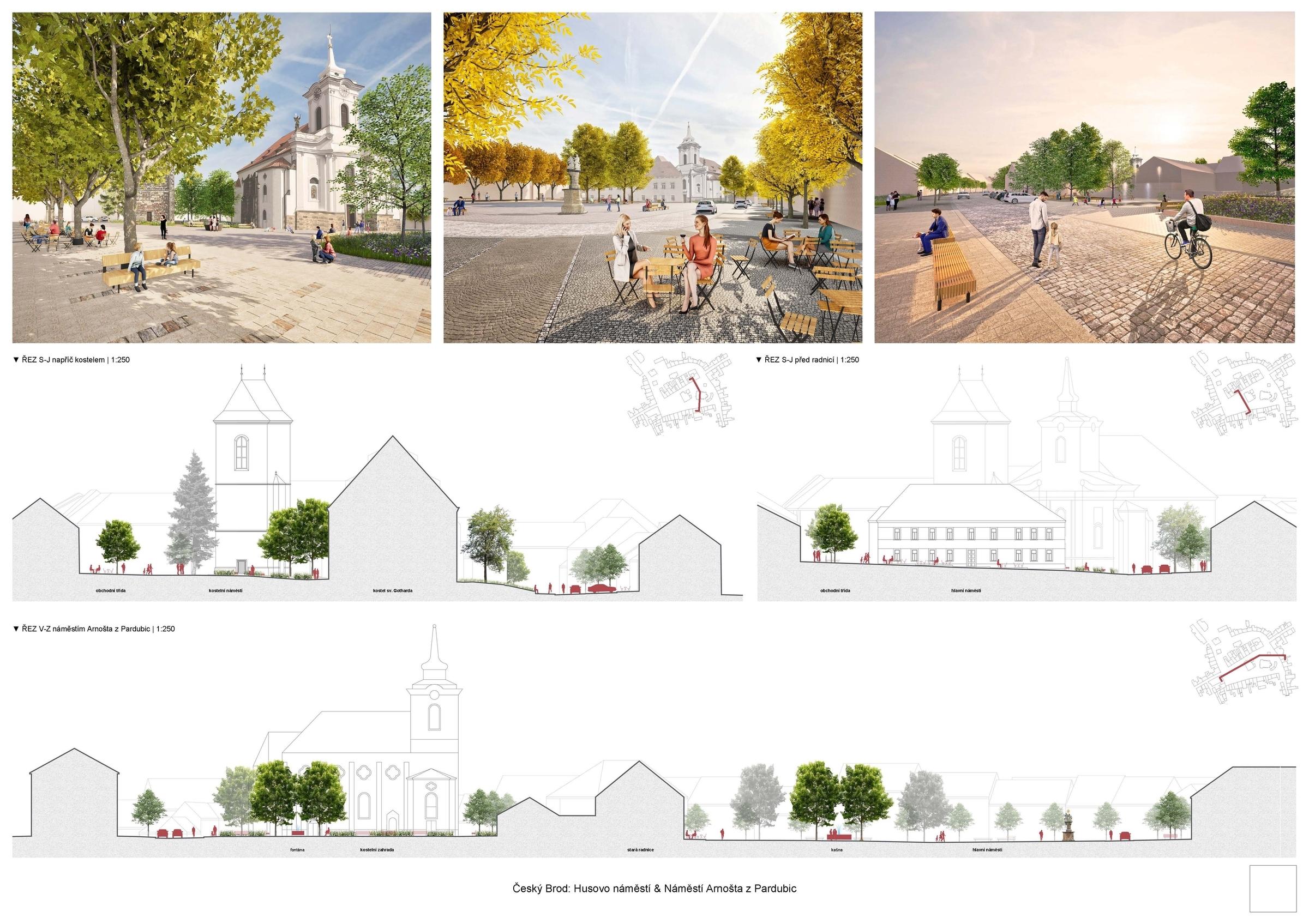 The jury appreciates a legible, complex and exceptionally well-designed proposal with above-standard graphic communication. It works very well with detail and the materials used. The greatest contribution is found in the generosity of the concept of the designed double square. The design stands out for its convincing spatial integrity and at the same time a very successful synergy of different places of residence with a distinctive character. It particularly appreciates the design of the intimate space in front of St. Gotthard's Church, while preserving the view from King George Street. From the main living space of Arnošt' z Pardubic Square in front of the old town hall, it directs traffic to the perimeter. It creates a real square enlivened by the placement of a new water feature as a spatial counterbalance to the sculpture of the Holy Family and space for the placement of a Christmas tree. The design presents a well thought out traffic solution with the possibility of refinement into a realistic form. The solution is variable with the ability to adapt to current needs. It opts for an efficient arrangement of perpendicular parking spaces around the roads. In order to reinforce the functioning of the parterre and the welcoming use of the pavements, the design works with an embedded tree line around the perimeter of the double square.