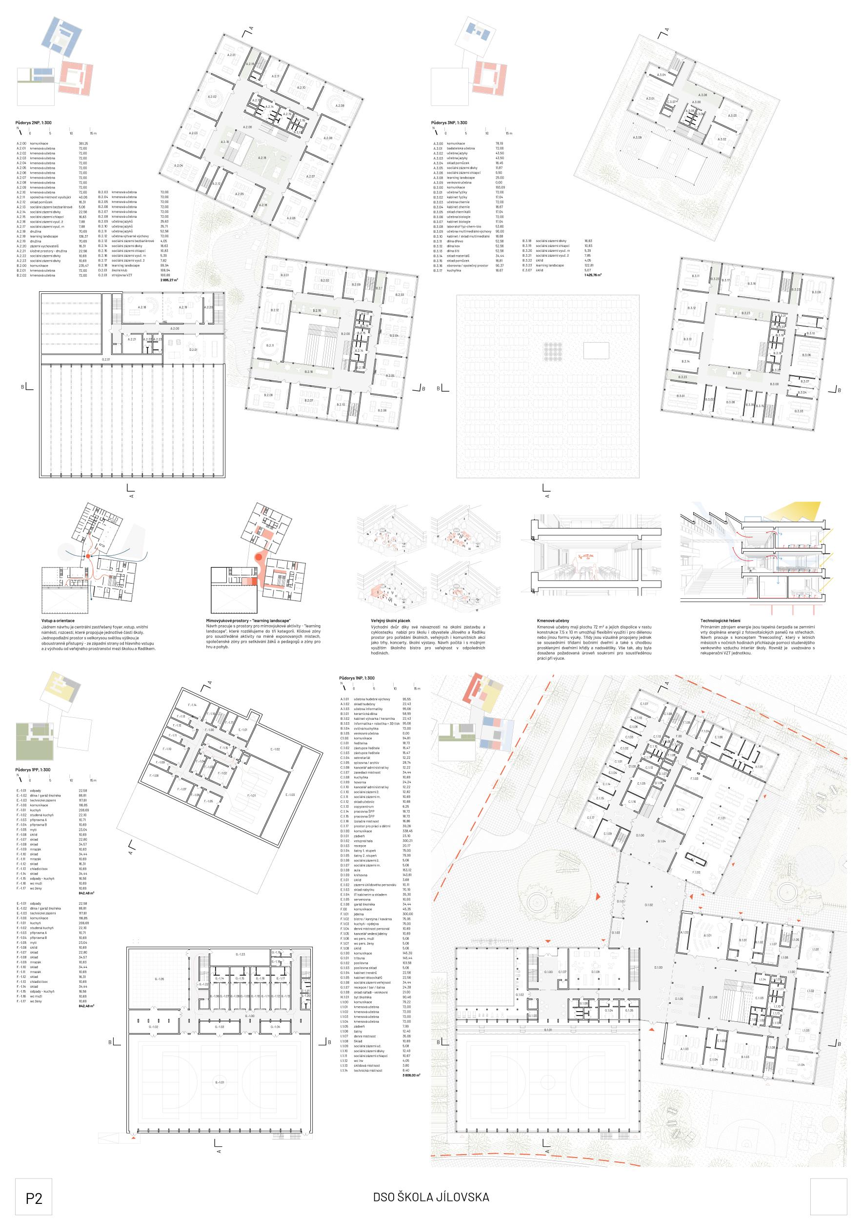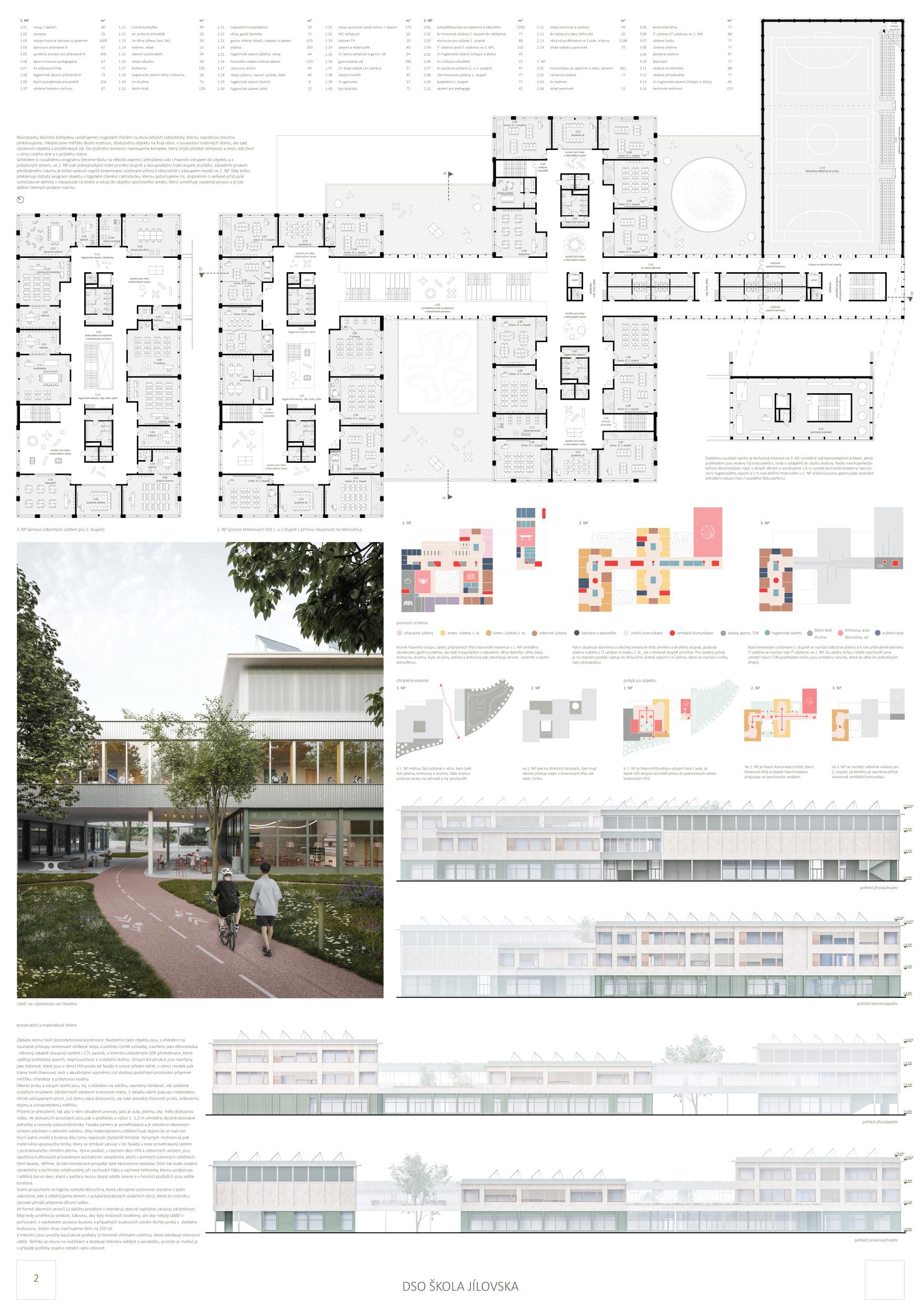 The jury appreciates the interplay of the three rotated volumes responding to the geometry of the site by aligning the individual blocks with the site boundaries. This compact layout allows for a large area to be created for park and sports facilities that can connect to the existing pond. A not very favourable interaction, however, is created with the adjacent low-rise residential development on the street K Rybníku. The outdoor circulation areas are well organised. Parking and Kiss and Ride spaces are appropriately located near the main entrance, while maintaining a clear separation. The design of the facades is considered by the jury to be very convincing and appealing. The glazed parts are protected from direct sunlight by horizontal shading blades, which reflects the sustainable approach to the project. The design has credibly addressed the irregular open spaces surrounding the school: ranging from an enclosed school garden for school breaks to an open public space, appropriate to the rural setting of the site. This pleasingly bold concept of the school's public plaza has the potential to act as a natural filter between the public and school spaces based on natural time-based separation. Given the lack of other protected outdoor spaces, this solution will be difficult to sustain in practice. Overall, the jury appreciates the emphasis on community and public use opportunities in the design of the outdoor areas of the school grounds, and the possibilities for separate community use of both the cafeteria and the sports hall. Unfortunately, a comparable potential for the outdoor sports facilities is limited by the lack of easy access to social facilities. The distribution of individual functions within the building is logical. The articulated floor plan allows for separate access to many parts of the building suitable for community use. The placement of the 1st grade level on the upper floors is surprising but understandable given the desire to minimize the footprint and makes sense when combined with the connection to the roof terrace and community room. The jury considers the independently operated pre-school classroom unit on the ground floor of the 1st grade level block to be a very successful solution, as well as the cleverly designed entrance area of the 2nd grade level serving as an assembly hall. The single-storey entrance area, designed as a communication hub is functional despite its slight spatial indifference and reliably guides users to the various operational parts of the building. The connection to the school plaza, which serves as the main outdoor space of the school, could be more generous. The jury appreciates the economical yet generous spatial design of the school's teaching areas. Especially in the 1st grade level, the central hall can serve well for alternative teaching despite the large number of connected classrooms, while in the case of the second level the spaces will serve more as equally necessary chill-out zones.