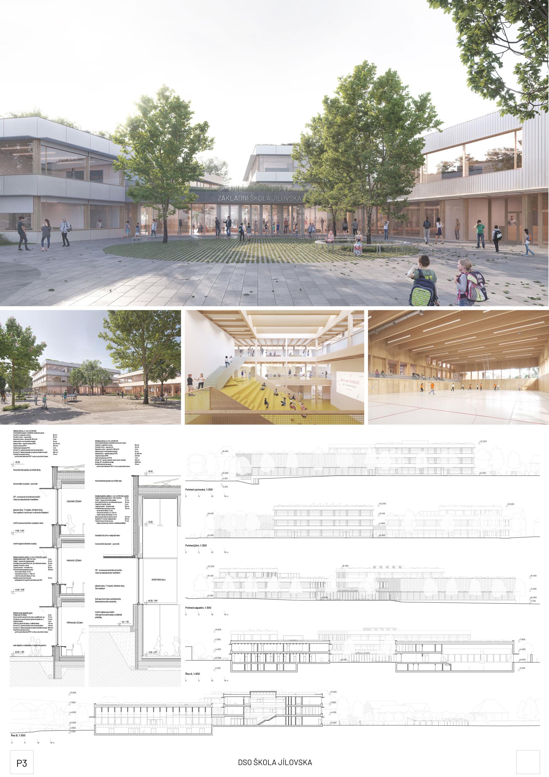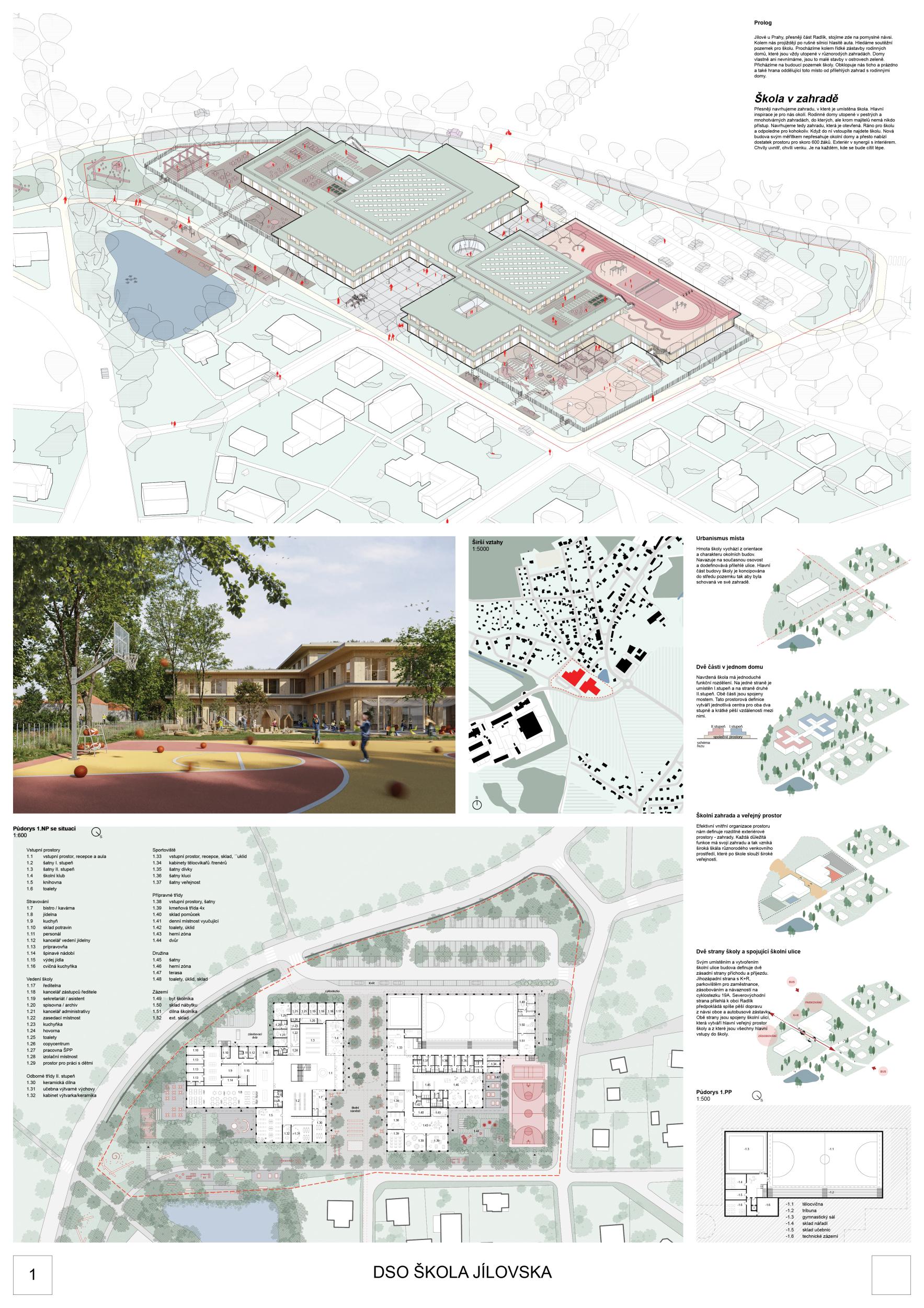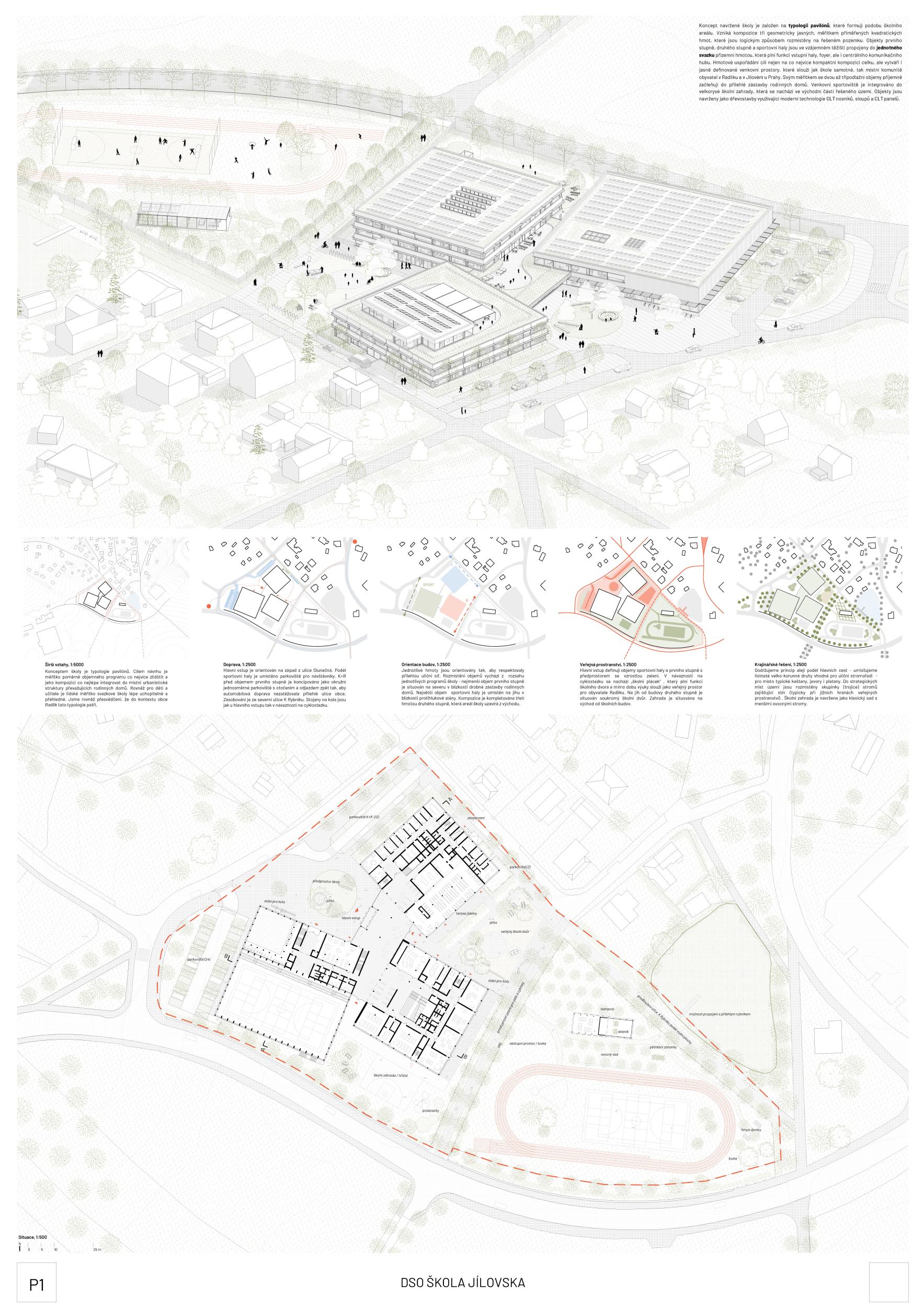 The concept of the designed school is based on the typology of pavilions, which, in ensemble, form the shape of the school grounds. We propose a composition of three geometrically clear, scale-appropriate quadratic masses logically distributed on the designed plot. The buildings of the first grade, the second grade, and the sports hall are connected in their mutual center of gravity into a unified volume by a ground floor mass that serves as an entrance hall, foyer, and central communication hub. The mass arrangement not only aims at the most compact composition of the whole but also creates clearly defined outdoor spaces that serve both the school itself and the local community of residents in Radlik and Jílové u Prahy. The scale of the two- to three-story volumes blends nicely into the adjacent development of houses. The outdoor sports field is integrated into the generous school garden, which is located in the eastern part of the area. The buildings are designed as timber buildings using modern technology of GLT beams, columns, and CLT panels.