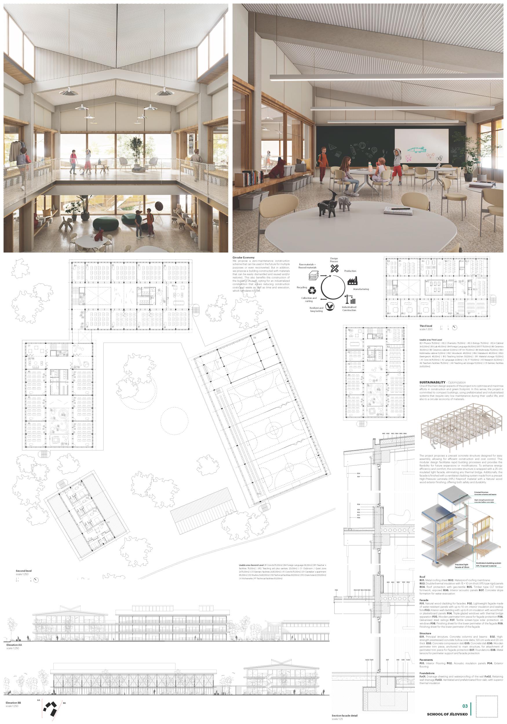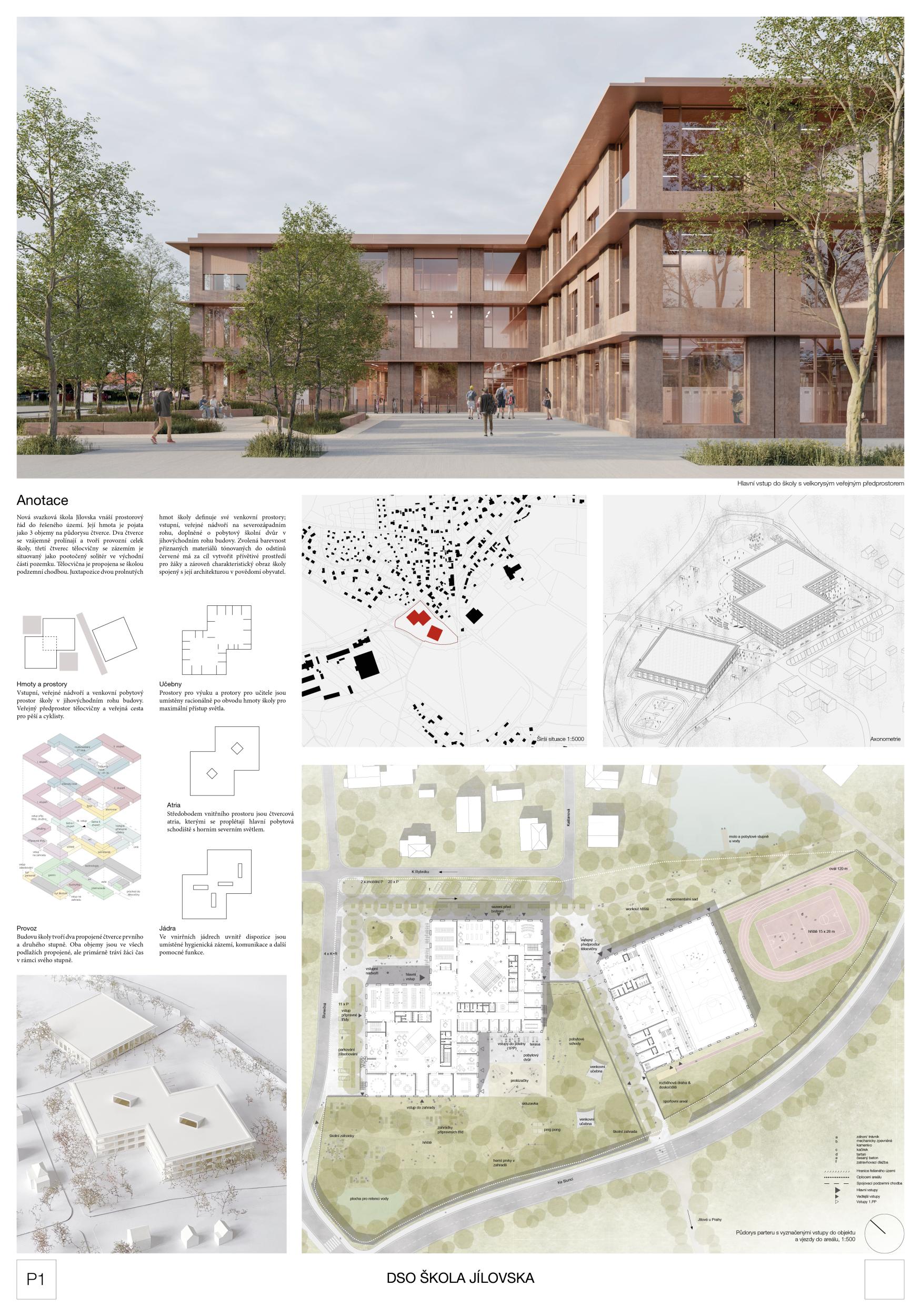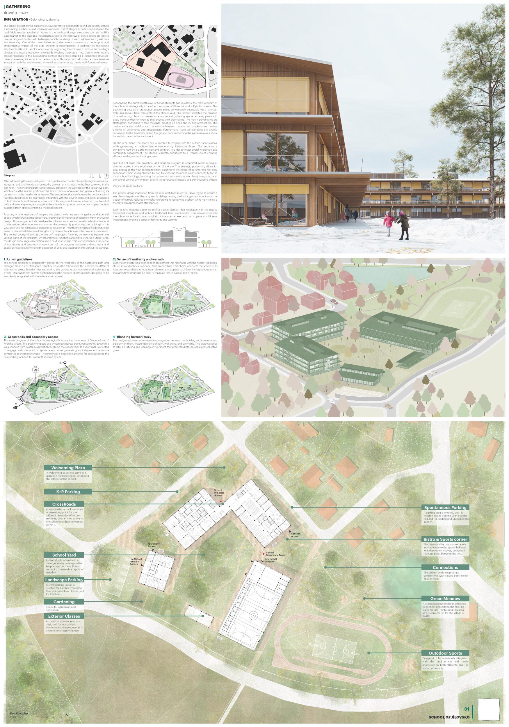 The architectural proposal for a school in the Jilovska region adopts a vernacular approach, blending harmoniously into the surrounding landscape and urban-rural context. The design seeks to create a seamless integration between the building and its natural and built environment, fostering a sense of calm, well-being, and belonging. In addition to this contextual sensitivity, the project explores avant-garde strategies in school design, emphasizing community, social interaction, and collaborative learning. Open, flexible, and hierarchically organized common spaces form the core of the design, encouraging students to gather, share experiences, and build meaningful relationships. Combining a deep respect for the local context with innovative educational spaces, the project aspires to offer a nurturing and inspiring environment that promotes personal and collective growth.