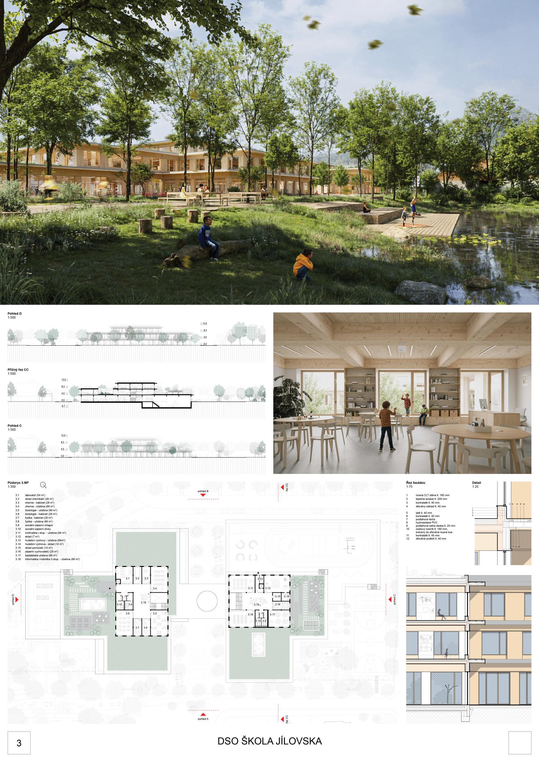 The jury appreciates the overall urban layout of the building, which is based on a cross-shaped design that interacts with its surroundings and creates a variety of outdoor spaces. Despite the generous extension of the building over the entire site, the school integrates very harmoniously into its surroundings thanks to the setback in volume, the interplay of different heights, terraces and the overall low number of floors. The area adjacent to the by-pass road provides primarily for vehicular movement, while more intimate spaces are dedicated to schoolyards and outdoor sports facilities. The K+R area is effectively designed by being integrated at the entrance and parking. Unfortunately, the parking lot impacts the historic pathway, whose connection via the bypass would deserve more attention. The proposal has offered the best solution to the public space of the school, which also has the potential to become a new centre for the village and neighbourhood. This is due to the concentration of appropriate events in the proposed 'school square': it allows it to be lively throughout the day. The dual access to the school via the sheltered square, from both the street K rybníku and the parking lot to the southeast, maximally favours the social interaction of all visitors and is perceived very positively. The design of the façade, which protects the façade surfaces from direct sunlight while achieving a balanced combination of transparent and opaque parts along with horizontal and vertical elements, is also very positively evaluated. Thanks to the use of wood and distinctive overhangs, it creates a pleasingly subtle and well-proportioned image. The result is a simple and light aesthetic. The jury appreciates the imaginative integration of the pond into the school grounds and the way in which the school and public spaces are appropriately mixed and intertwined on its banks. This creates great potential for expanded use of the school cafeteria and adjacent garden area for community and social purposes. The layout of the individual operational units of the school is logical, the division of the building on the ground floor into two separate units, which are again combined into one organism on the first floor, contributes to easy orientation. The design thus makes full use of the tools of natural horizontal and vertical division. Indoor spaces such as the sports hall, assembly hall and canteen are logically distributed and have protected outdoor areas. Particularly impressive is the grouping of teaching spaces, which offer a wide range of additional learning opportunities in the circulation areas. Common areas and workshops are concentrated on the ground floor, with appropriate links to a well considered parterre drawn into the heart of the school site, and combined with a cleverly chosen interface between sheltered and public outdoor space. This allows for naturally time-segregated use of public spaces and facilities by the school and community. The use of the main entrance hall as a school assembly hall is considered by the jury to be feasible, but the specific uses of this space require careful attention in the design. Learning spaces structured into larger clusters minimise single purpose corridors and allow for the effective use of circulation spaces for alternative learning. A generous communal space in the connecting bridge at the first floor level appropriately complements the clustered spaces of 1st and 2nd grade level and serves for communication and meeting. The jury positively evaluates the separate clusters of subject-specific classrooms set in the 3rd floor roofscape of each level. On the other hand, the location of the running track on the roof of the sports hall in direct connection with the classrooms of 1st grade level, which in turn lack direct contact with the outdoor garden, raises doubts. Overall, the jury assessed the proposal as an excellent contribution to the brief.
