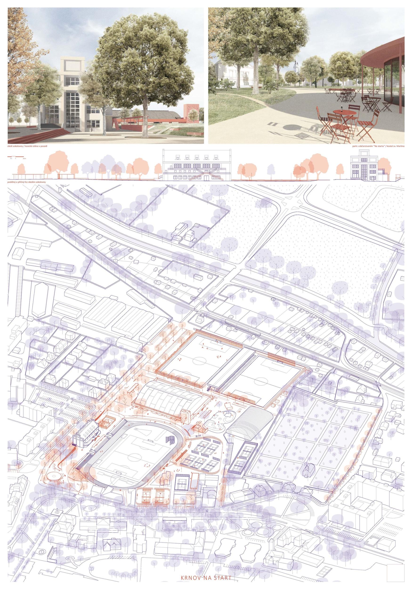 Nejkomplexněji pojatý soutěžní návrh včetně dopravy, zeleně a vodního hospodářství. Názorná grafika jasně odůvodňující návrh a myšlenkový postup. Návrh charakterizuje až urputná snaha o vizuální a provozní sjednocení novou vrstvou v jednotném barevném odstínu – v korálově červené. Ačkoliv návrh predikuje etapizaci, k naplnění, čitelnosti myšlenky sjednocení by došlo až v posledních fázích. Otázkou je zbytnost mnohých zásahů, jejich míra a uměřenost. V okolí Bauerovy sokolovny zásahy příliš „zastiňují“ stávající hodnoty. Naopak pozitivně bylo hodnoceno řešení nároží s kruhovým občerstvením umožňující i budoucí řešení kruhové křižovatky. Brána borců je adekvátně připomenuta a využita vzhledem k současnému fungování atletického stadiónu, včetně propojení ochozu pochozí střechou, avšak předprostor nerespektuje majetkoprávní vztahy. Pozitivně je hodnocena snaha o otevření, propustnost řešeného území a propojení světa sportu s městem, zahrádkáři, návštěvníky hřbitova…
