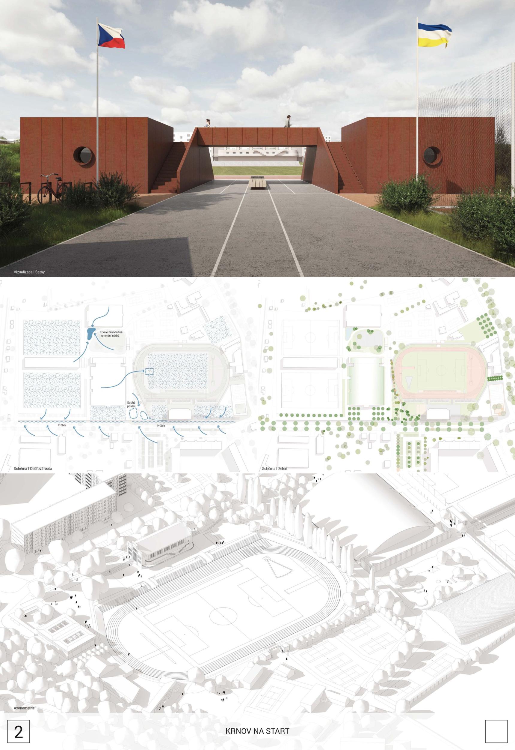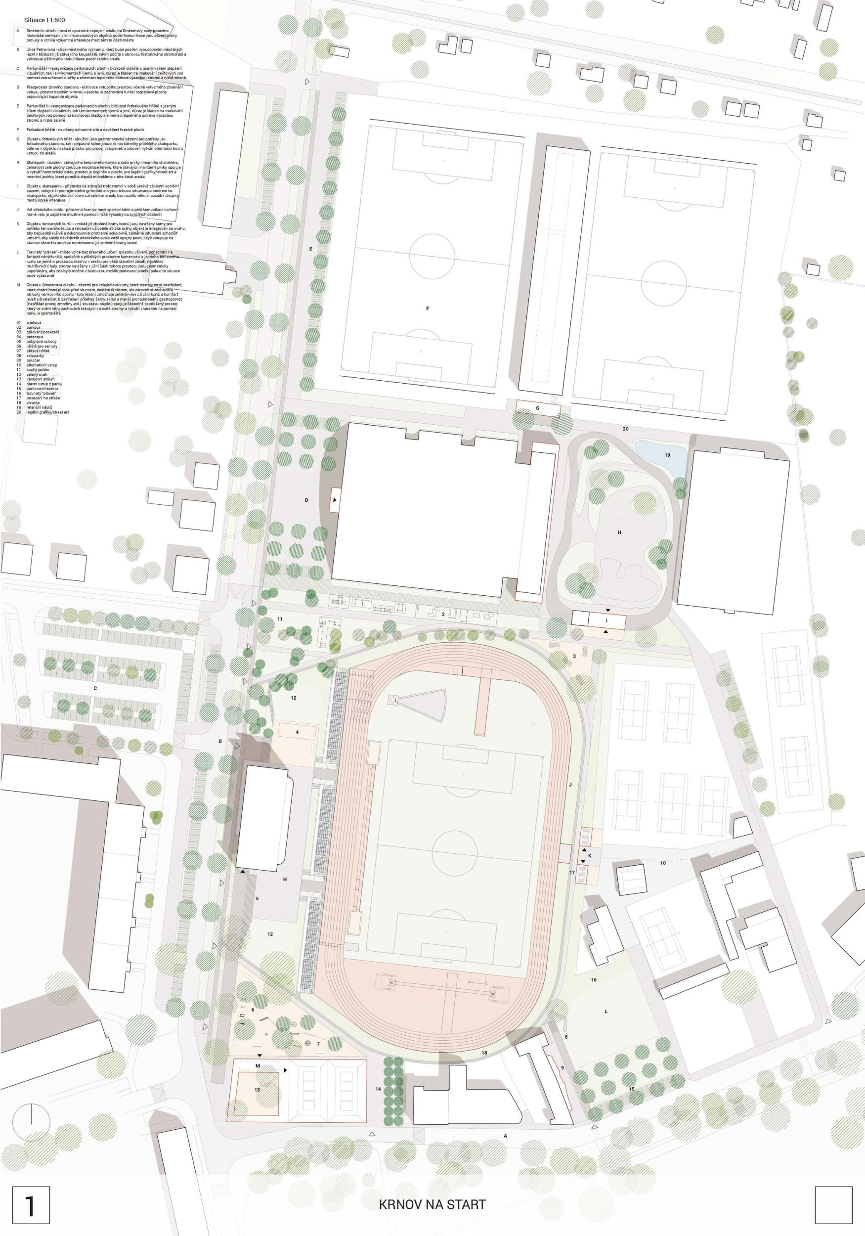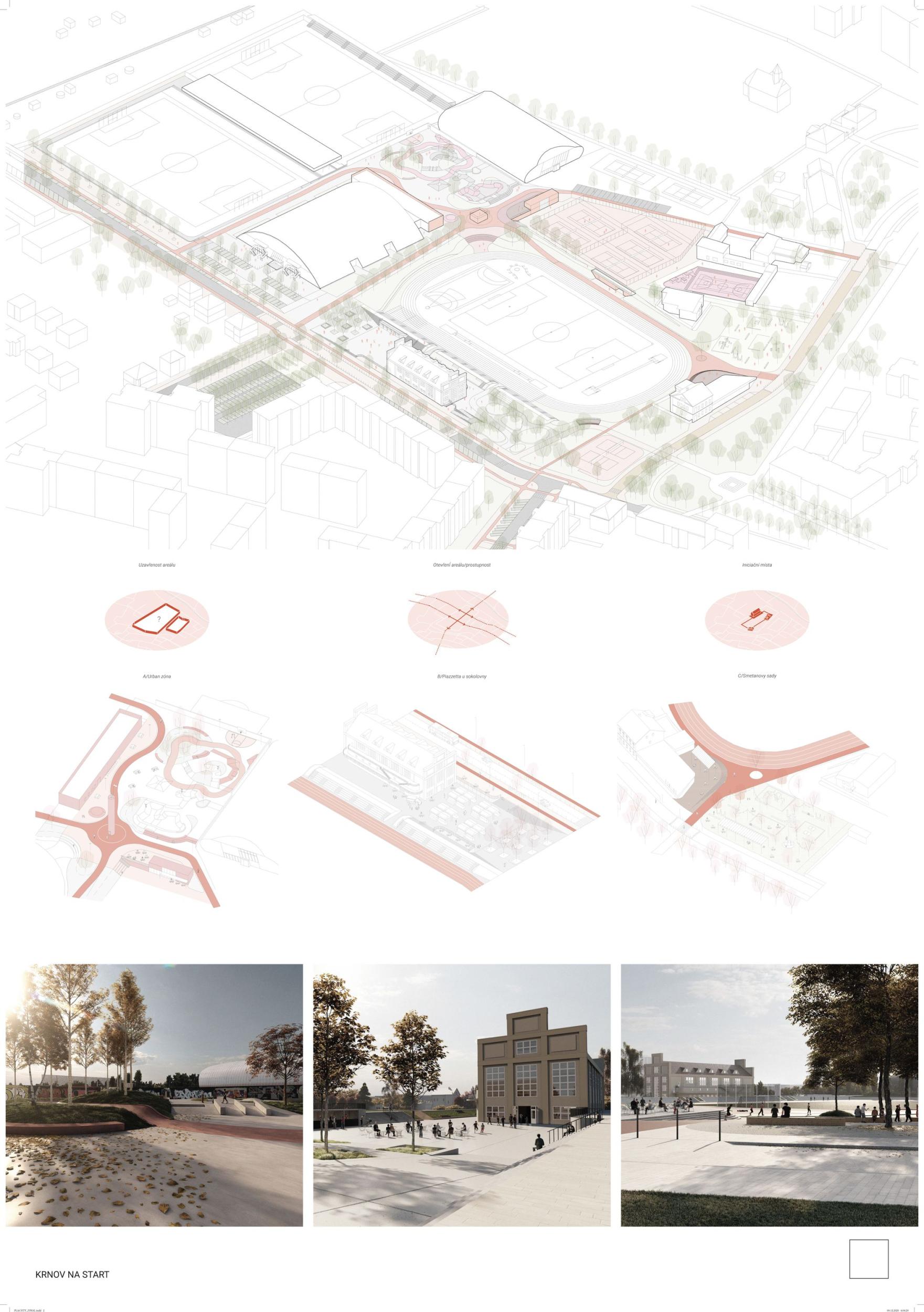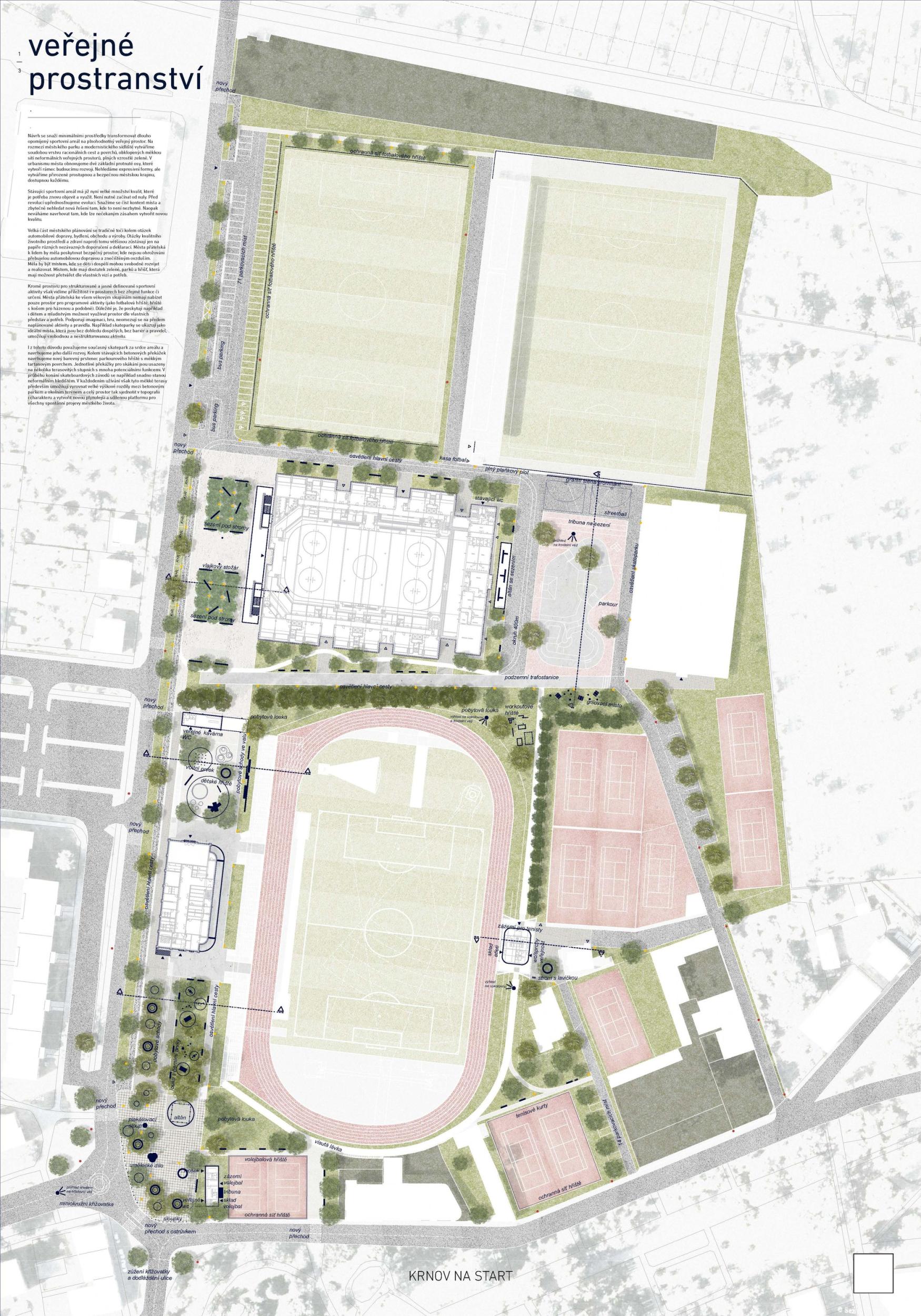 Otevření areálu sportovišť veřejnosti považujeme za správné rozhodnutí a bylo naším cílem tuto myšlenku naplnit. Okolí sokolovny přetváříme na všemi směry prostupný park s občerstvením Na Startu (bistro / kavárna), před zimním stadionem jsme vysázeli nepravidelný bosket a umístili lehký atlán. Toto jsou hlavní vstupy do území s veřejným prostorem odpovídajícím důležitosti jejich postavení a rozloze. Stávající architekturu doplňujeme dalšími drobnými objekty, které promlouvají vlastním jazykem, ale v respektu ke stávající architektuře. I přez jejich subtilnost jsou zřetelnou současnou vrstvou, kterou areál potřebuje “jako sůl”. Nad rámec zadání do areálu myšlenkově zahrnujeme také prostor hřbitova, resp. navrhujeme v budoucnu kultivovat ulici Hřbitovní, která je rozhraním rozsáhlé rezidenční čtvrti, jejíž obyvatelé znamenají pro budoucí podobu a užívání areálu velký potenciál. Stejným způsobem napojujeme na vytyčený okruh uživatele zahrádkářských kolonií a část půvabného nábřeží s návazností na koupaliště. Jedná se o širší vztahy, které není možné opomenout.