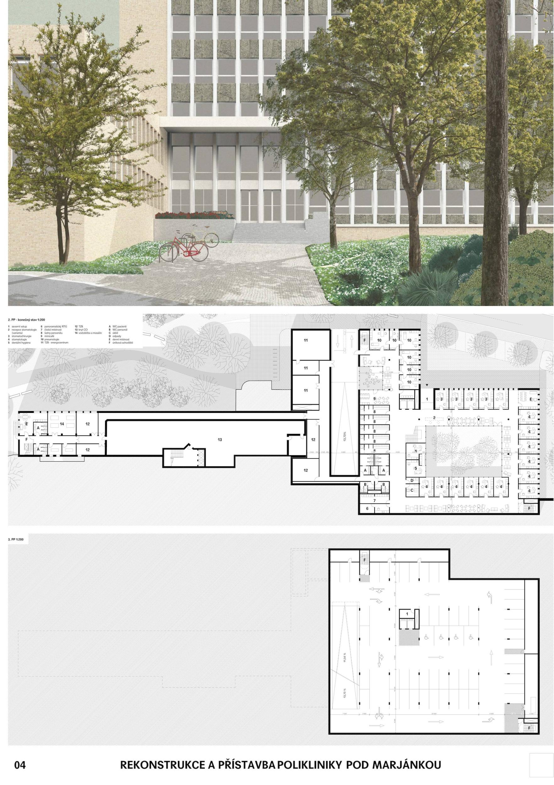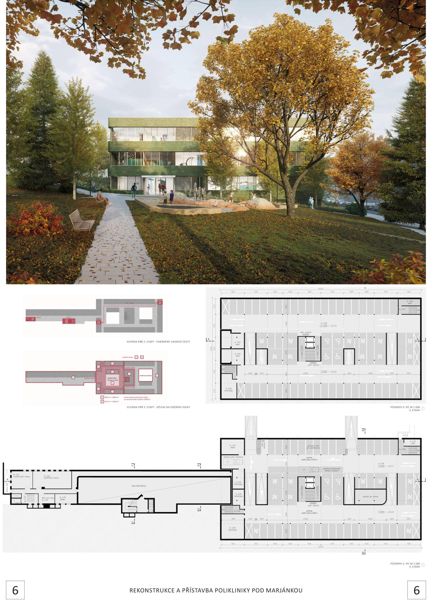A compact form of a polyclinic extension with an internal atrium. The clean structural design of the extension is well integrated with the parking, allowing for good layout variability. The form of the facades is simple, referring to the original building, which also supports the variant placement of the internal partitions. The rating is lowered by the overly utilitarian and repetitive facades, an internal standard wide circular corridor with little contact with the atrium, waiting areas with insufficient opportunity to segregate patients, no contact with examination rooms, and a high likelihood of filling the narrow corridor outside the examination rooms with seating furniture. The offsetting of the extension from the reconstructed part is only advantageous in phasing and construction, but the extension and the original building do not form a single unit. The passage between the buildings is problematic from a safety and maintenance point of view. The atrium, freely accessible from the park, is advantageous for maintaining the greenery but loses its utility potential by choice of adjacent operations. The direct entrances to X-ray and dentistry are of no deeper significance. The hierarchy of entrances will not be apparent once construction is complete. The space for a central reception is inadequate, being limited to basic information only. The proposal to rehabilitate the reinforced concrete skeleton and insulate the existing building is also unconvincing.