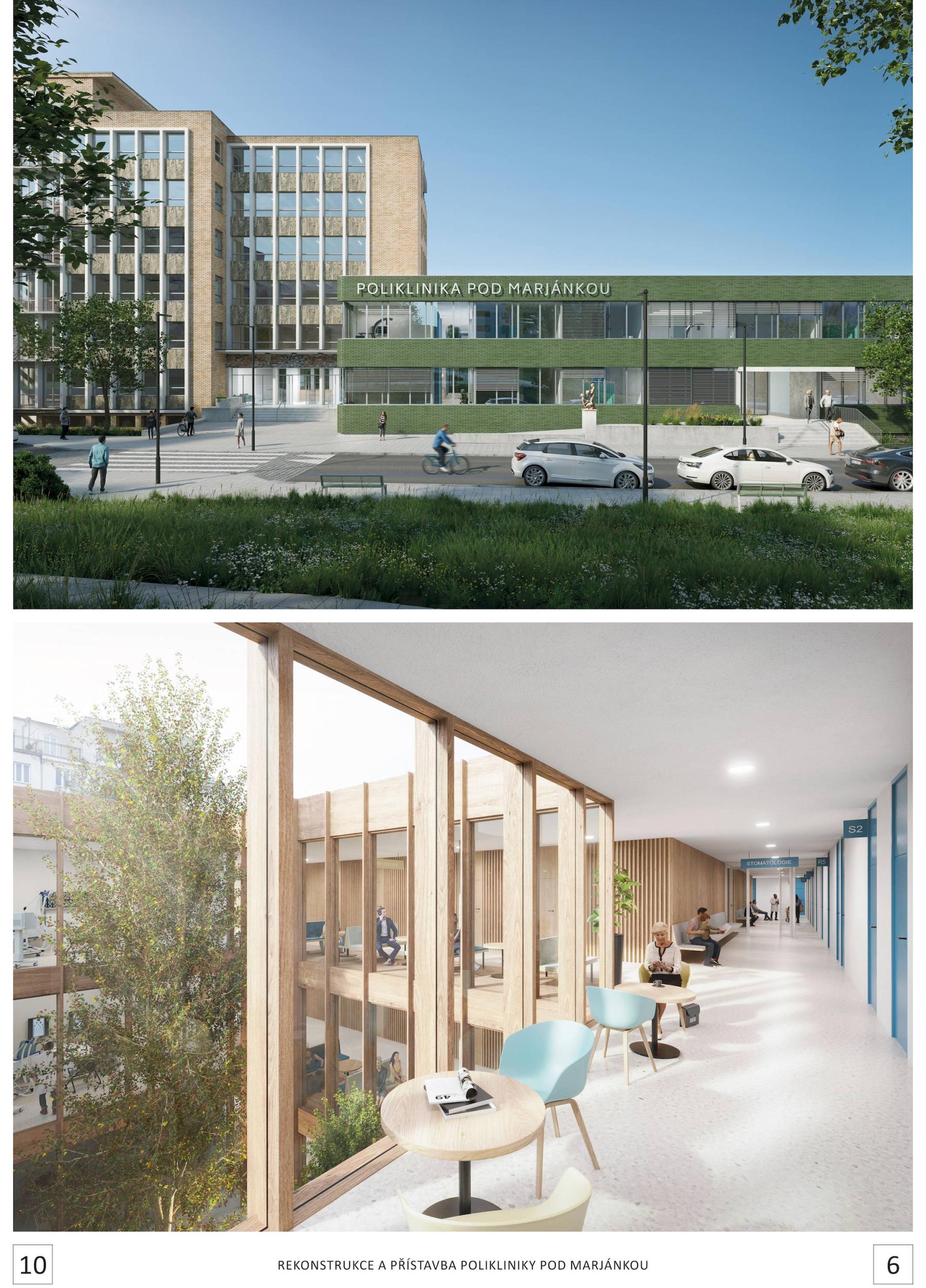 The design of the reconstruction and extension of the Pod marjánkou polyclinic is an architectural task on several levels. The design combines technical and technological procedures that will enable quality implementation. At the same time, it reinterprets the position of the historic building and the whole area in relation to its surroundings. It opens up the new building to the park and integrates previously disconnected small pieces of green space into a well-deserved living space for the whole neighborhood. Last but not least, it meets the stringent requirements for medical operations and their limitations. The reconstruction of the high-rise section and the requirement for continuous operation place additional demands on the thoughtful design of the central hall. The central hall also creates a natural space that opens up the building to different sides and also different levels. The design, therefore, maintains the existing routes to which the district residents are accustomed but simultaneously brings new ones into the area. The shape and layout of the building respect the historic building, as well as the requirements of conservation while responding to its surroundings and redefining the street lines.