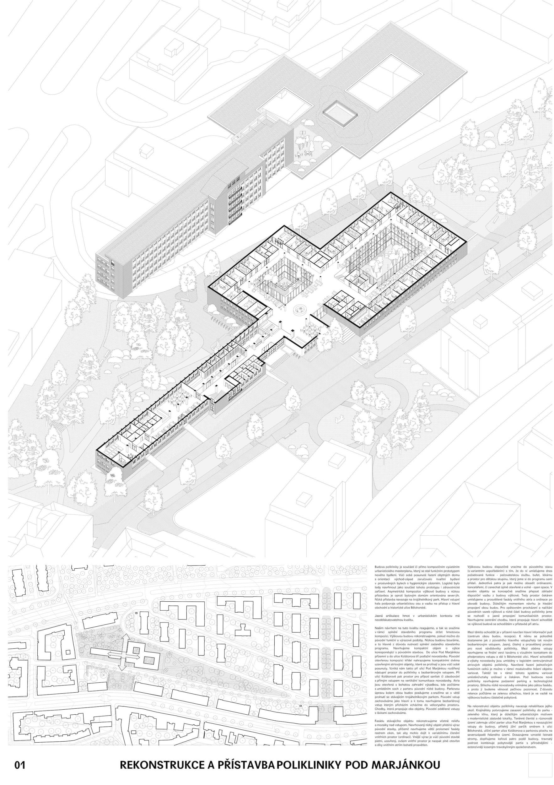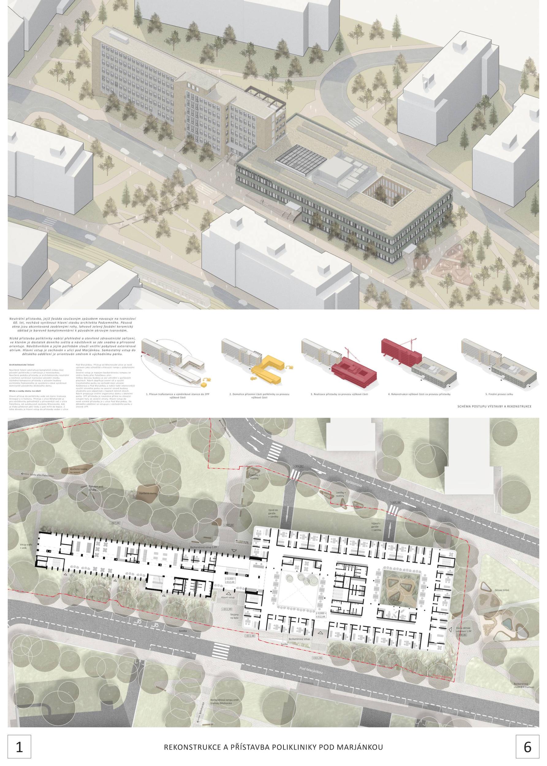 The Pod Marjánkou Polyclinic (Richard Podzemný, 1960-62) is one of the best functionalist architectures, but its current technical condition requires urgent reconstruction. The vision envisages the construction of a new part of the polyclinic in contact with the existing basic high mass, a compact, clean three-story prism with an inner atrium connected to the park with two floors applied from the ground floor level; the building also has three underground technical and parking floors.