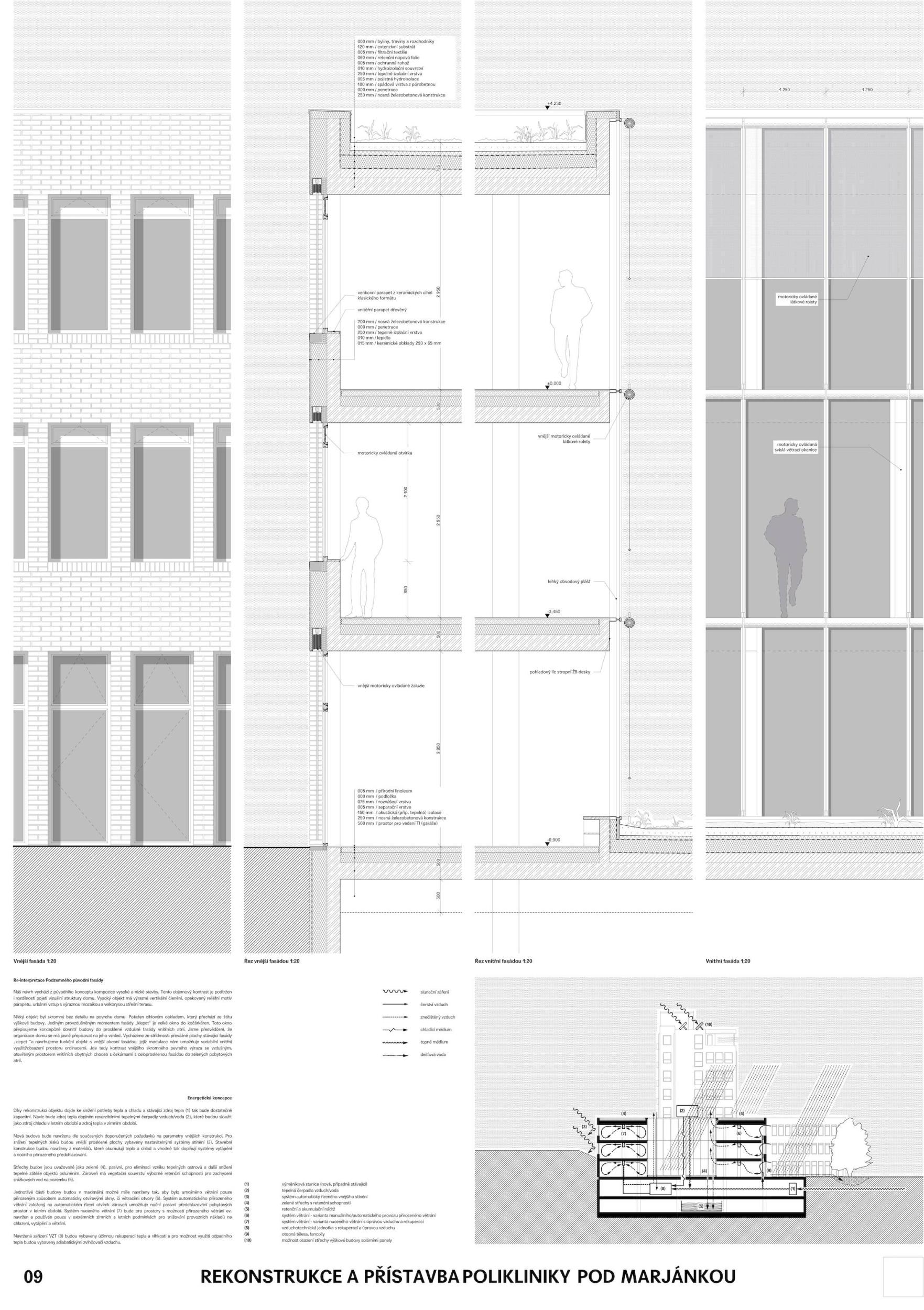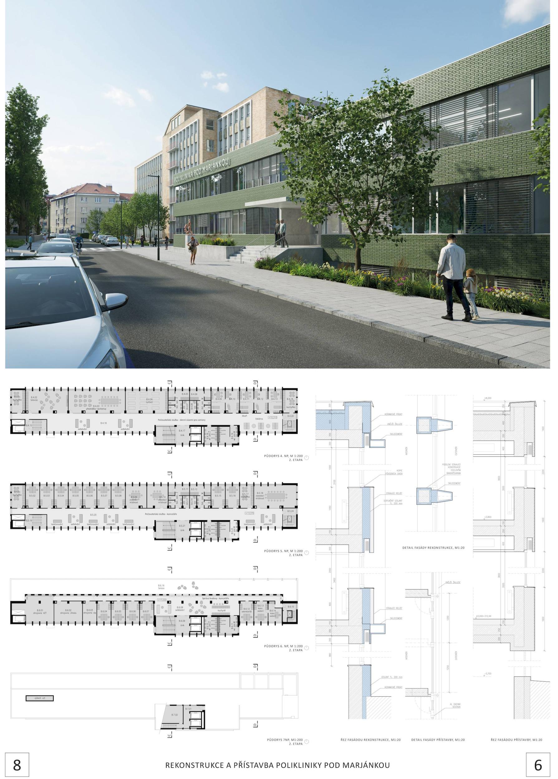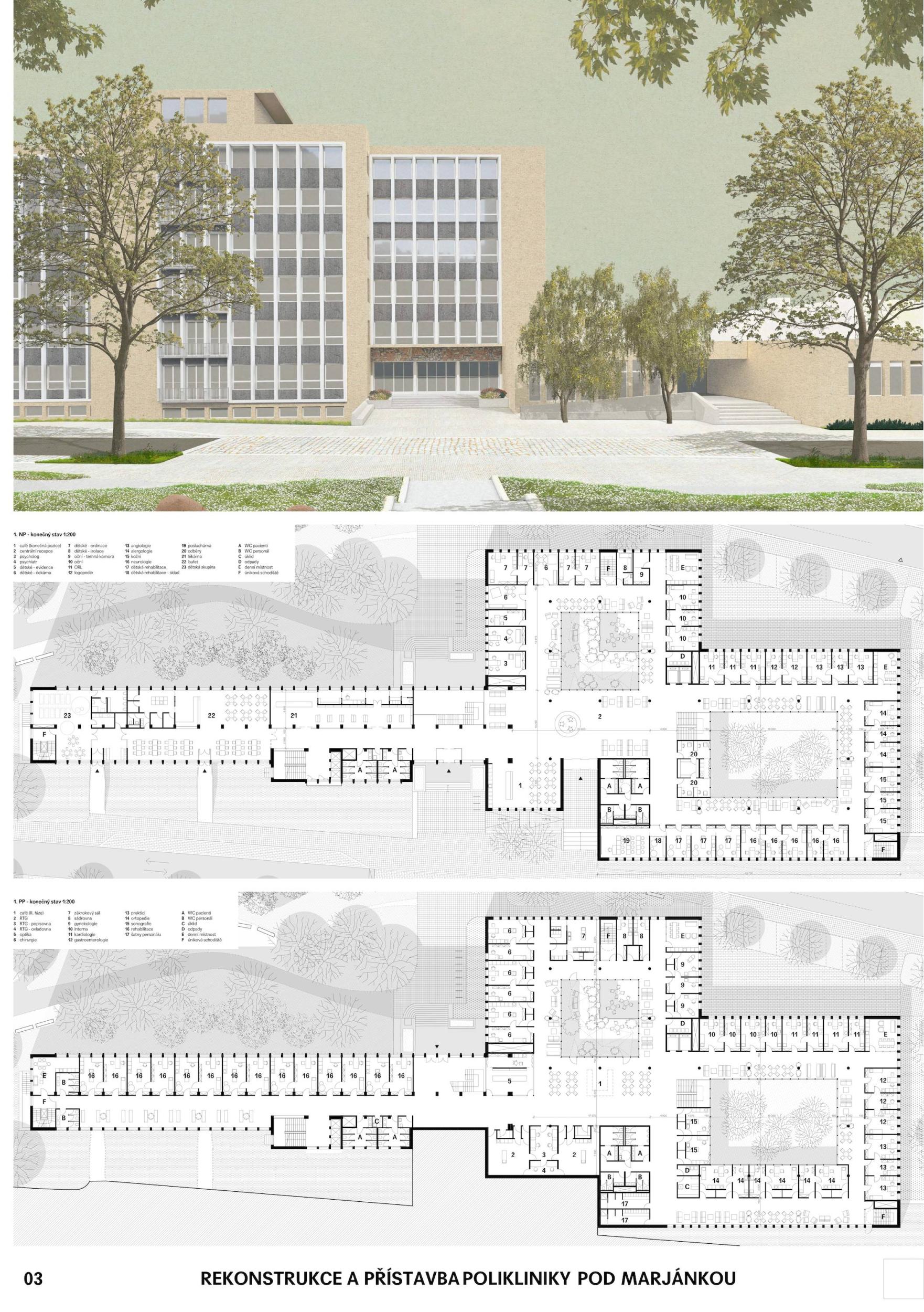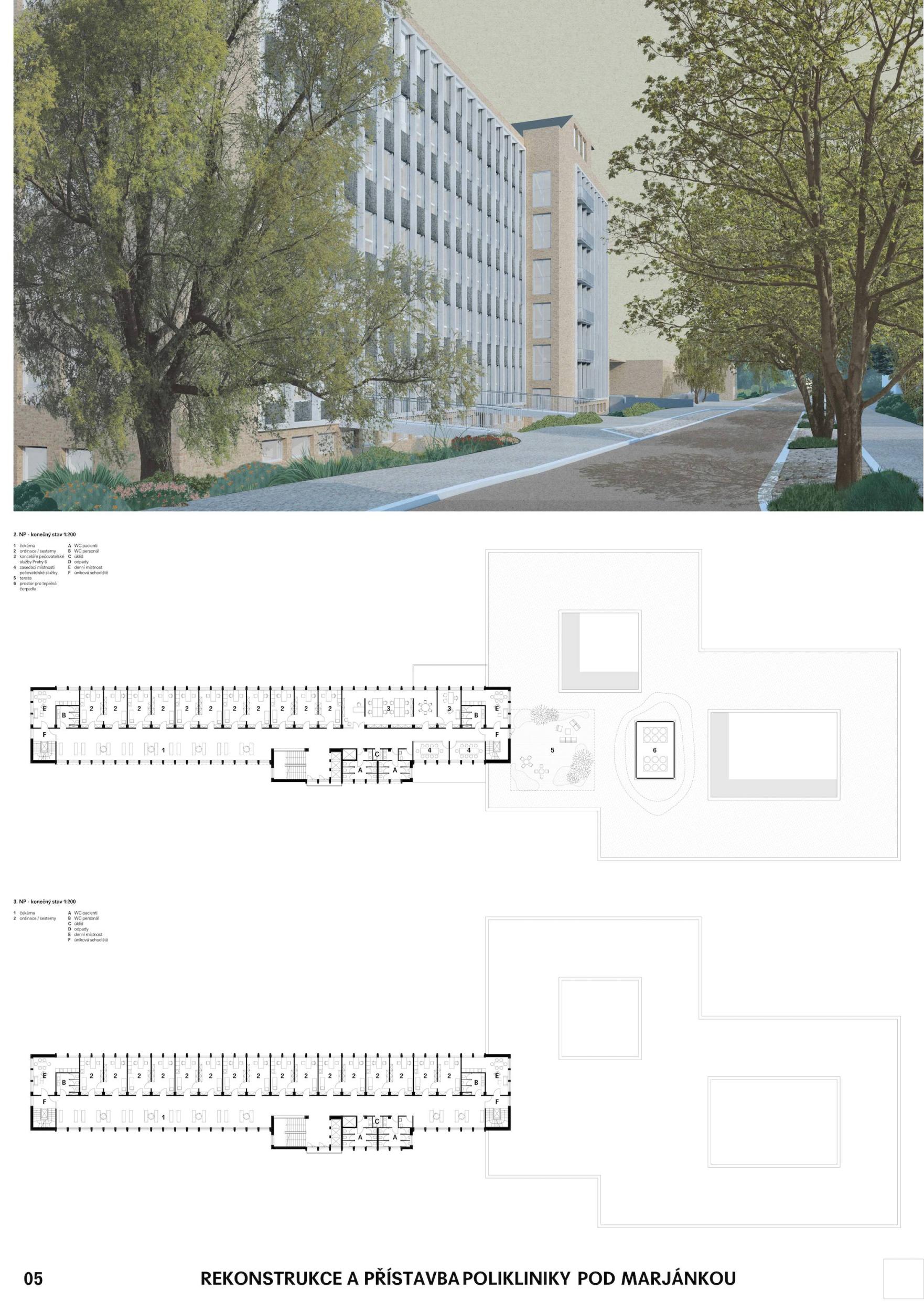 The design provides a compact, sophisticated solution that is space-saving yet operationally comfortable and logical. The clean longitudinal massing of the addition with its prominent strip windows is a harmonious contemporary addition to the F.R. Underground building. The use of ceramic tile in a complementary color scheme is humble and semantic to the existing building. At the same time, the design represents a sustainable façade concept that can respond flexibly to changes in the internal layout and adequately compensate for the challenges of climate change. The preferred and transparent solution is offering internal atriums to which waiting rooms are oriented. At the same time, the proposal presents a sophisticated reflection on the layout of the reconstructed part. In terms of design, it is a feasible reconstruction, which is well developed and detailed in the proposal. The environmental concept of sustainable development, which is now a necessary parameter in the design of a civic building, shows the author's comprehensive approach.