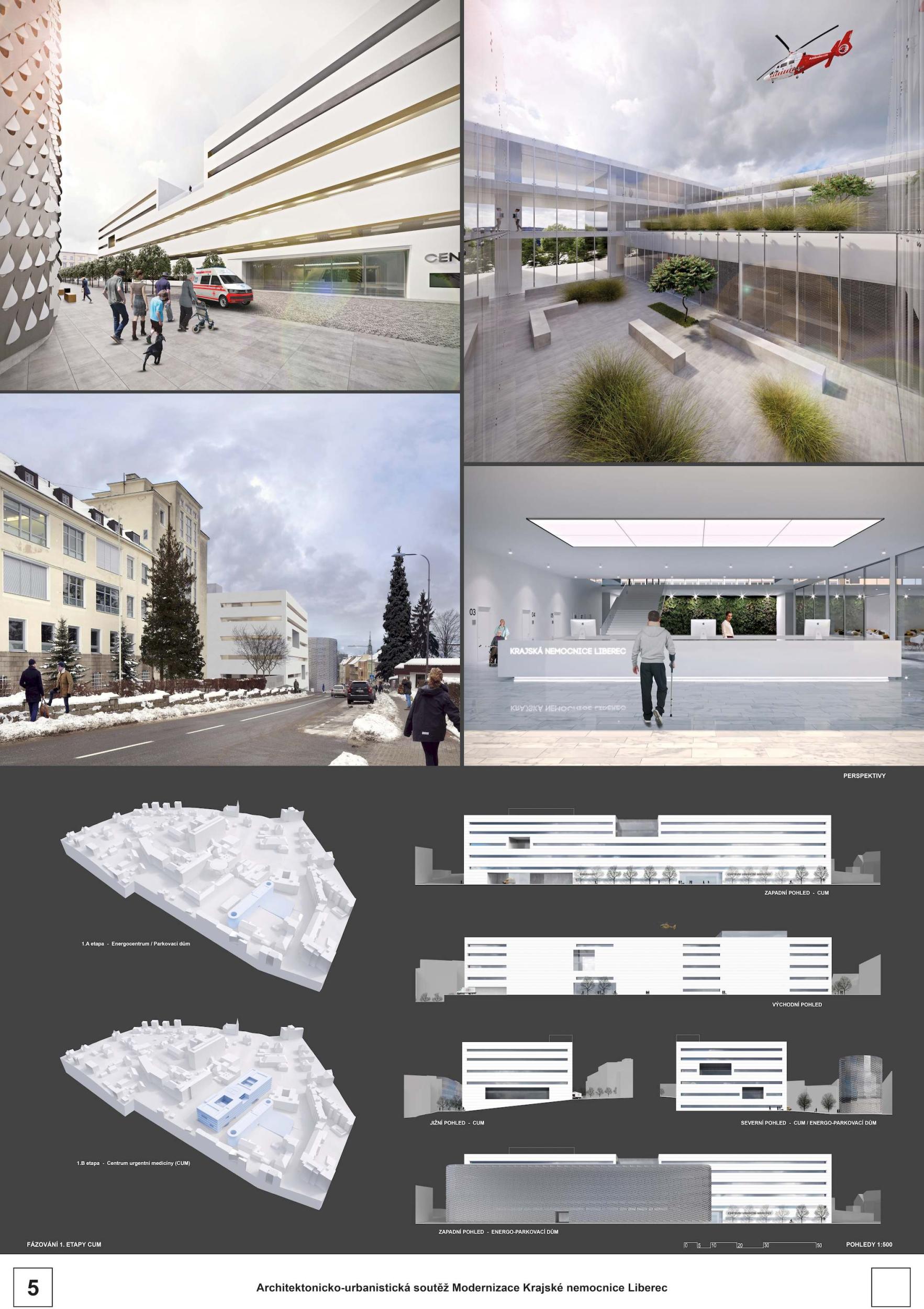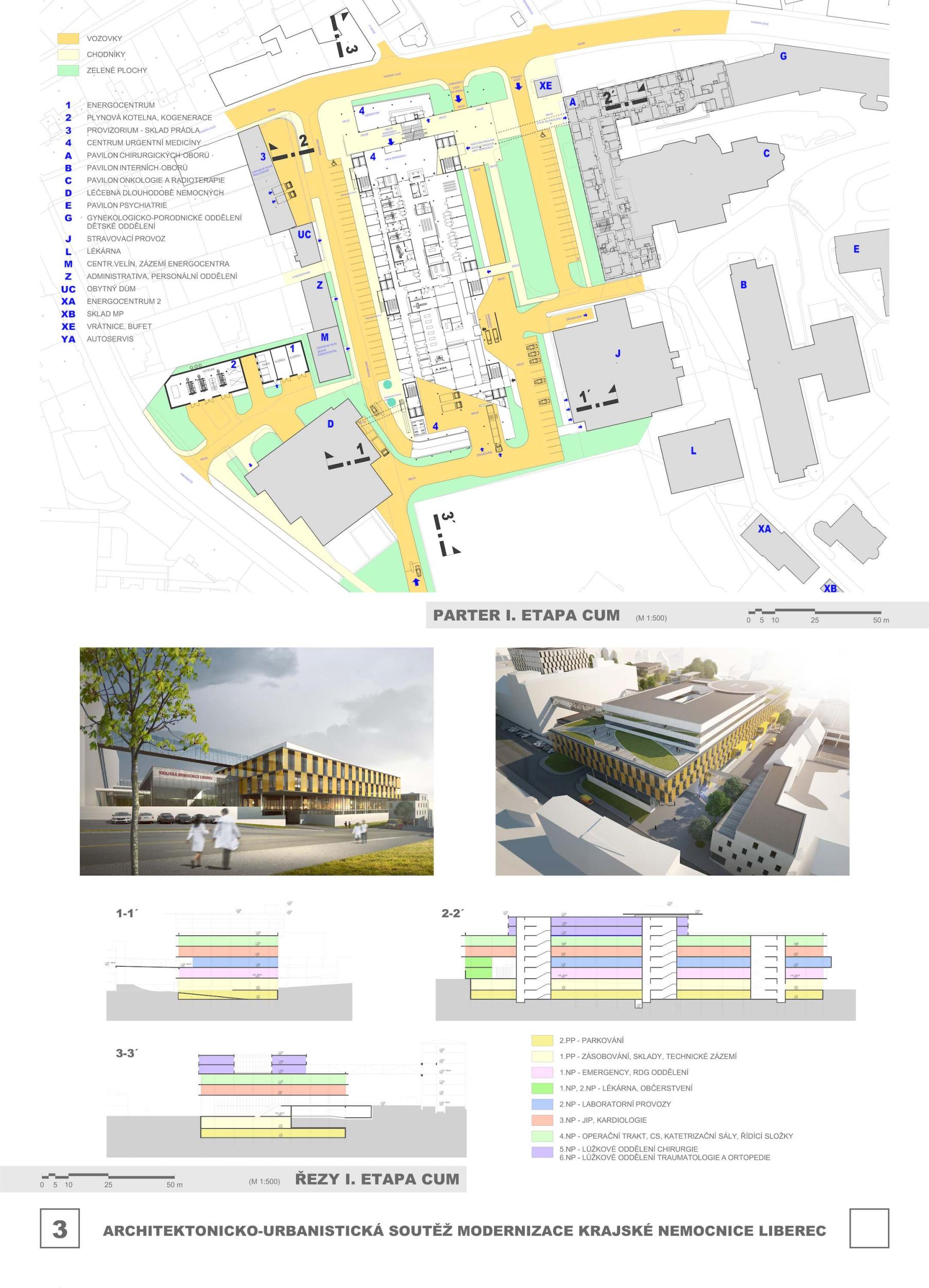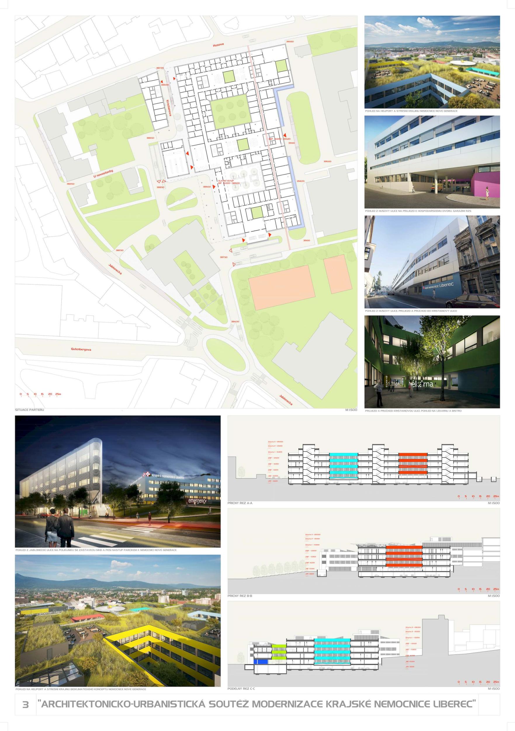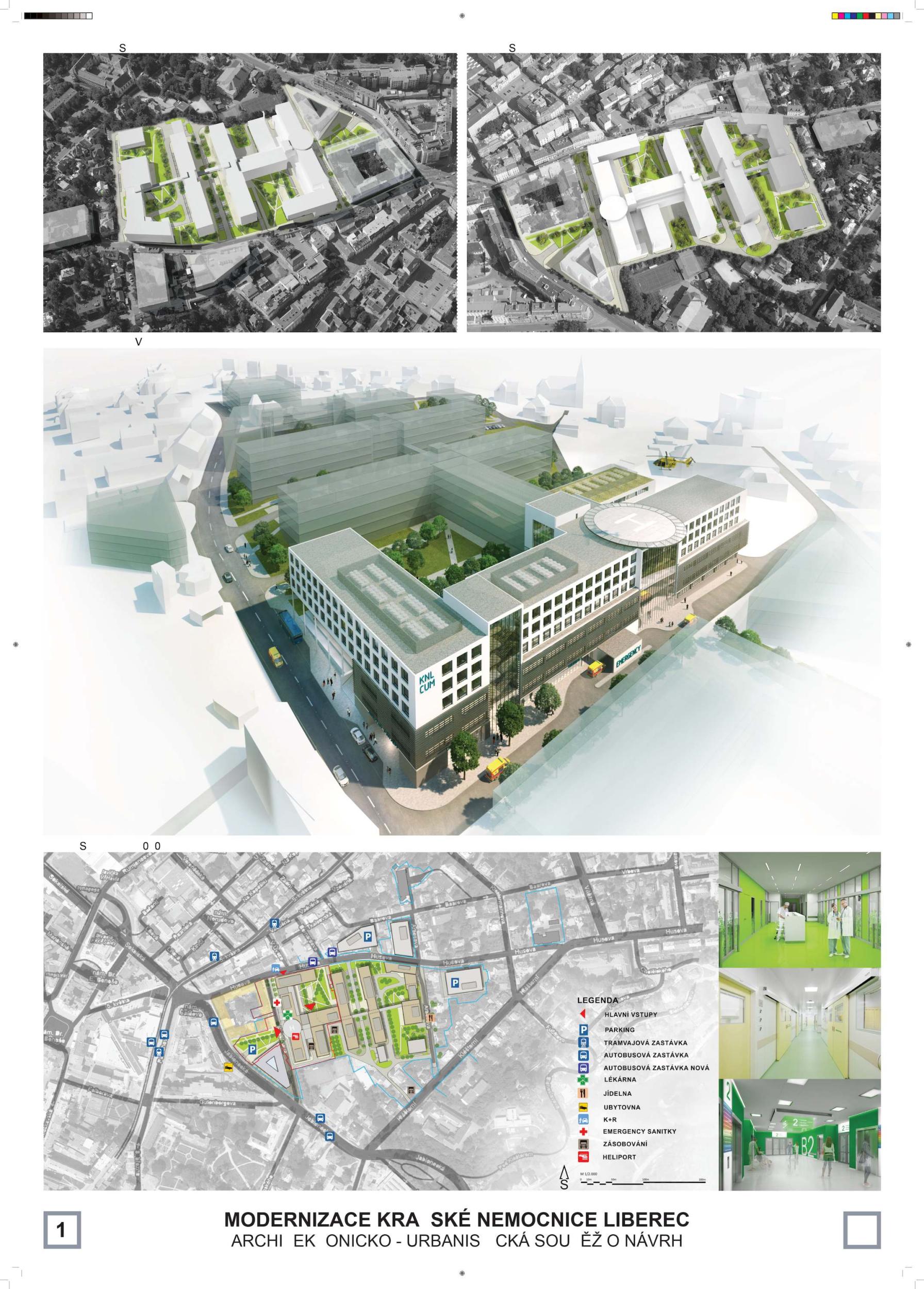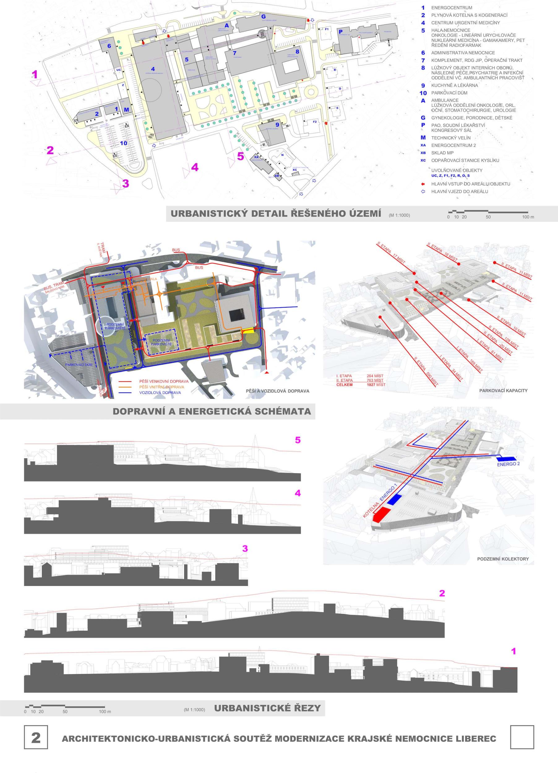 In the opinion of the jury, it is an urbanistically interesting city-forming proposal that would suitably complement the existing Liberec structure. The solution of transport serviceability and ensuring the hospital's operability during the implementation of the first phase was also evaluated positively. However, the jury considered that the operational and medical functionality of the submitted solution was insufficient, as well as the communication between the individual facilities. In the opinion of the jury, the low-capacity design could be modified, but at the cost of a significant increase in financial costs.