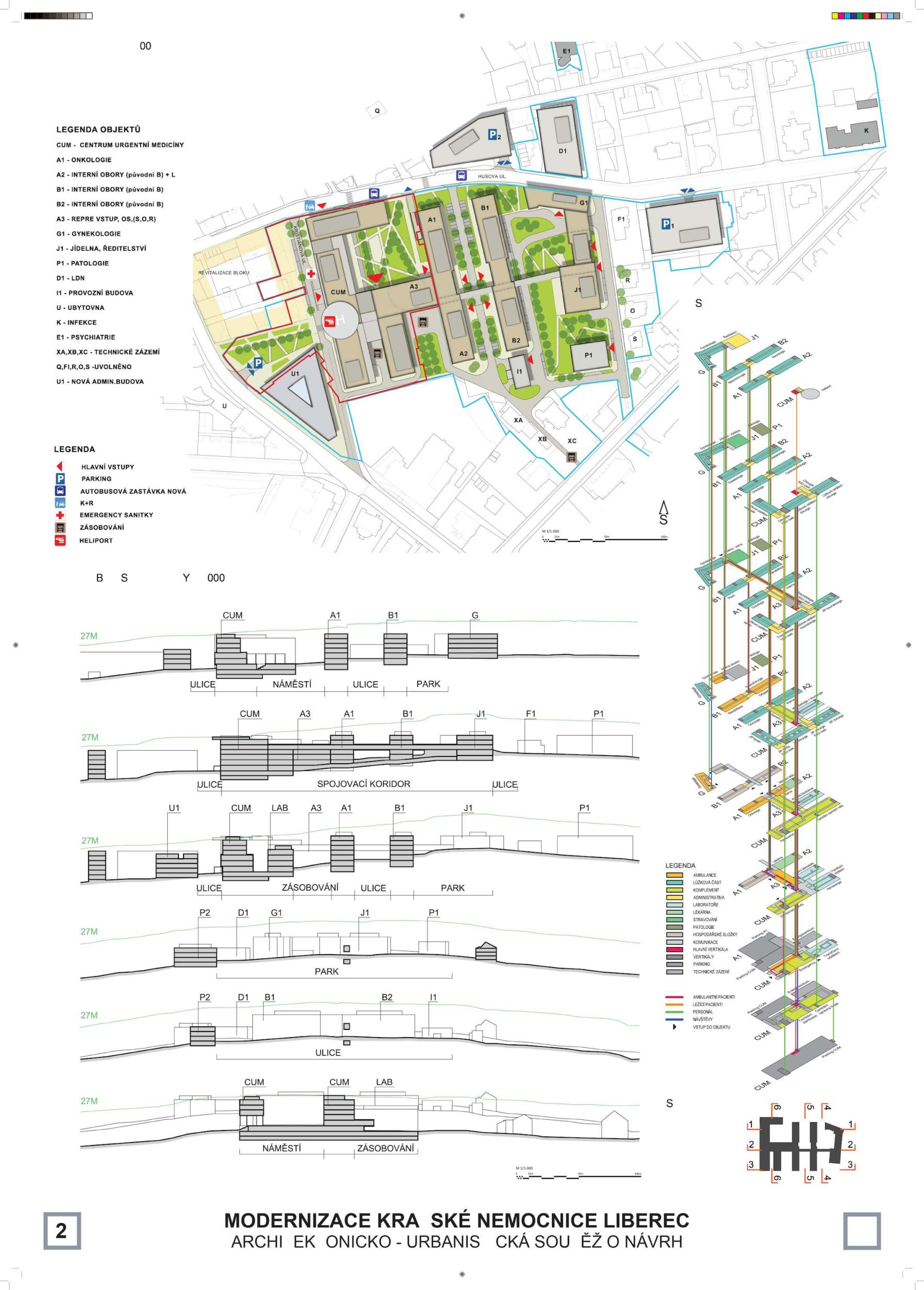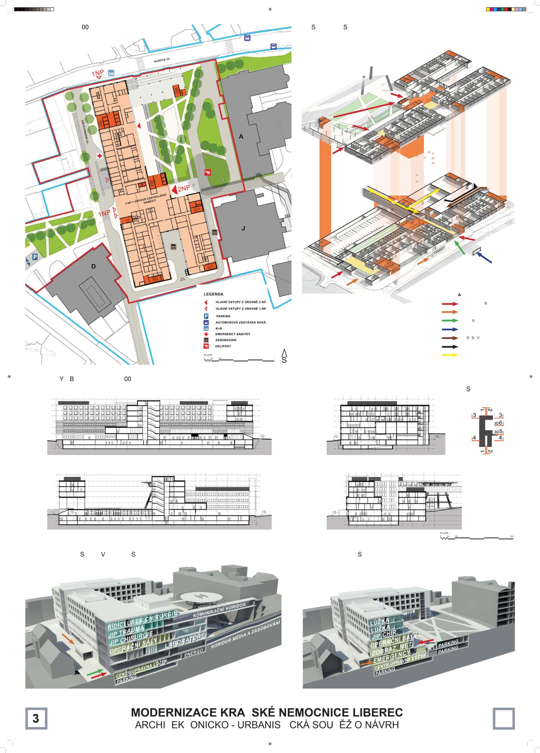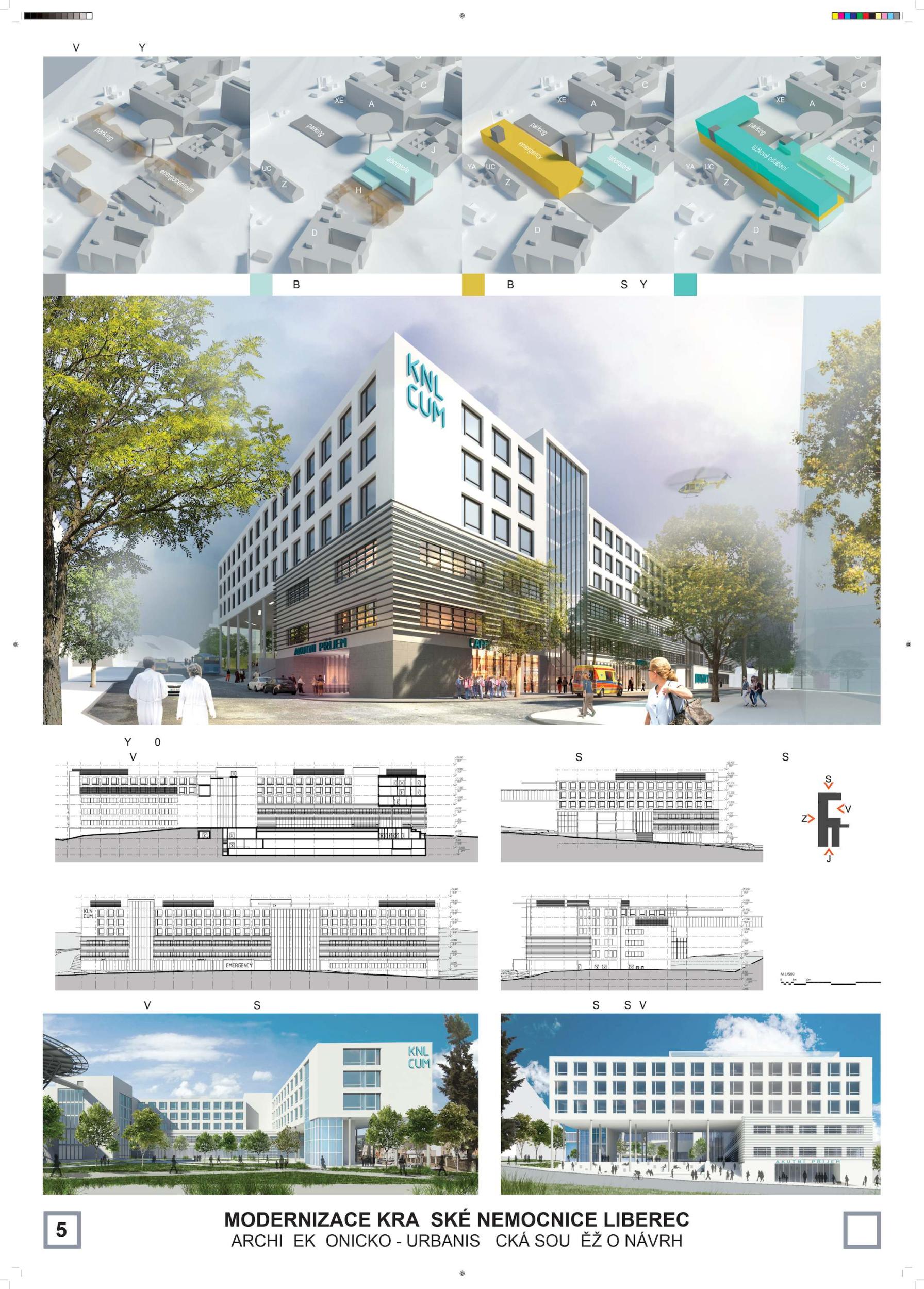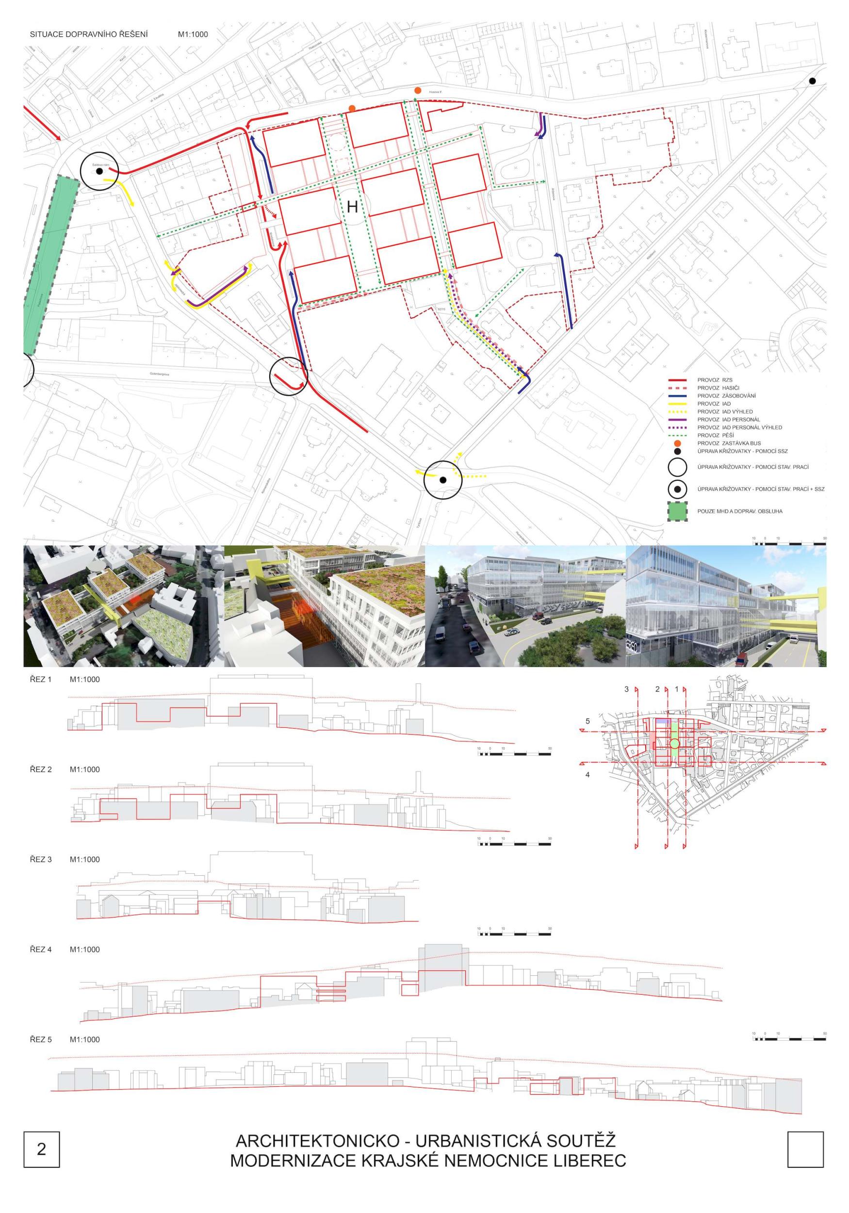 A modern hospital is not a building, but a living organism that is constantly evolving. A hospital has a heart, an emergency room that pulsates regardless of day or night. It has a main artery that supplies the hospital, carries energy and distributes it throughout the campus. It has a backbone that is a pathway for patients and staff. In the design, the heart, the emergency reception, is located in the outermost longitudinal building. It is gradually joined by other facilities connected by a new spine running down the centre of the hospital. The buildings are linked to each other as two inverted ridges, connected by a central axis to the semi-enclosed outermost blocks. The main entrance is designed from a square square with greenery. For the flow of traffic, the arrival of ambulances is designed separately from the supply and visitor cars, which are directed to the underground garages. The hospital is a living, evolving organism whose function can be influenced by a clear concept of logistic flows. The new Regional Hospital Liberec has the prerequisite to be a functional unit and at the same time a pleasant environment for patients and employees.