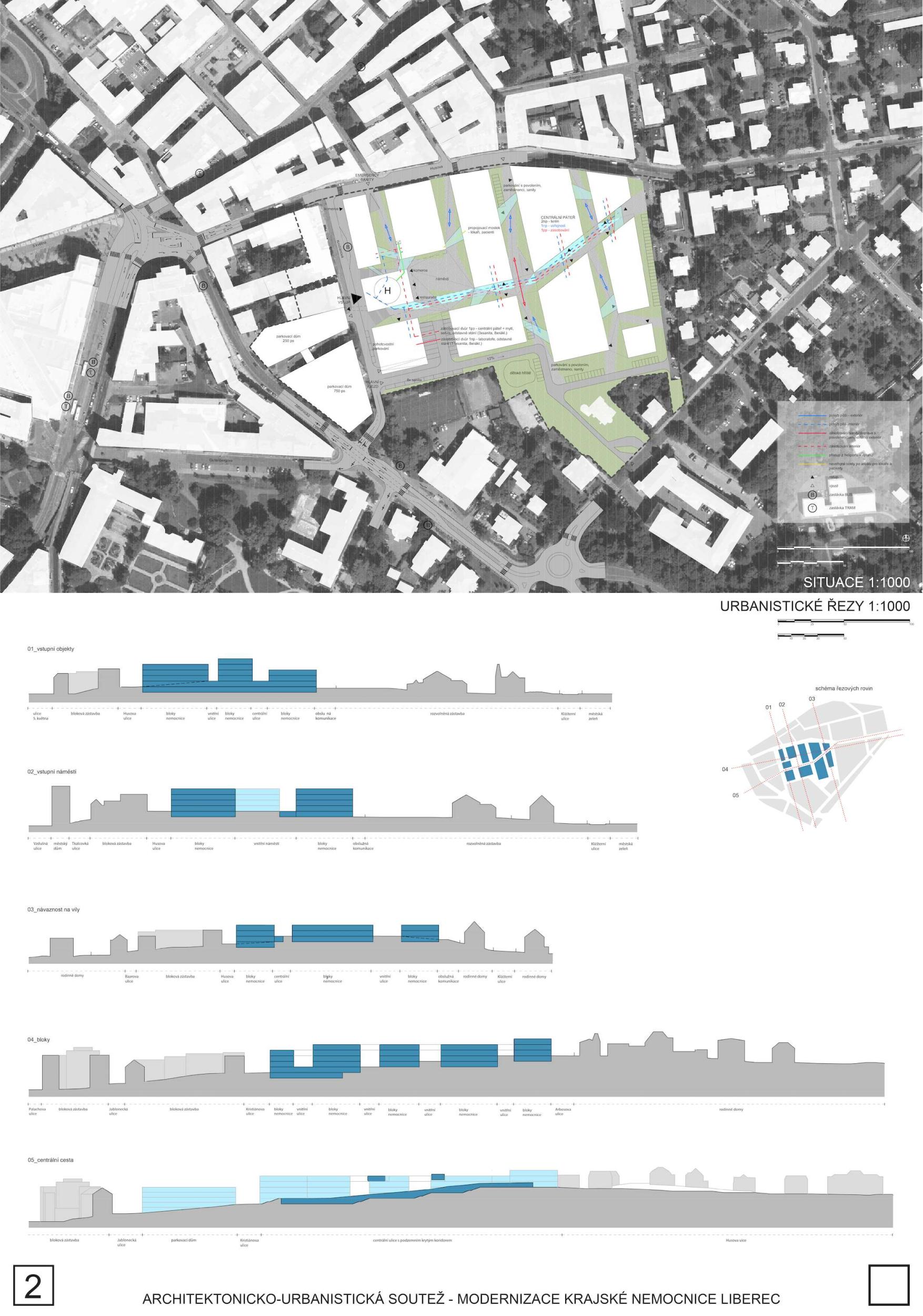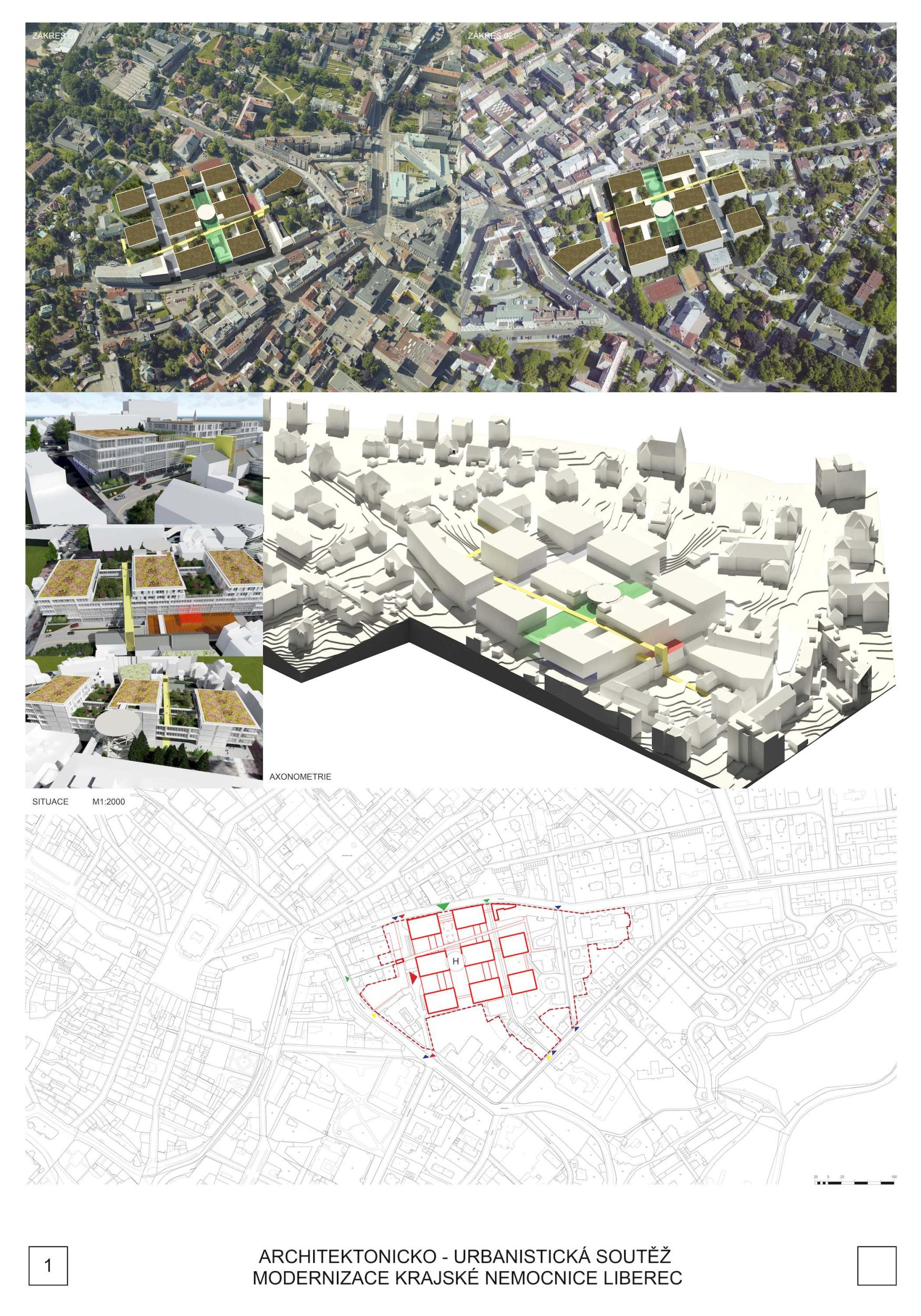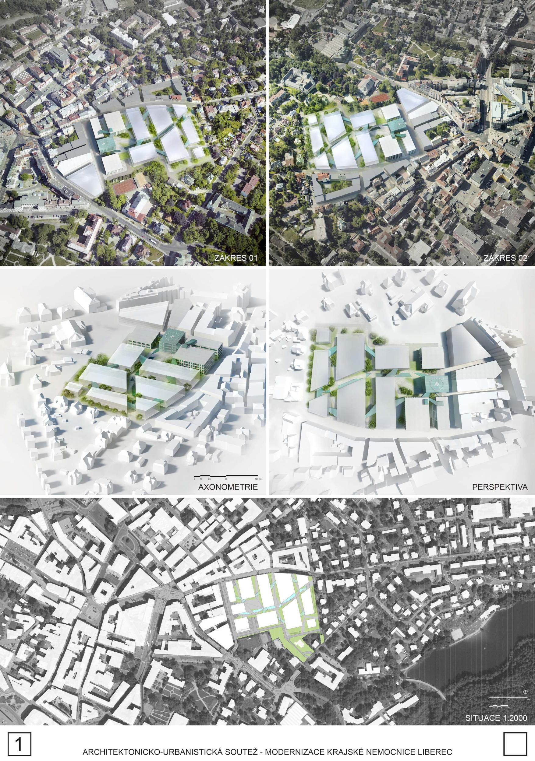 A hospital can be a distinctive element in its scale and structure that more or less disrupts the organism of the city - and given its importance, this disruption is probably defensible. But the hospital can also be in harmony with the city organism and even support it and stimulate its proper development. We solve the problem of different scale and different structure by treating the individual buildings of the hospital not as houses, but as city blocks, which we shape and position to relate to the surrounding urban structure. Between the blocks, clearly defined spaces are created that are compositionally and spatially related to the surrounding streets. This solution creates familiar and functioning archetypes (streets, squares) in the area, completes the surrounding incomplete street spaces, reinforces their proper functioning and initiates future completions of the surrounding broken blocks. We consider compactness and intensification without creating undefined areas as the basic principles of sustainable urban development.