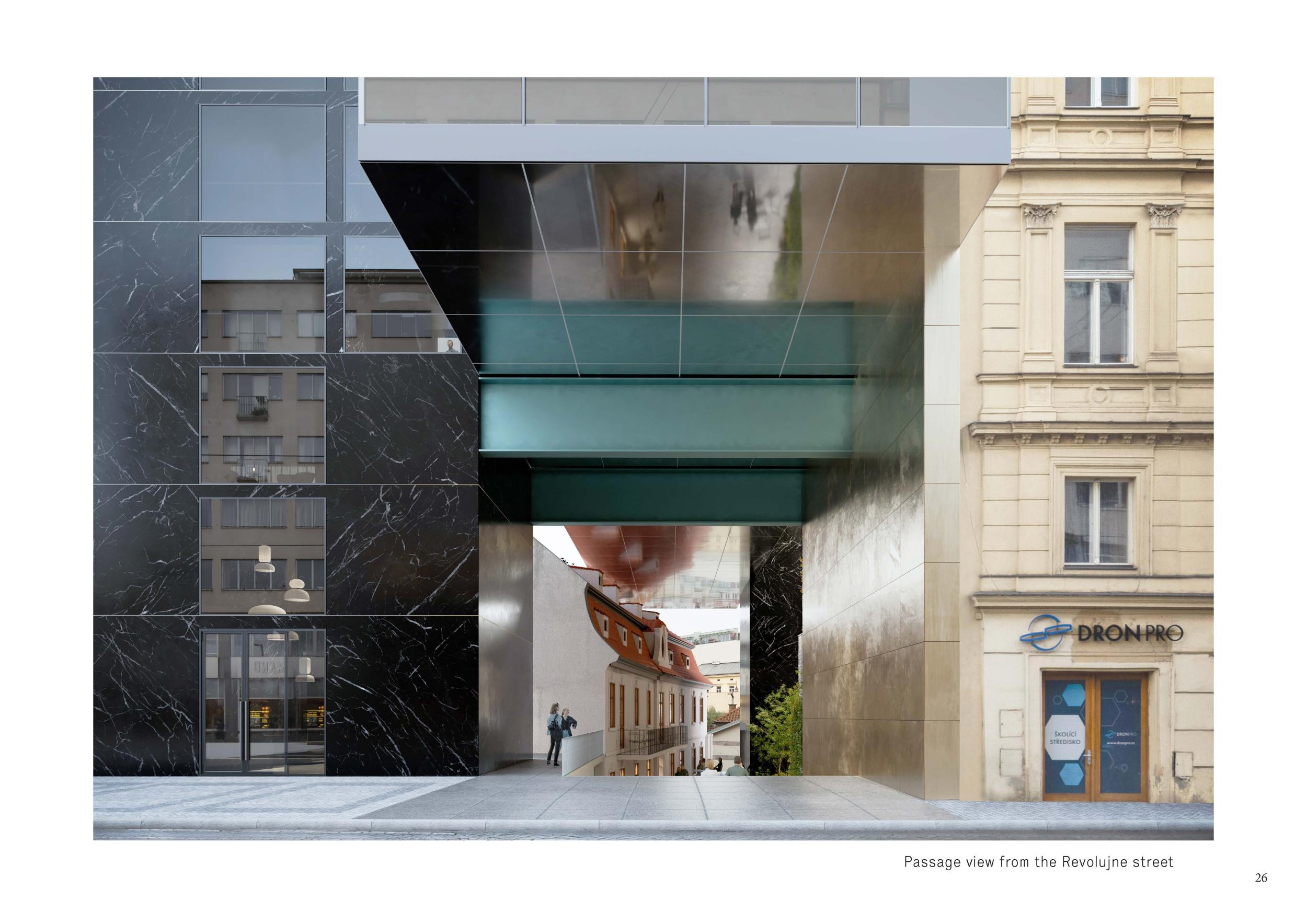 The overview of developments confirms that addressing this challenge requires an innovative approach: a city gate which creates this bridgehead, should offer a harmony between exclusivity and iconicity, airiness and atmosphericity of a new architecture that rises respectfully above the existing historie urban structure. New qualities of this environment are supported by the evaluation of the parter as a public space of ground floor and by enriching the "hundred towers" city of Prague with a new vertical chord. The building itself should provide a series of adventures for its users: a passage in the ground floor in which resonates historical memory in confrontation with the spirit of the new age, a labyrinth of vertical and horizontal connections in the polarity between the public and private spheres, and last but not least attractive views of Letná and the rooftop landscape of the historie heart of Prague, culminating in the "Sky-lounge" on the roof terrace. Ali of this is supported by a sophisticated structural system, the wide flexibility of provided apartments including duplexes and horizontal "villas", the diverse texture of the noble materials used in the exteriors and interiors and the imaginative lighting technology which is accentuating the spatial values of the entire complex and its historical surroundings. In particular, the proposal pursues the following goals: 1 - to find a proper balance between exclusivity and iconity - the project aims to be REMARKABLE / 2 - to focus on the quality of common spaces - especially the quality of the vibrant passage and the observation roof terrace with 360 degree view of the landscape and the city / 3 - to understand the living typology as horizontal villas - spaces with high quality views and maximal interior flexibility / 4 - to make the project remarkable not just through its design, but (and maybe more importantly) through experience of space and views for the inhabitants and casual visitors. By these means, it has the ambition to become a worthy counterpart to the MERKUR Palace and an icon of the new Prague - its tradition, innovation and fascination - on the threshold of the third millennium. ln proposal the emphasis is also placed on the opening and accessibility of the ground floor with additional functions in conjunction with with the existing baroque substance. This follows the tradition of historical and modern passages of Prague, in order to place the building in a wider urban context. The figure of the apartment building, unified into a single floating mass above the passageway, emphasizes the distinction between public and private sphere, offers lucrative views on the central area of Prague and artistically attractive and light effects of the material texture by the rendering of the shell. The layout of the apartments offers maximum flexibility, taking into account the specificity of the user's needs. These princi ples are intended to represent the culture and technological and functional standards of the twenty-first century."