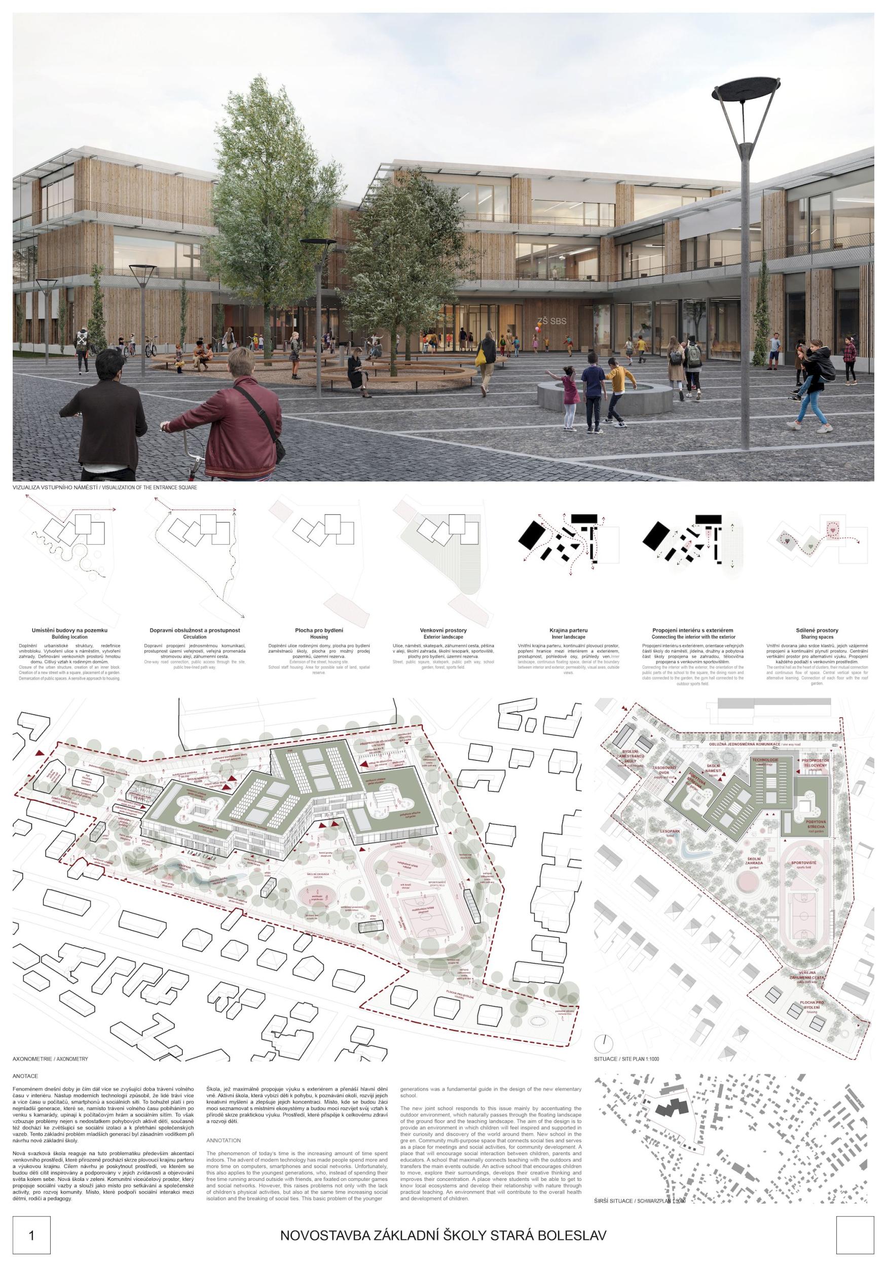 The phenomenon of today‘s time is the increasing amount of time spent indoors. The advent of modern technology has made people spend more and more time on computers, smartphones and social networks. Unfortunately, this also applies to the youngest generations, who, instead of spending their free time running around outside with friends, are fixated on computer games and social networks. However, this raises problems not only with the lack of children‘s physical activities, but also at the same time increasing social isolation and the breaking of social ties. This basic problem of the younger generations was a fundamental guide in the design of the new elementary school. The new joint school responds to this issue mainly by accentuating the outdoor environment, which naturally passes through the floating landscape of the ground floor and the teaching landscape. The aim of the design is to provide an environment in which children will feel inspired and supported in their curiosity and discovery of the world around them. New school in the gre en. Community multi-purpose space that connects social ties and serves as a place for meetings and social activities, for community development. A place that will encourage social interaction between children, parents and educators. A school that maximally connects teaching with the outdoors and transfers the main events outside. An active school that encourages children to move, explore their surroundings, develops their creative thinking and improves their concentration. A place where students will be able to get to know local ecosystems and develop their relationship with nature through practical teaching. An environment that will contribute to the overall health and development of children.