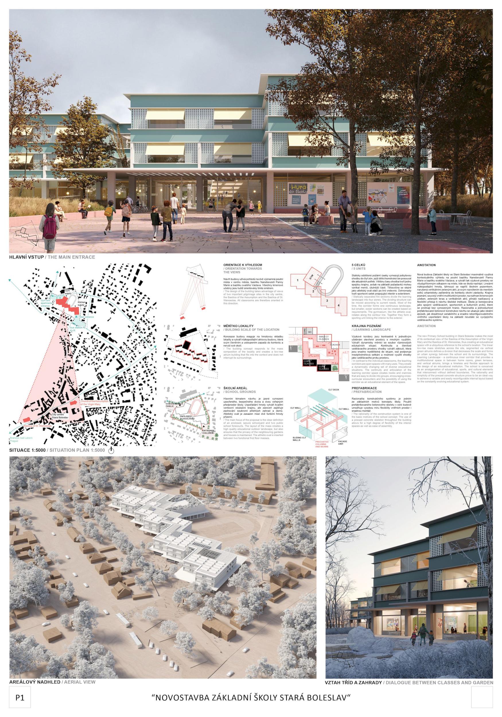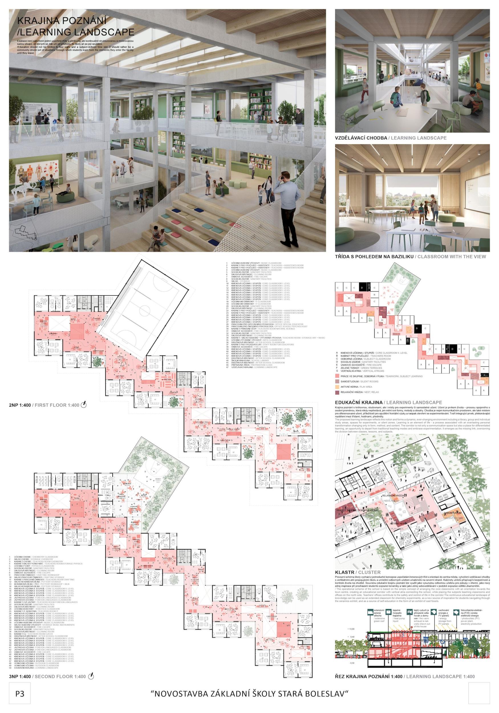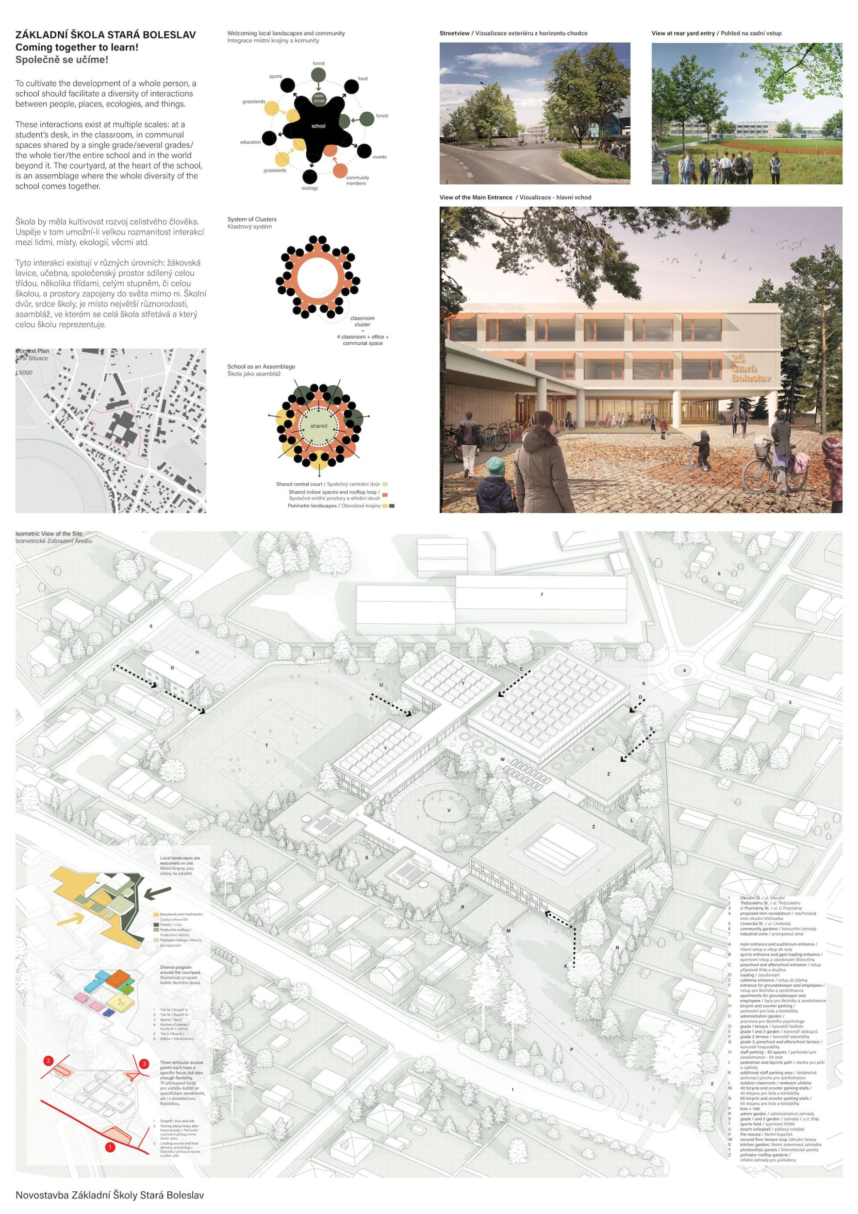 The new Primary School building in Stará Boleslav makes the most of its contextual view of the Basilica of the Assumption of the Virgin Mary and the Basilica of St. Wenceslas, thus creating an educational space with a ubiquitous reference to the school’s location. The linear low-rise mass stretches across the site, segmented via vertical green atriums defines a division that decreases the scale and forms an urban synergy between the school and its surroundings. The Learning Landscape - a continuous inner corridor that provides a multifunctional space in between home rooms, green terraces, and vertical atriums, brings a timeless and flexible approach to the design of an educational institution. The school is conceived as an amalgamation of educational, sports, and cultural elements that interconnect without defined boundaries. The rationality and simplicity of the precast concrete structure prove to be an ideal way to achieve a variable and easily reconfigurable internal layout based on the constantly evolving educational system.