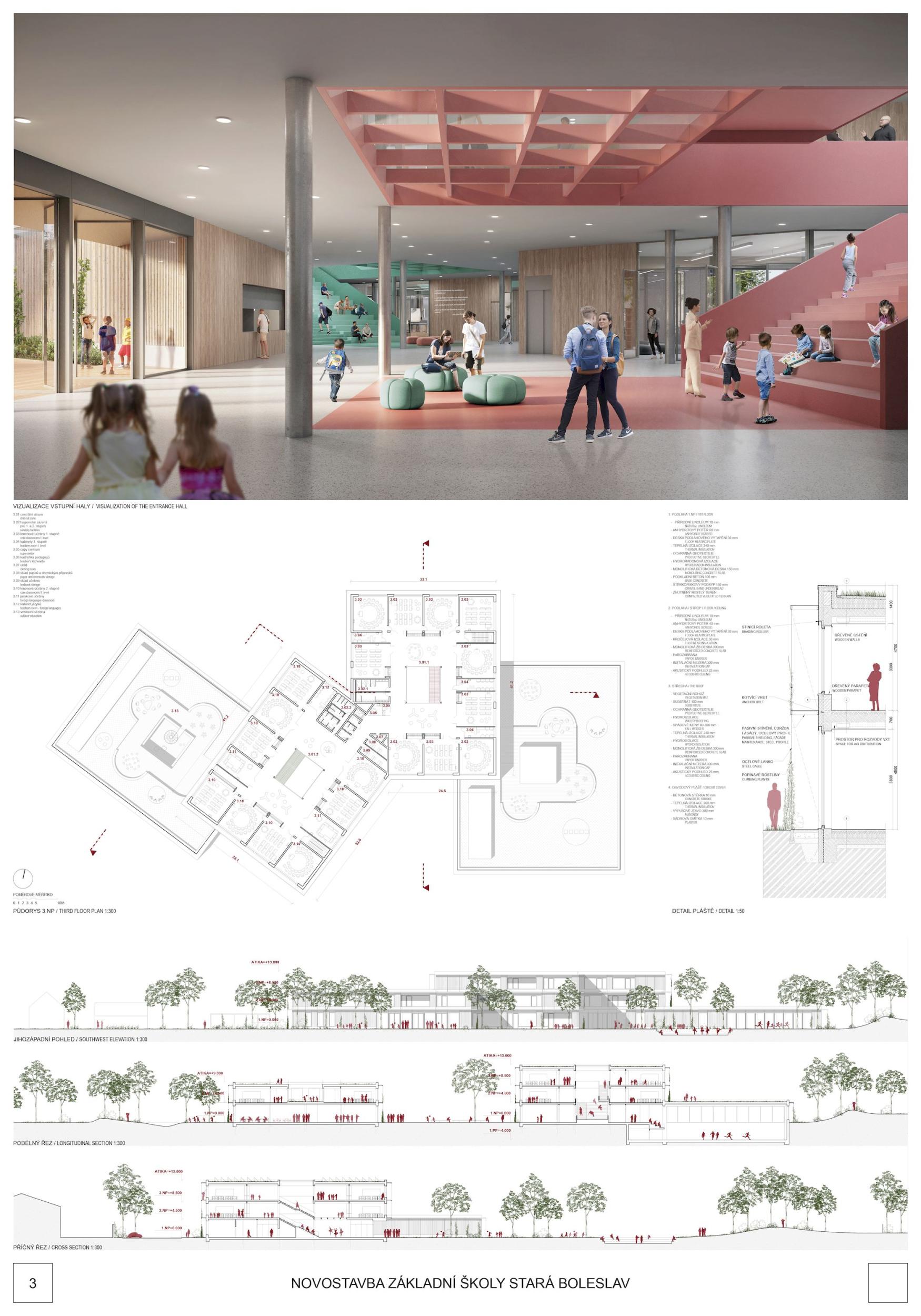 We propose a new primary school that will be a major asset to the town - throughout the weekday in its basic educational function, but also in leisure time as a centre for sport, recreation, social and cultural activities and supplementary education. The extensive building program is divided into three compact volumes that correspond to the functional zoning and will fit better into the surrounding urban fabric of the city. The house will be energy-efficient, constructed of prefabricated timber, which will result in a pleasant indoor environment, significant investment savings and environmental viability of the development. The new school will be set in a residential park environment, equipped with sports and recreational facilities.
