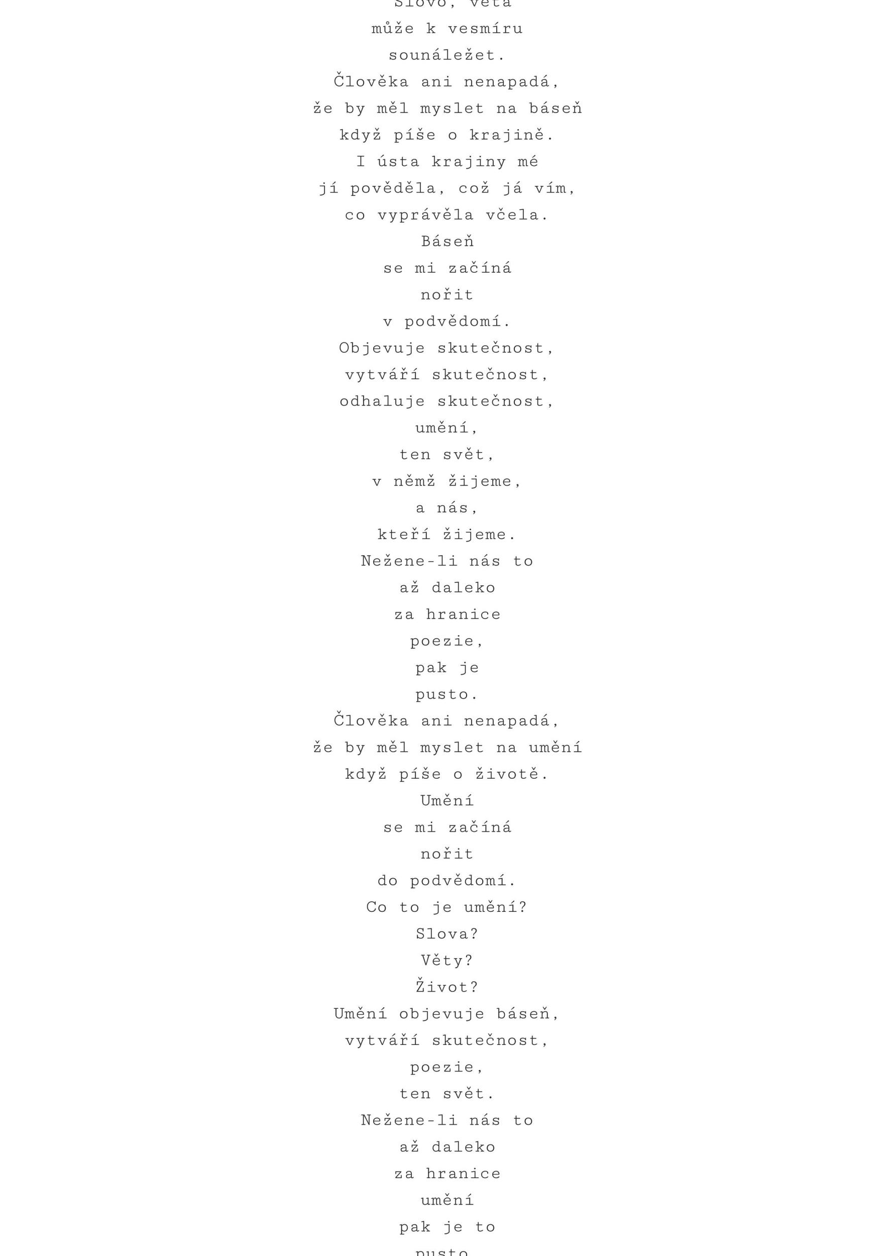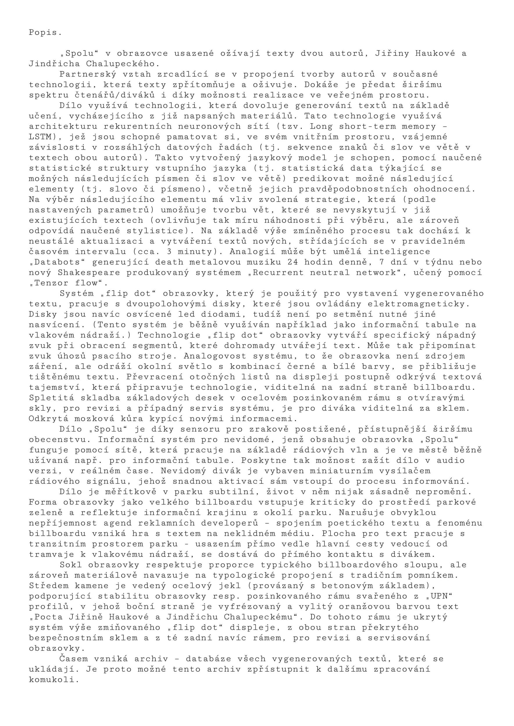 Pocta Jiřině Haukové a Jindřichu Chalupeckému je syntézou obou - “spolu”. Promlouvá pomocí nového hybridního billboardu. S využitím existující technologie, která dokáže skrz texty obou autorů vytvářet texty nové. Propojením těchto dvou osobností se rodí nekonečné variace inteligentního generovaného textu. Vymýšlí ho systém neuronové sítě, vyučovaný všemy dostupnými texty a archiváliemi, které po sobě oba autoři zanechali. Vzniká sloučení dvou přístupů k tvorbě psaného textu a vytváří tak novou nesmrtelnou poezii a myšlenky, které se stále aktualizují.