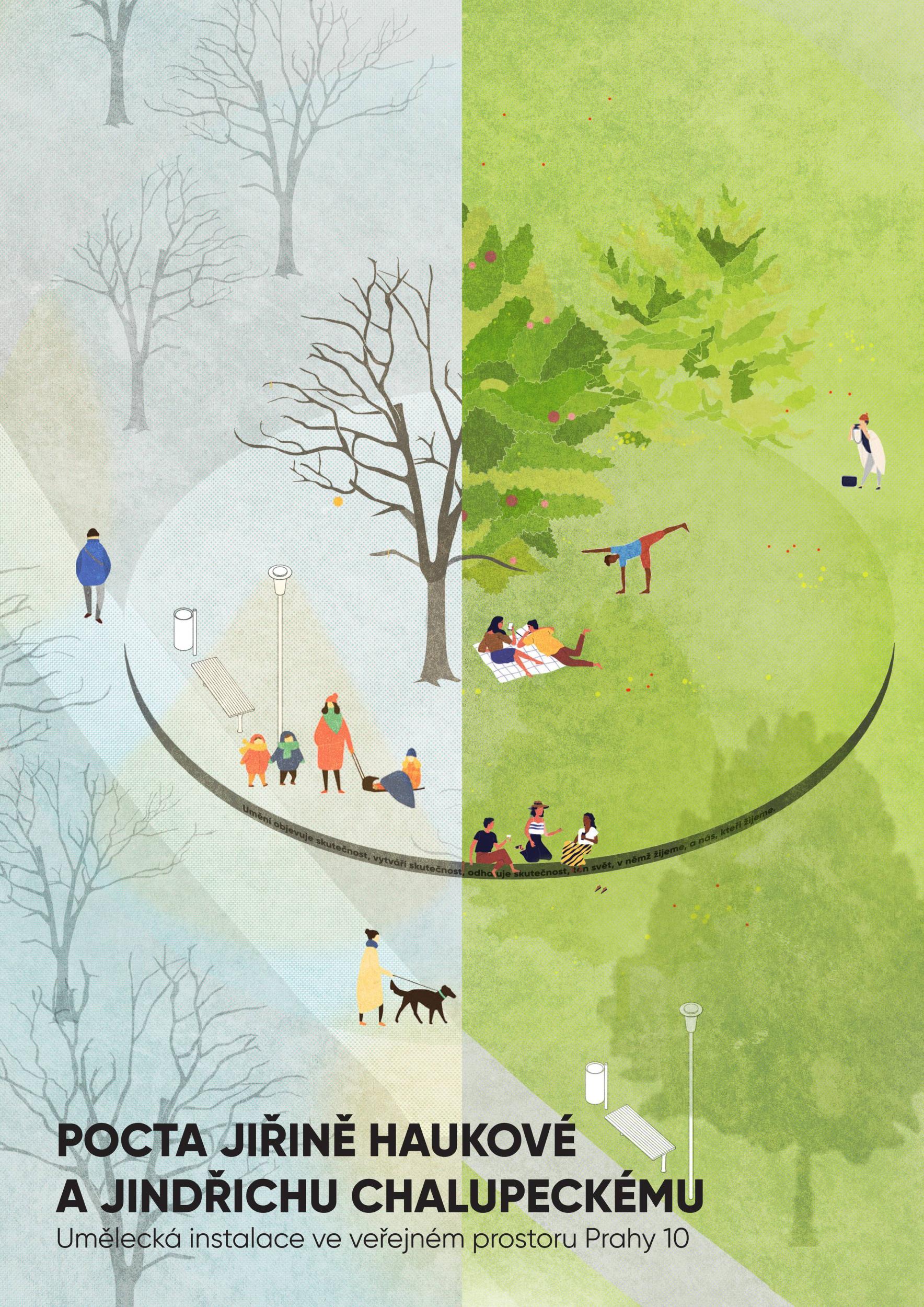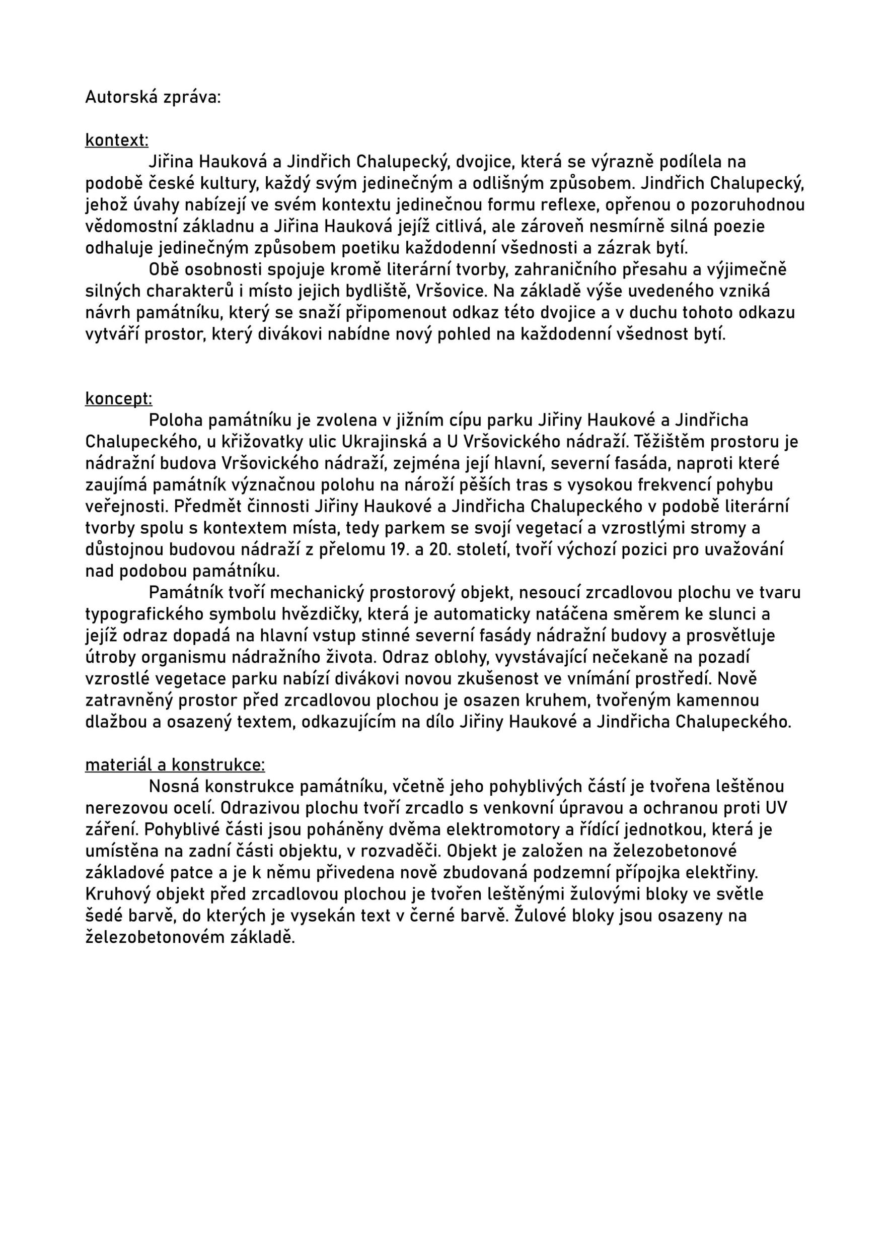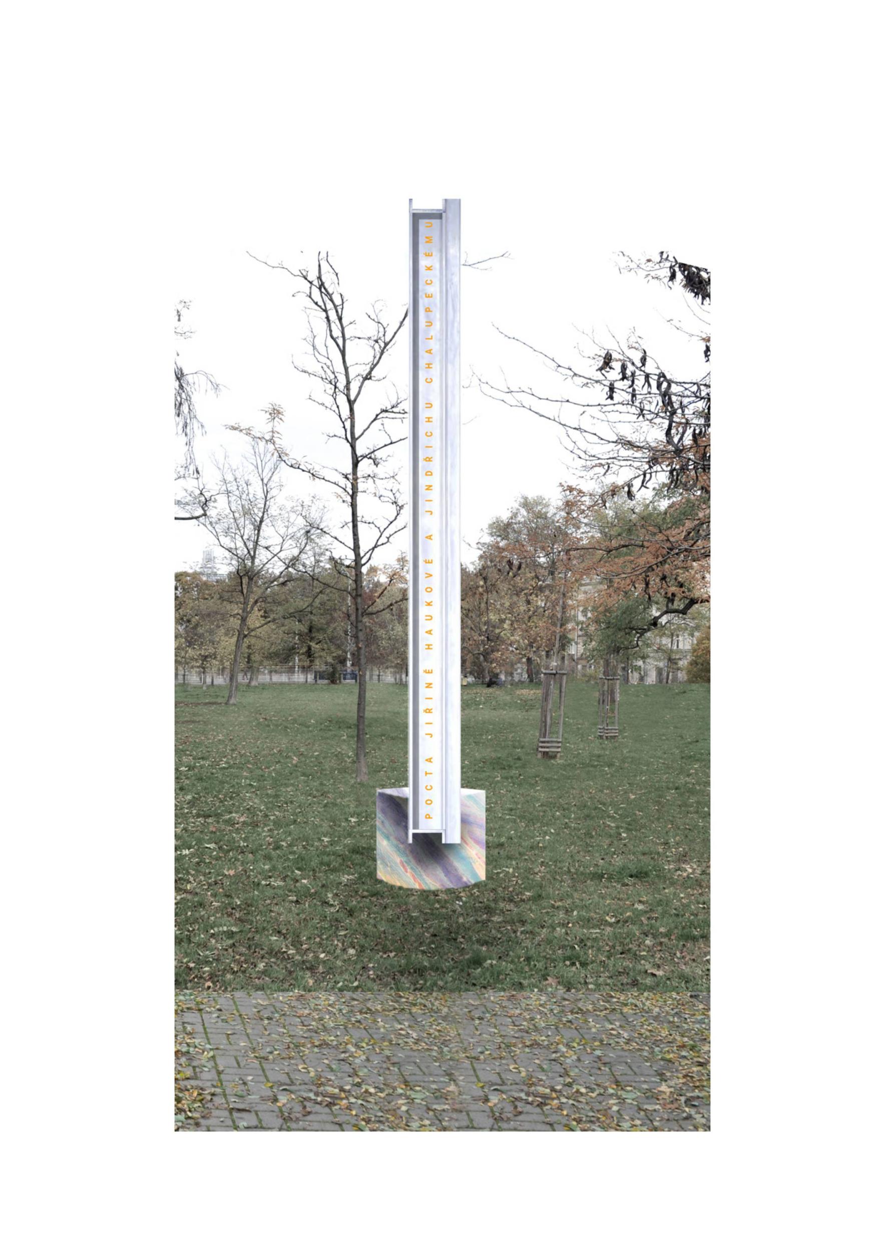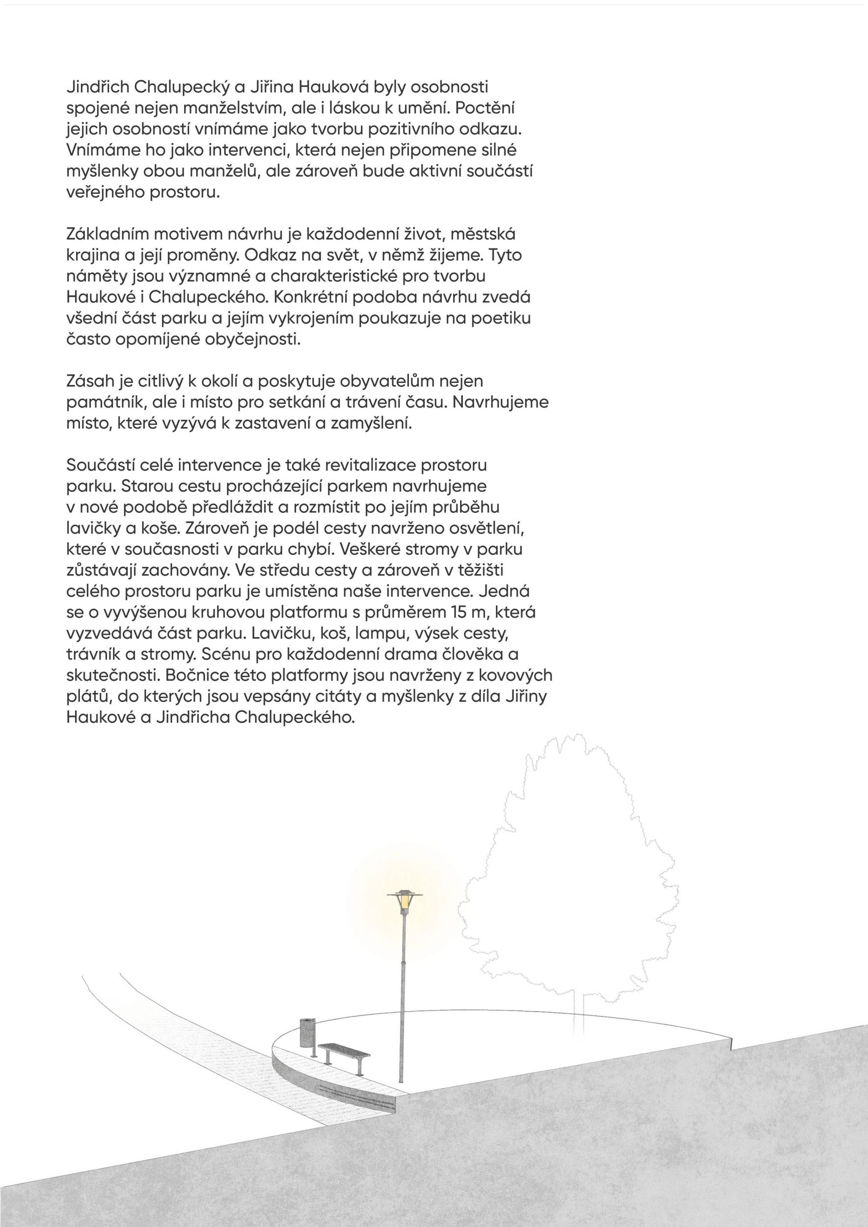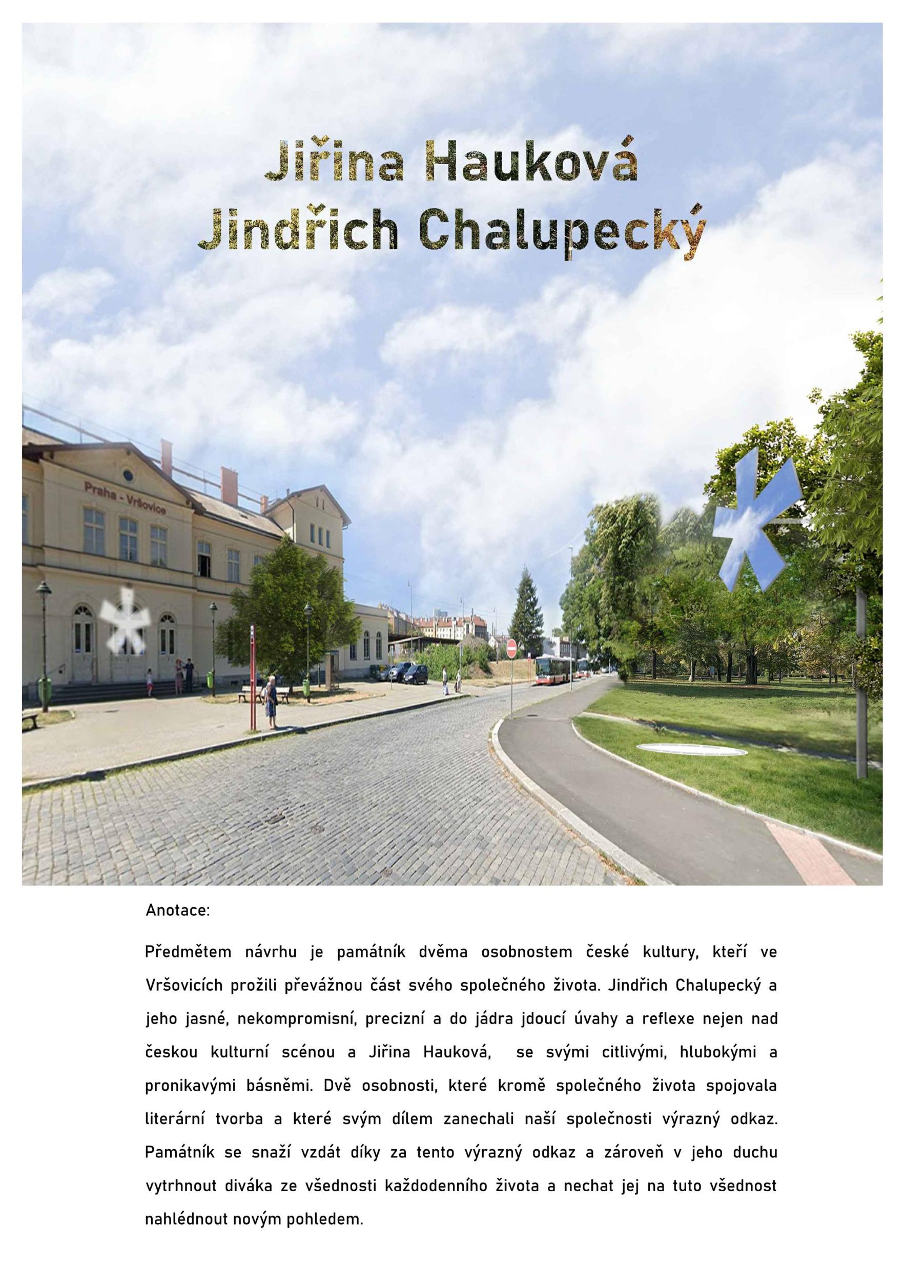 Předmětem návrhu je památník dvěma osobnostem české kultury, kteří ve Vršovicích prožili převážnou část svého společného života. Jindřich Chalupecký a jeho jasné, nekompromisní, precizní a do jádra jdoucí úvahy a reflexe nejen nad českou kulturní scénou a Jiřina Hauková, se svými citlivými, hlubokými a pronikavými básněmi. Dvě osobnosti, které kromě společného života spojovala literární tvorba a které svým dílem zanechali naší společnosti výrazný odkaz. Památník se snaží vzdát díky za tento výrazný odkaz a zároveň v jeho duchu vytrhnout diváka ze všednosti každodenního života a nechat jej na tuto všednost nahlédnout novým pohledem.