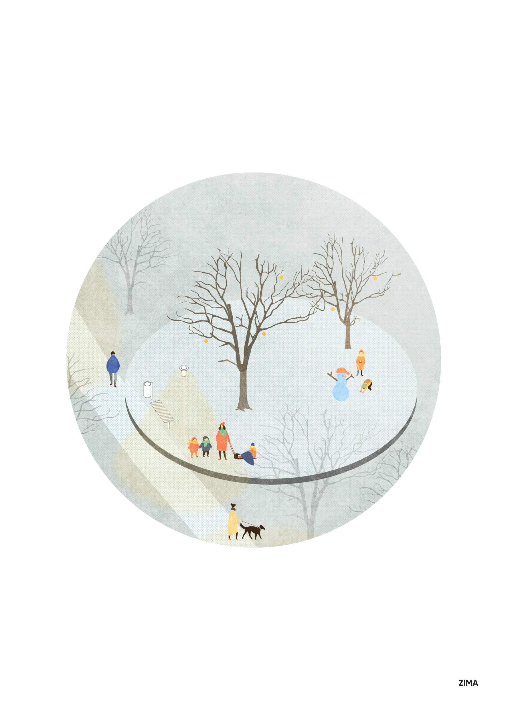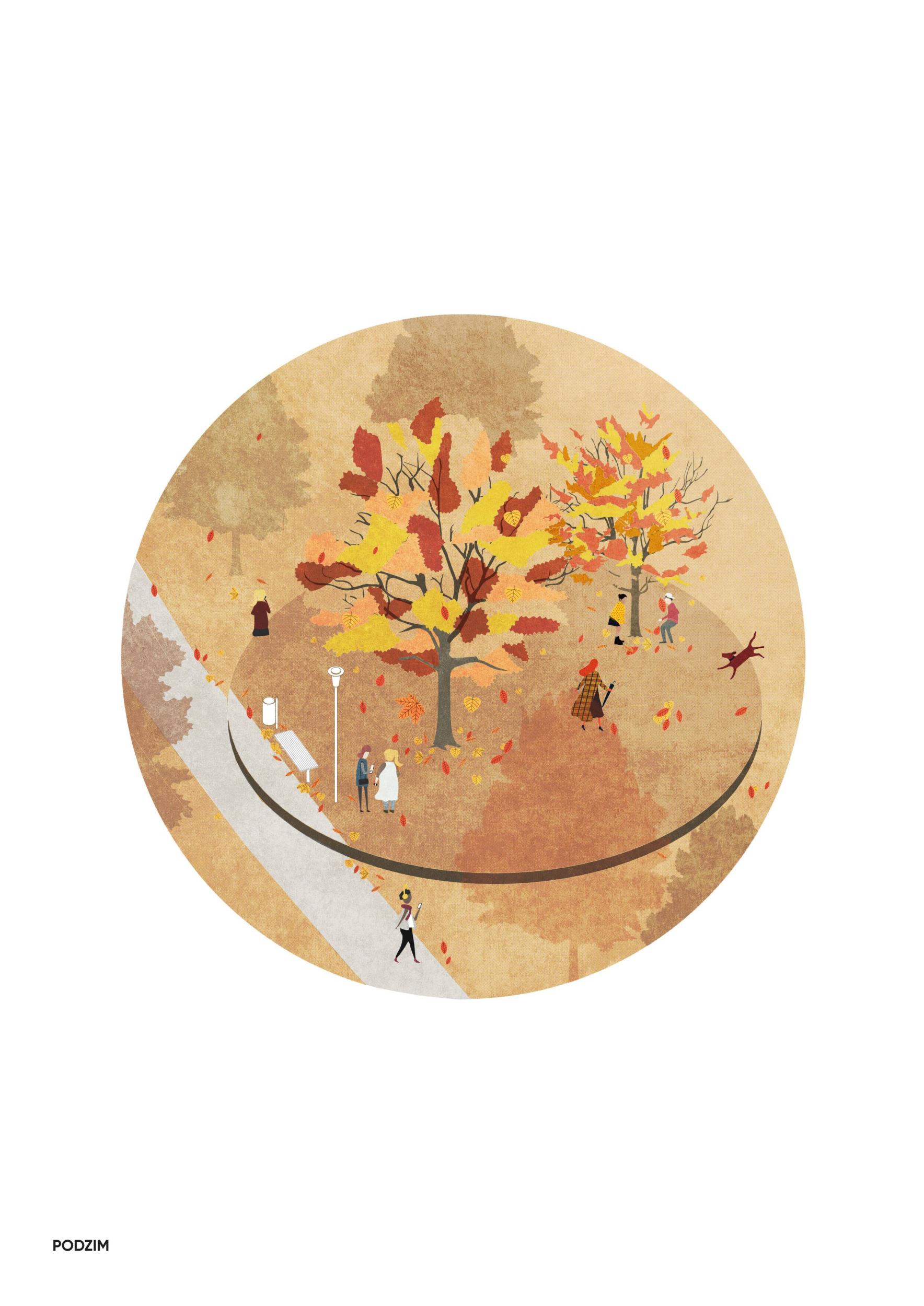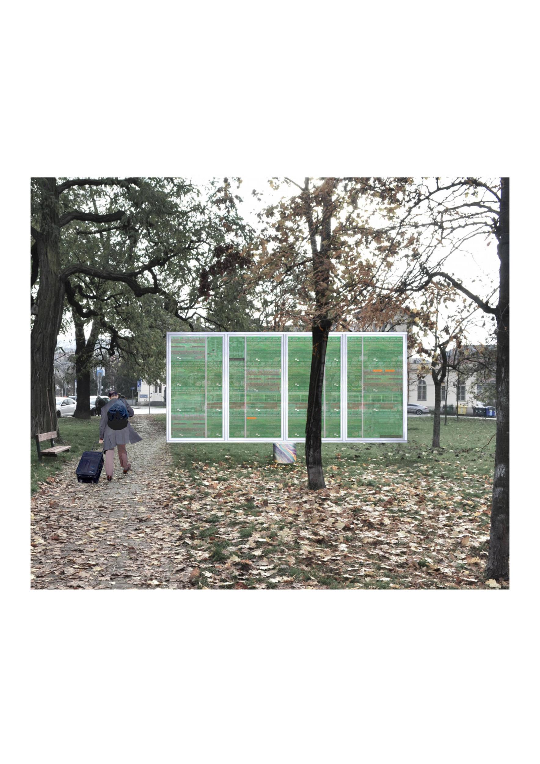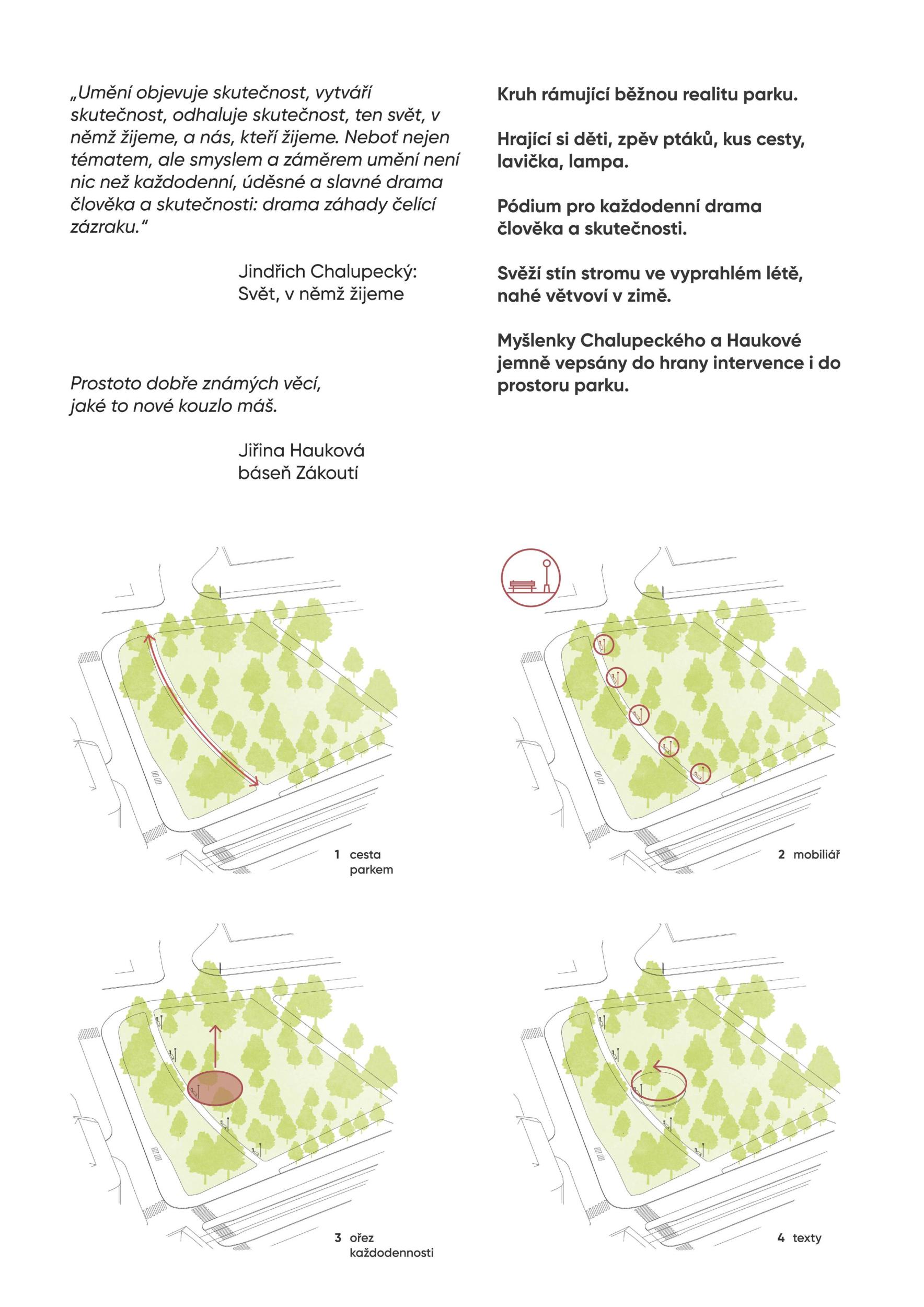 Kruh rámující běžnou realitu parku. Hrající si děti, zpěv ptáků, kus cesty, lavička, lampa. Pódium pro každodenní drama člověka a skutečnosti. Svěží stín stromu ve vyprahlém létě, nahé větvoví v zimě. Myšlenky Chalupeckého a Haukové jemně vepsány do hrany intervence i do prostoru parku.