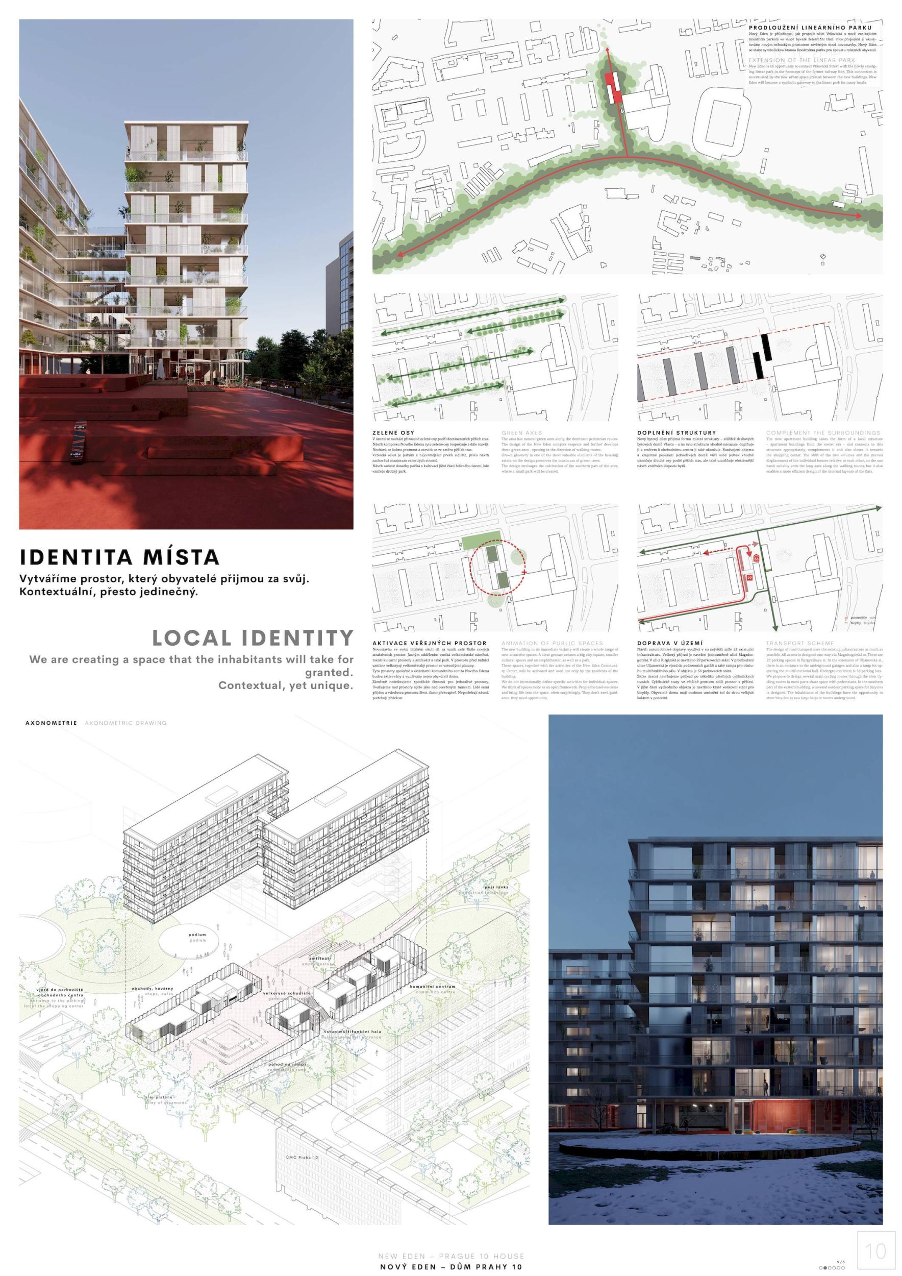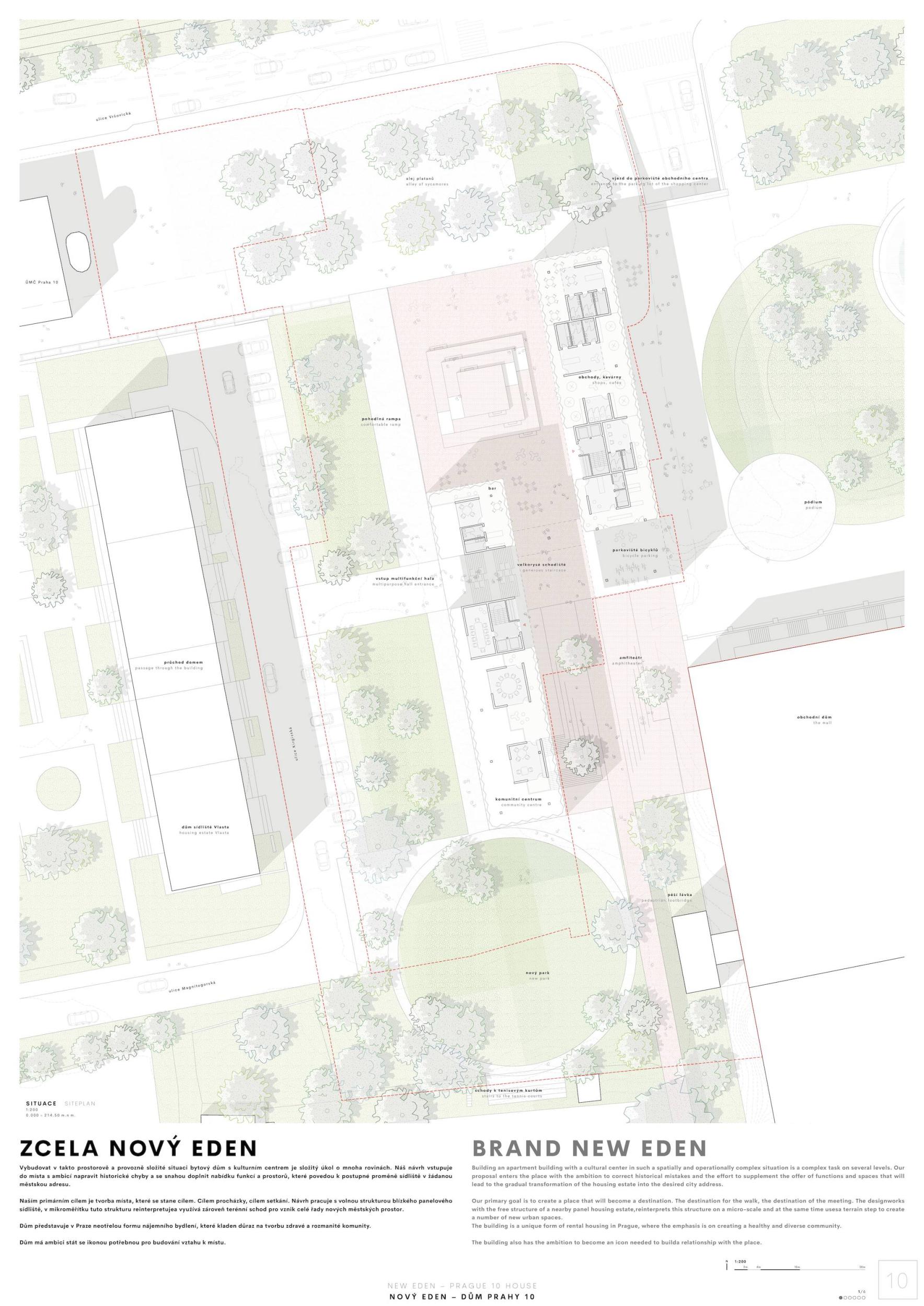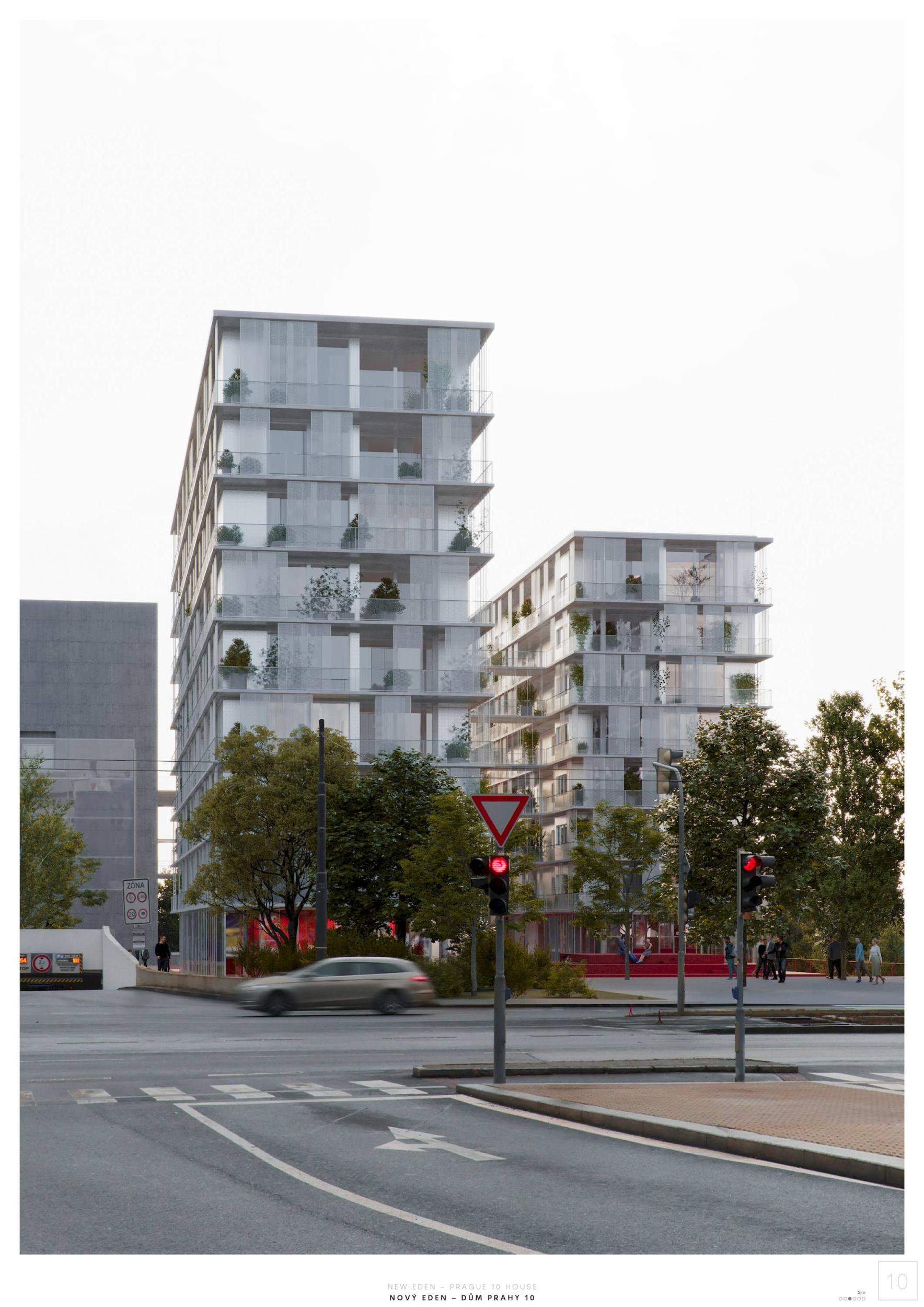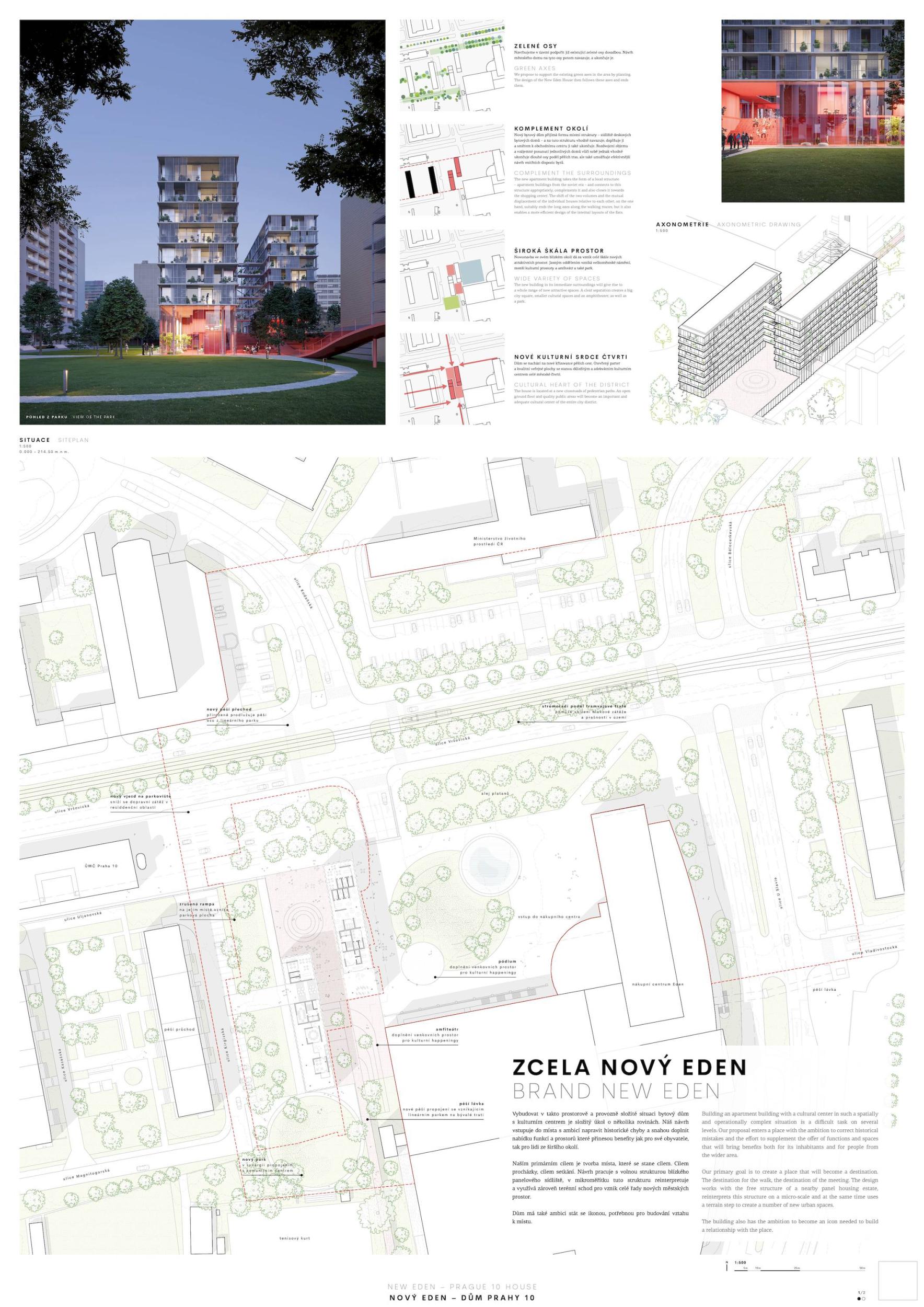 ZCELA NOVÝ EDEN. Vybudovat v takto prostorově a provozně složité situaci bytový dům s kulturním centrem je složitý úkol o mnoha rovinách. Náš návrh vstupuje do místa s ambicí napravit historické chyby a se snahou doplnit nabídku funkcí a prostorů, které povedou k postupné proměně sídliště v žádanou městskou adresu. Naším primárním cílem je tvorba místa, které se stane cílem. Cílem procházky, cílem setkání. Návrh pracuje s volnou strukturou blízkého panelového sídliště, v mikroměřítku tuto strukturu reinterpretuje a využívá zároveň terénní schod pro vznik celé řady nových městských prostor. Dům představuje v Praze neotřelou formu nájemního bydlení, které klade důraz na tvorbu zdravé a rozmanité komunity. Dům má ambici stát se ikonou potřebnou pro budování vztahu k místu.