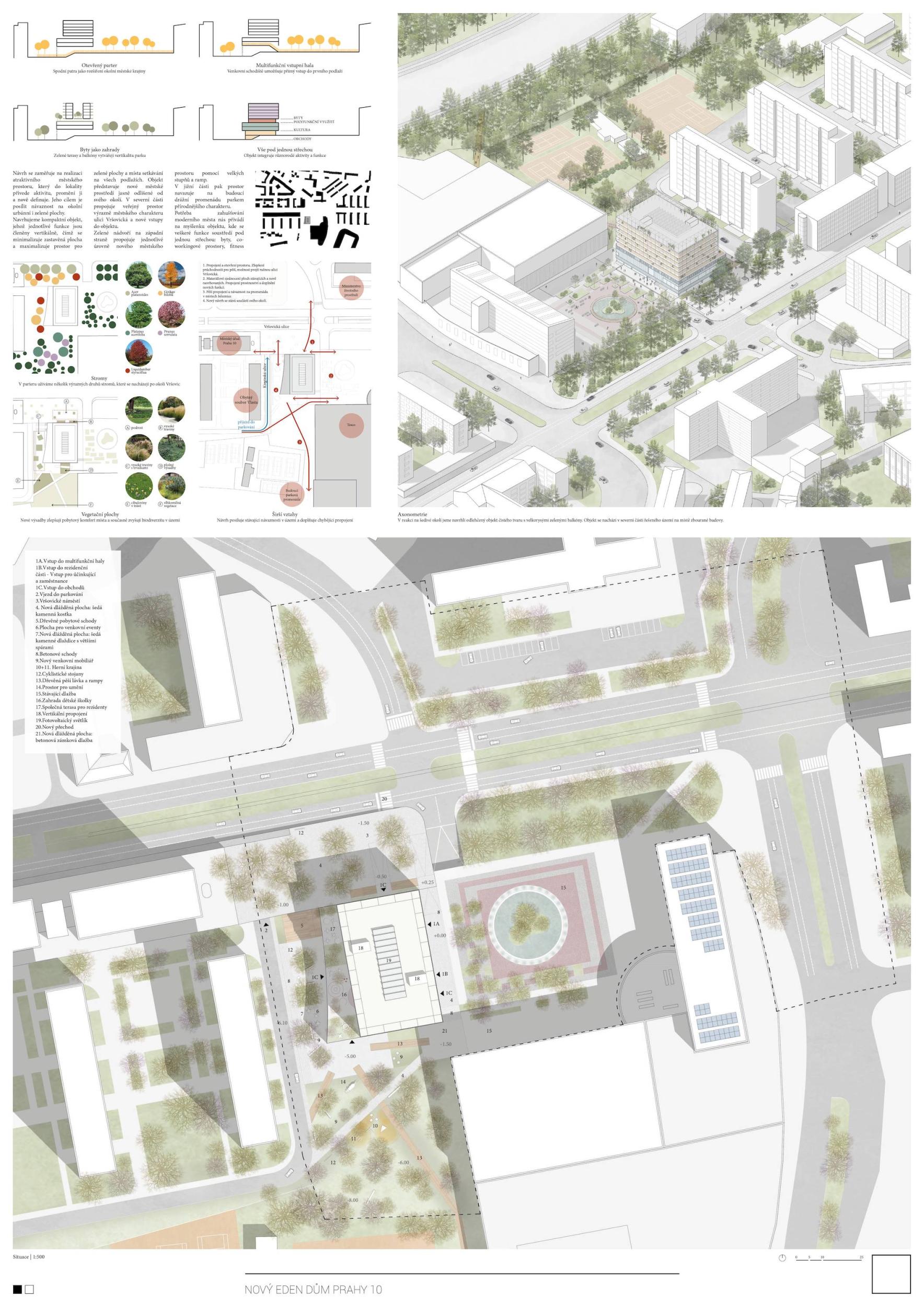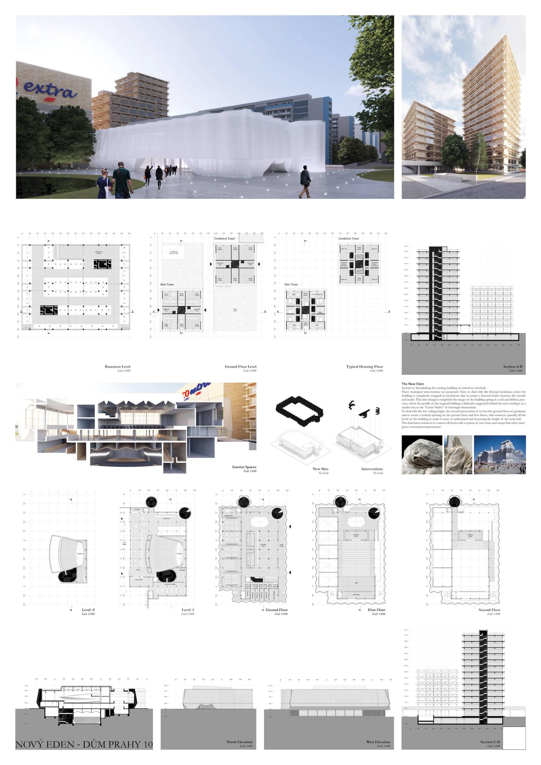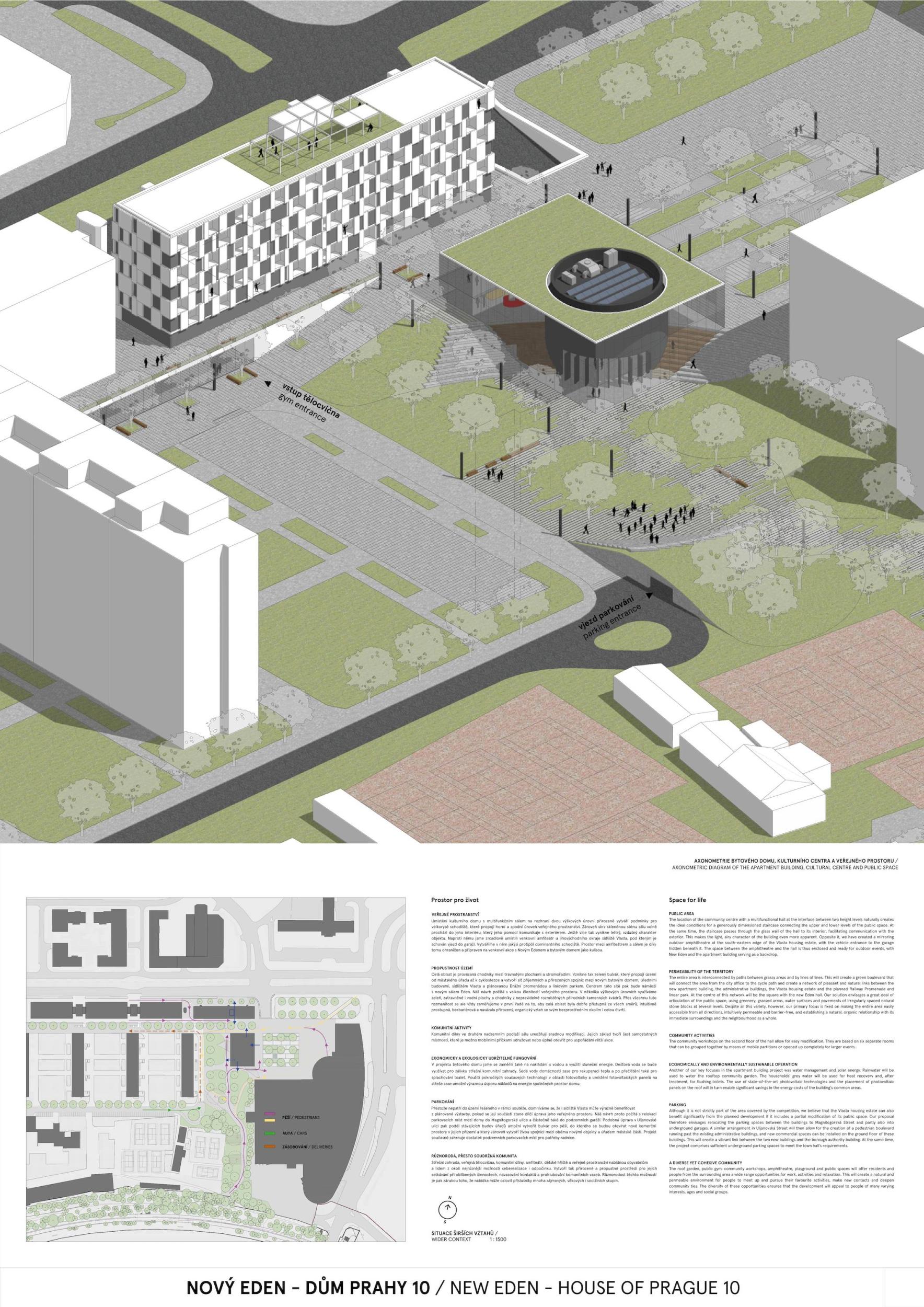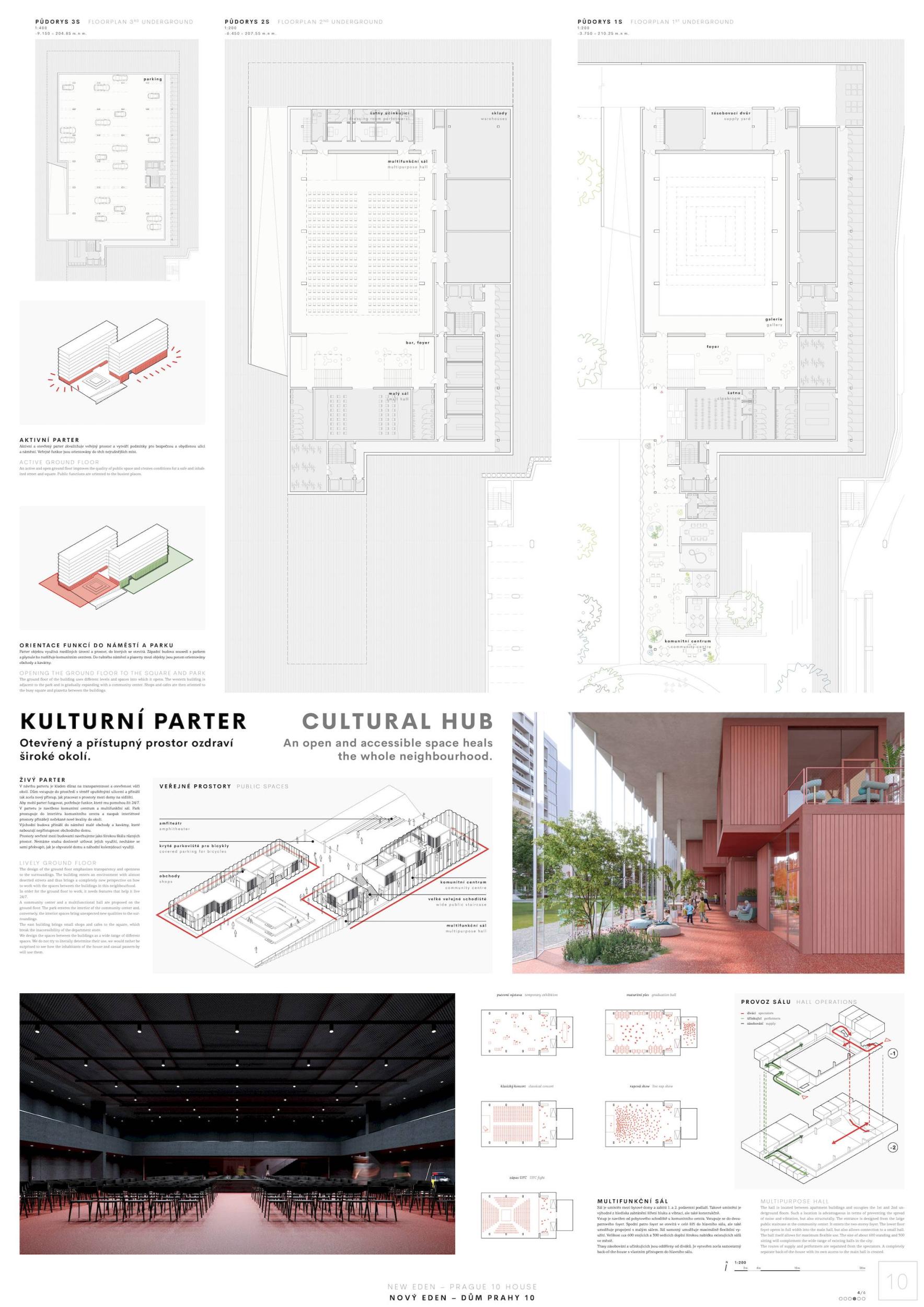 ZCELA NOVÝ EDEN. Vybudovat v takto prostorově a provozně složité situaci bytový dům s kulturním centrem je složitý úkol o mnoha rovinách. Náš návrh vstupuje do místa s ambicí napravit historické chyby a se snahou doplnit nabídku funkcí a prostorů, které povedou k postupné proměně sídliště v žádanou městskou adresu. Naším primárním cílem je tvorba místa, které se stane cílem. Cílem procházky, cílem setkání. Návrh pracuje s volnou strukturou blízkého panelového sídliště, v mikroměřítku tuto strukturu reinterpretuje a využívá zároveň terénní schod pro vznik celé řady nových městských prostor. Dům představuje v Praze neotřelou formu nájemního bydlení, které klade důraz na tvorbu zdravé a rozmanité komunity. Dům má ambici stát se ikonou potřebnou pro budování vztahu k místu.