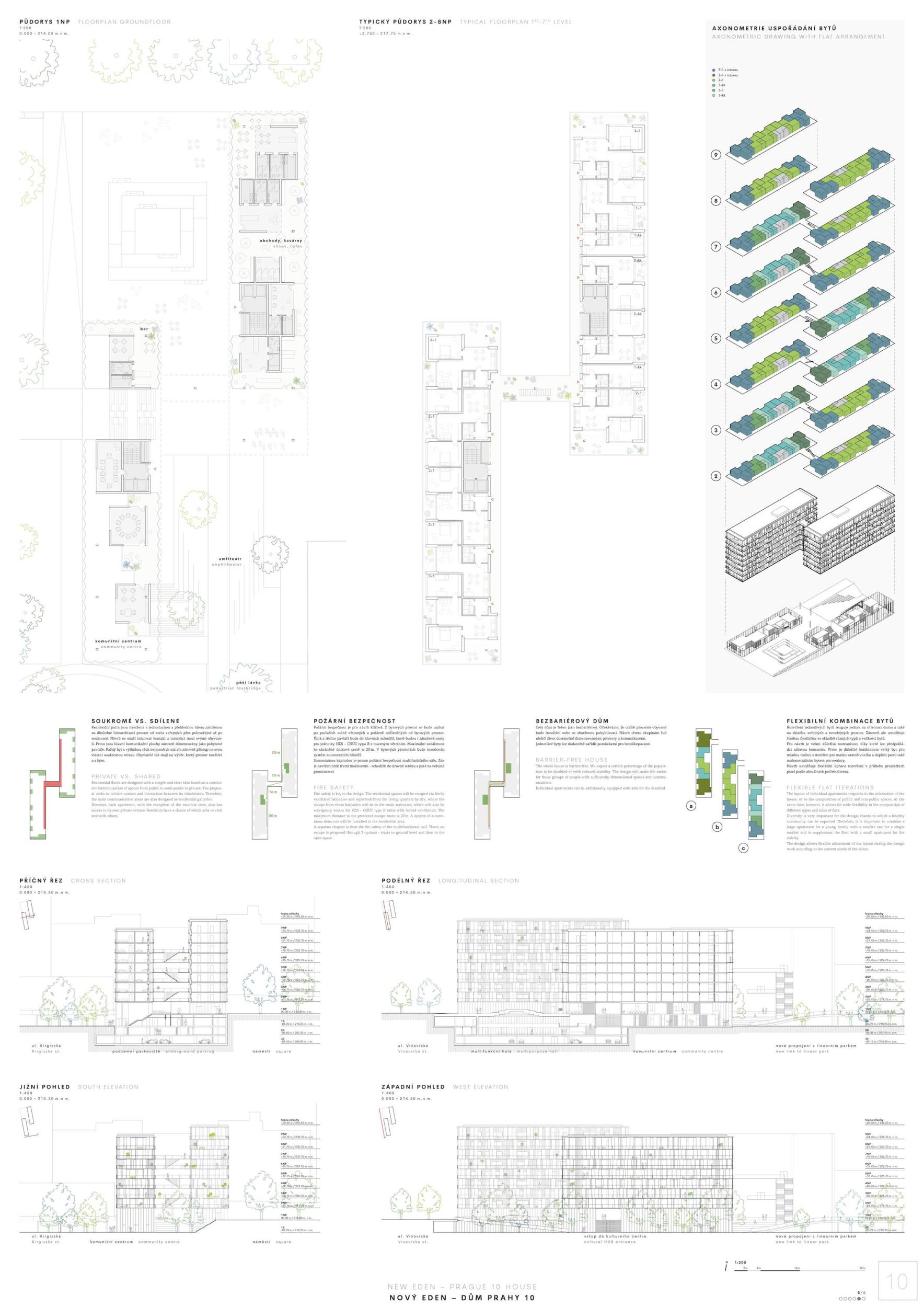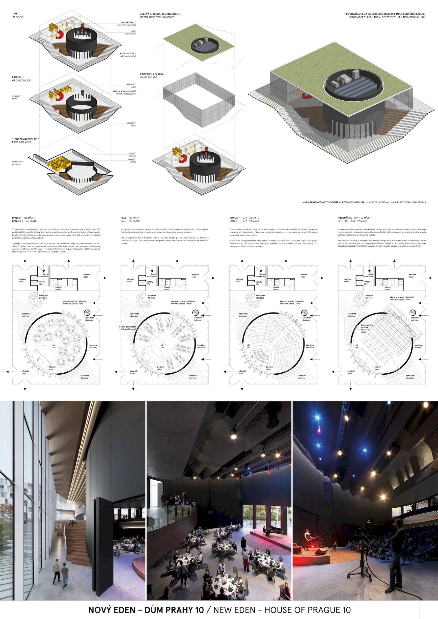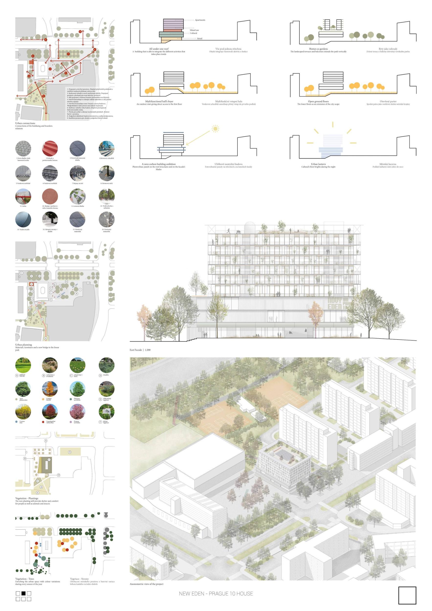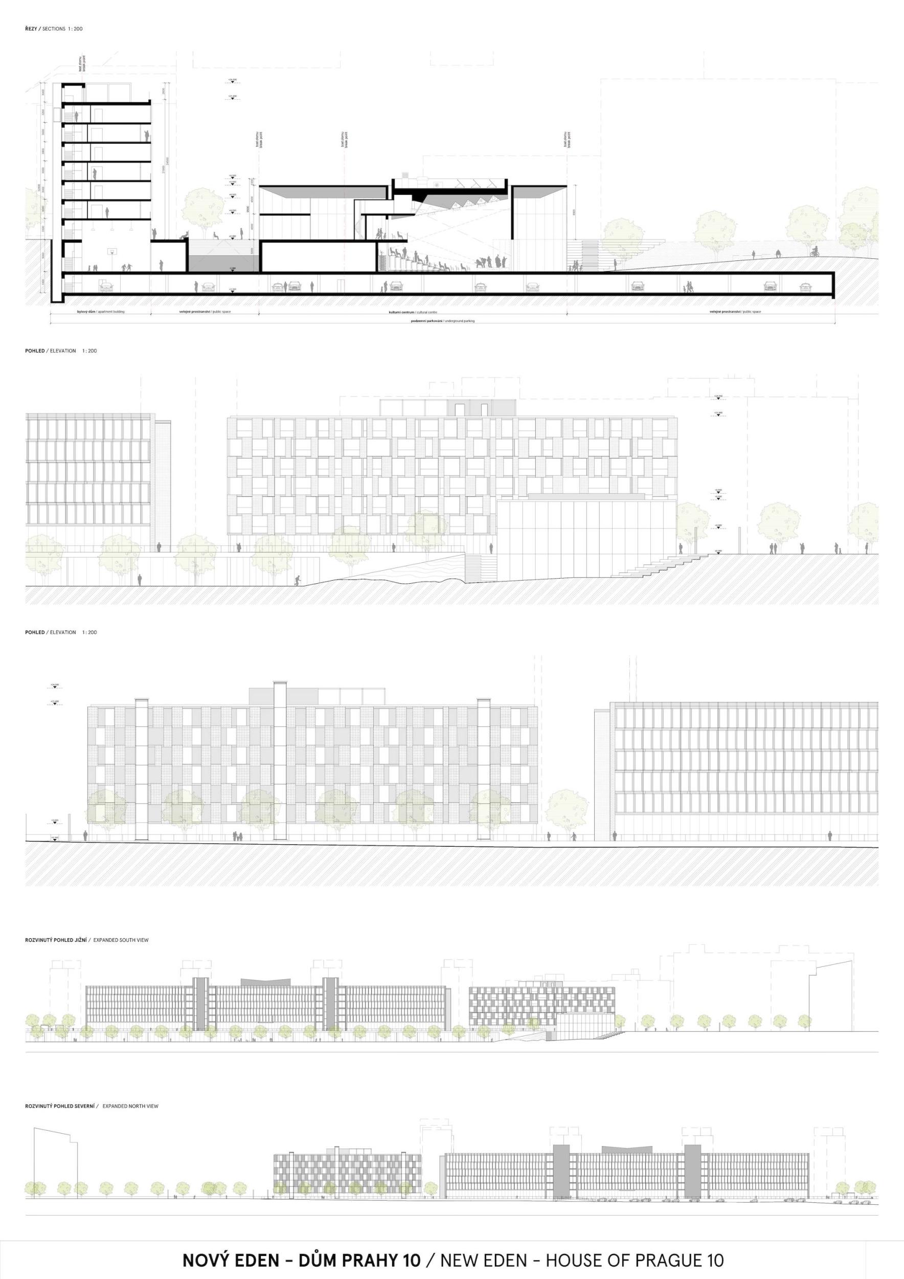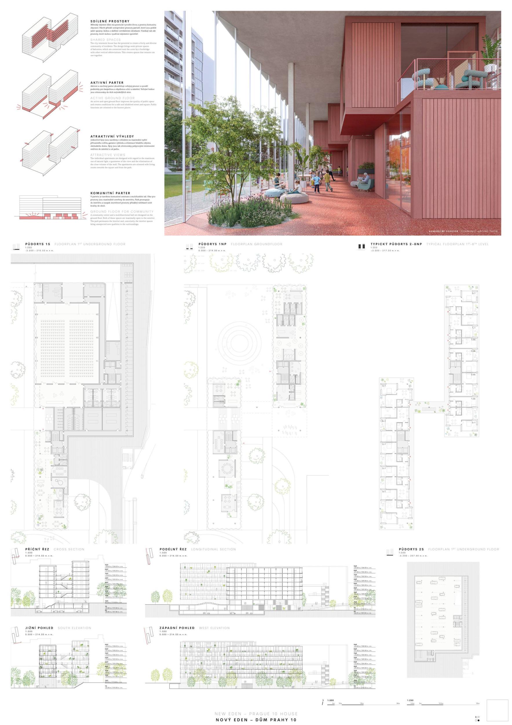 ZCELA NOVÝ EDEN. Vybudovat v takto prostorově a provozně složité situaci bytový dům s kulturním centrem je složitý úkol o mnoha rovinách. Náš návrh vstupuje do místa s ambicí napravit historické chyby a se snahou doplnit nabídku funkcí a prostorů, které povedou k postupné proměně sídliště v žádanou městskou adresu. Naším primárním cílem je tvorba místa, které se stane cílem. Cílem procházky, cílem setkání. Návrh pracuje s volnou strukturou blízkého panelového sídliště, v mikroměřítku tuto strukturu reinterpretuje a využívá zároveň terénní schod pro vznik celé řady nových městských prostor. Dům představuje v Praze neotřelou formu nájemního bydlení, které klade důraz na tvorbu zdravé a rozmanité komunity. Dům má ambici stát se ikonou potřebnou pro budování vztahu k místu.