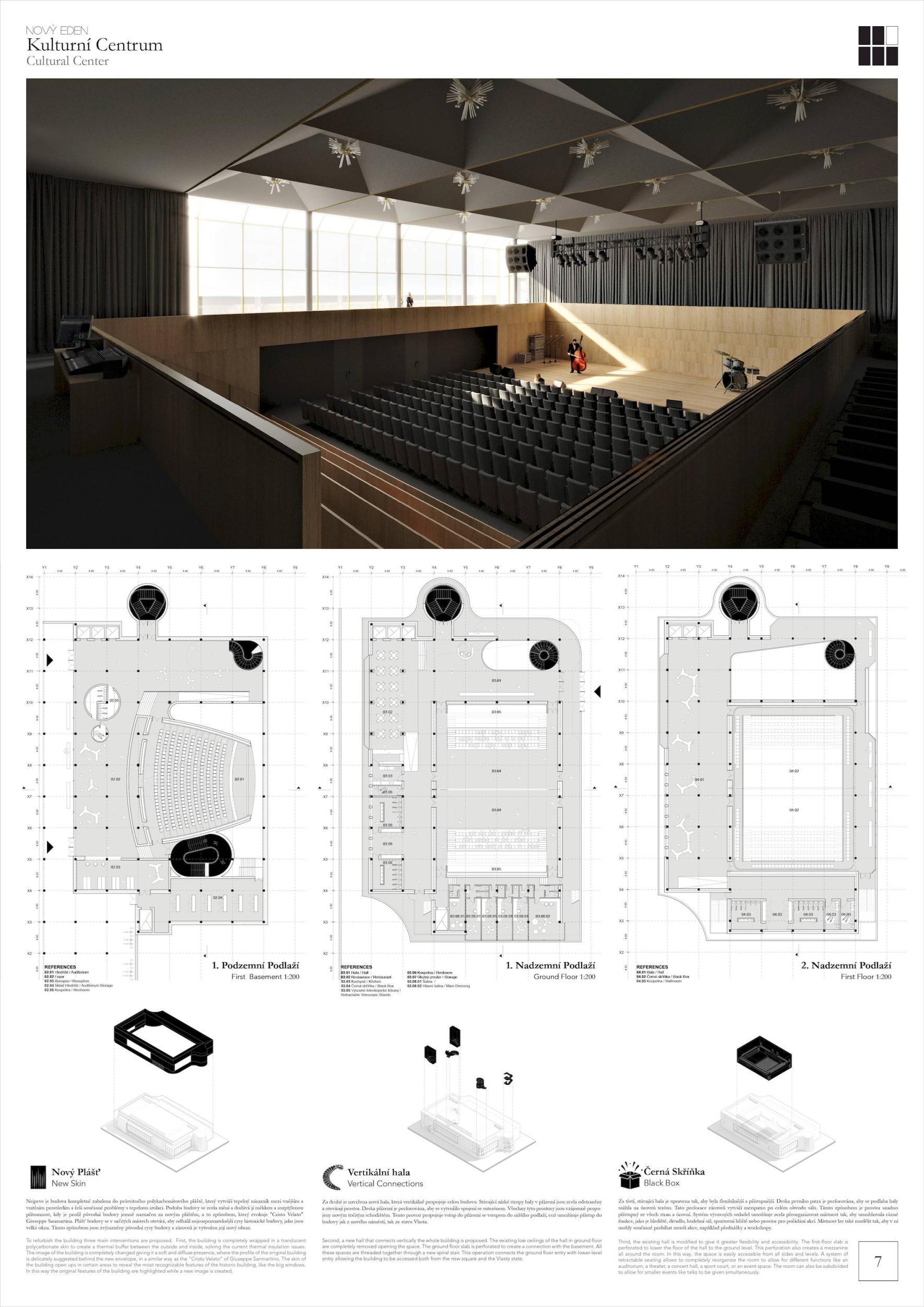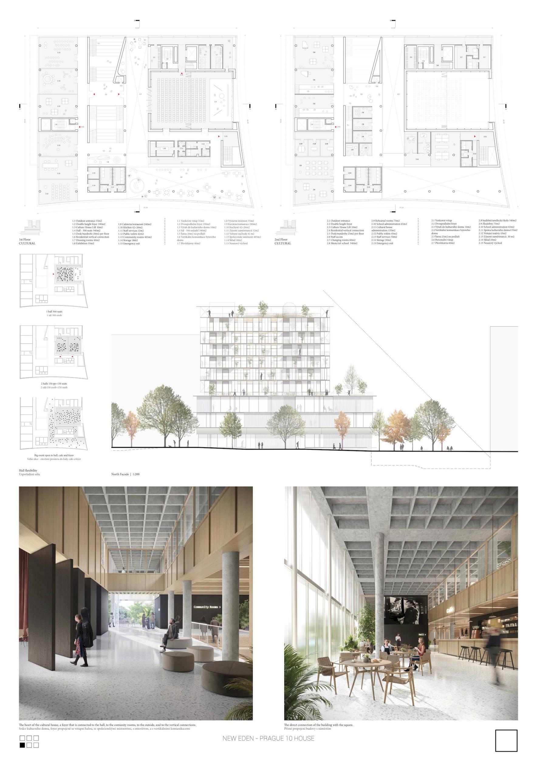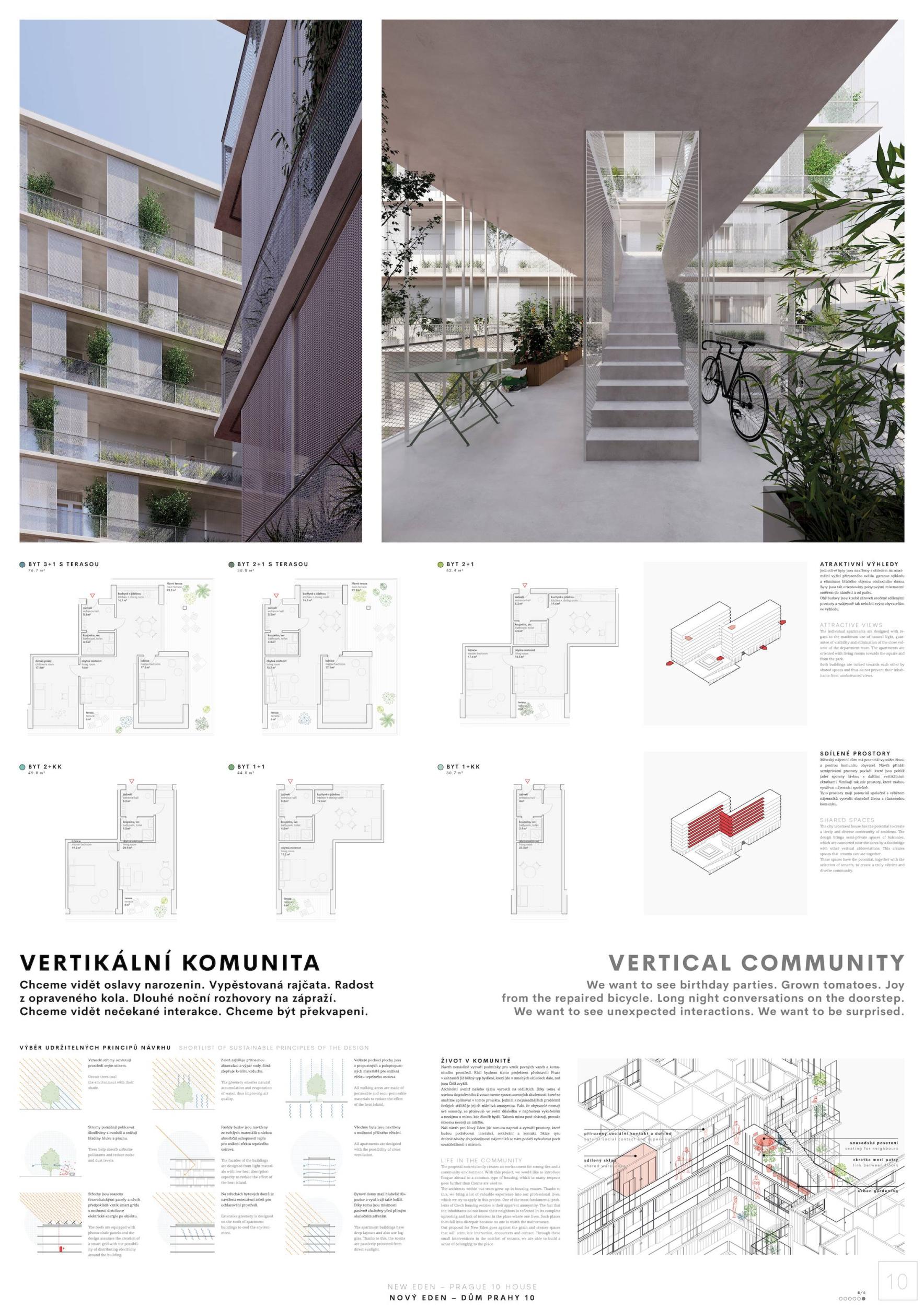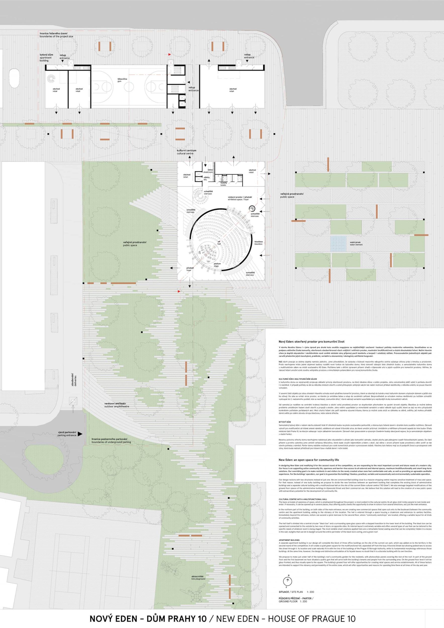 ZCELA NOVÝ EDEN. Vybudovat v takto prostorově a provozně složité situaci bytový dům s kulturním centrem je složitý úkol o mnoha rovinách. Náš návrh vstupuje do místa s ambicí napravit historické chyby a se snahou doplnit nabídku funkcí a prostorů, které povedou k postupné proměně sídliště v žádanou městskou adresu. Naším primárním cílem je tvorba místa, které se stane cílem. Cílem procházky, cílem setkání. Návrh pracuje s volnou strukturou blízkého panelového sídliště, v mikroměřítku tuto strukturu reinterpretuje a využívá zároveň terénní schod pro vznik celé řady nových městských prostor. Dům představuje v Praze neotřelou formu nájemního bydlení, které klade důraz na tvorbu zdravé a rozmanité komunity. Dům má ambici stát se ikonou potřebnou pro budování vztahu k místu.