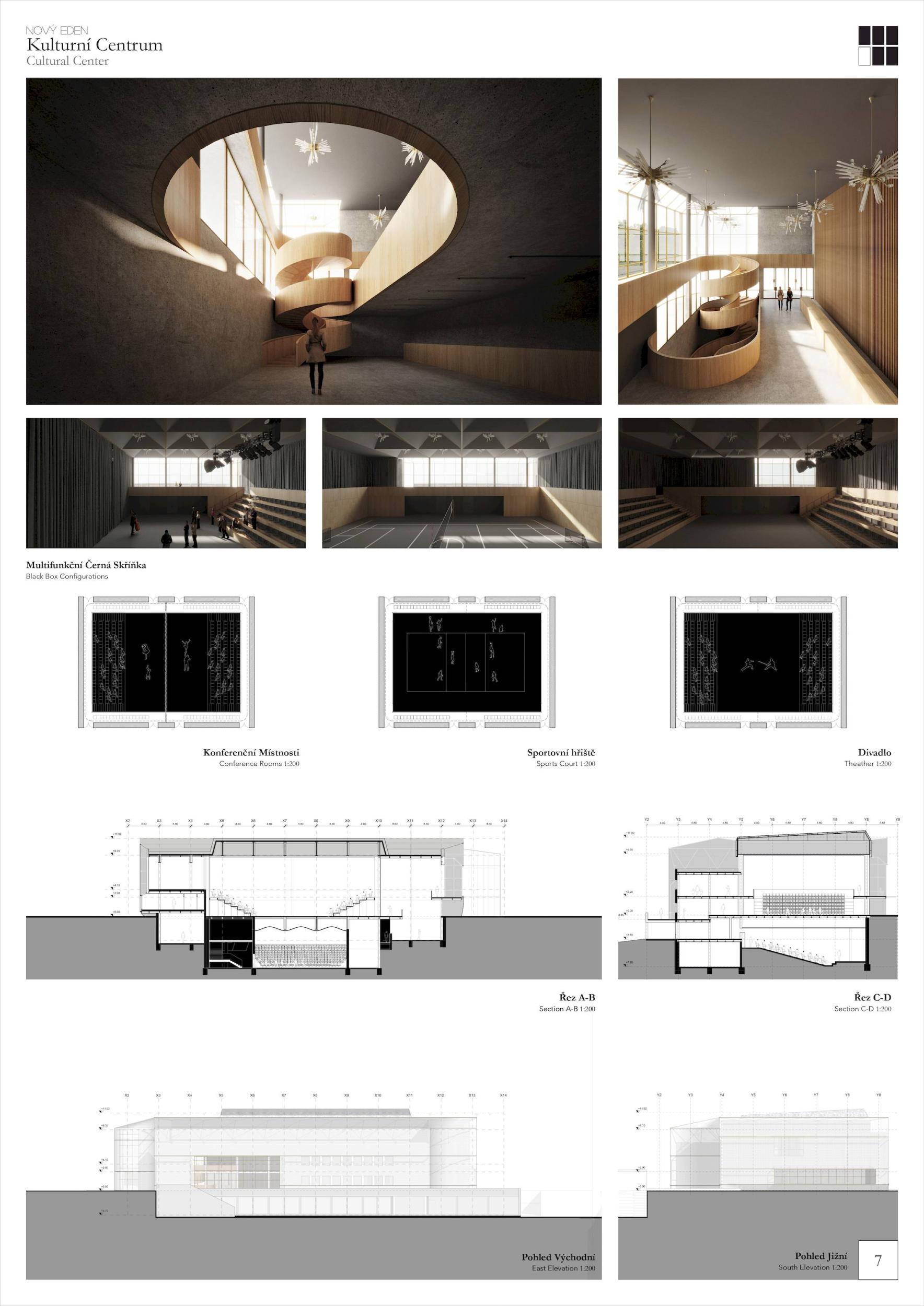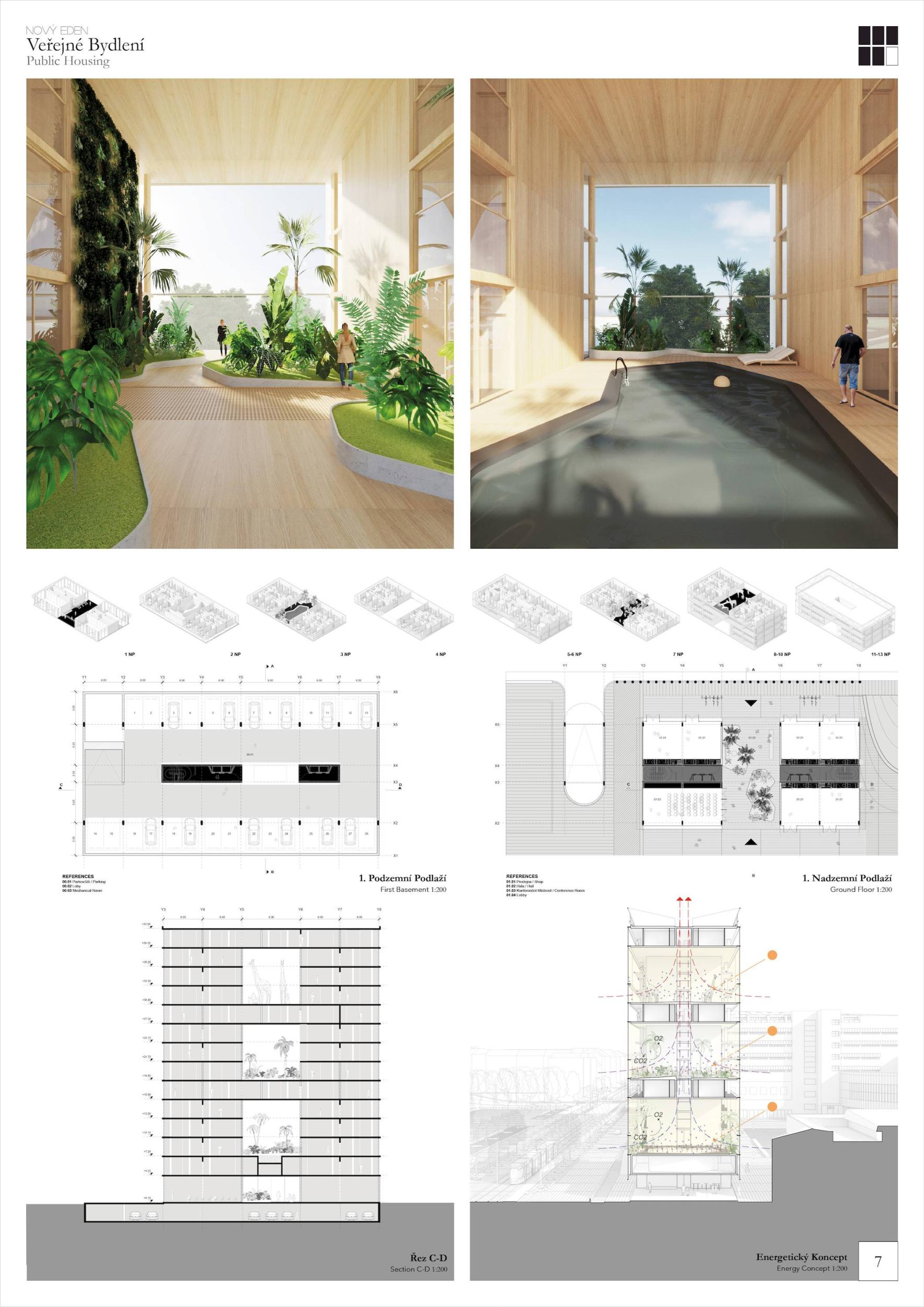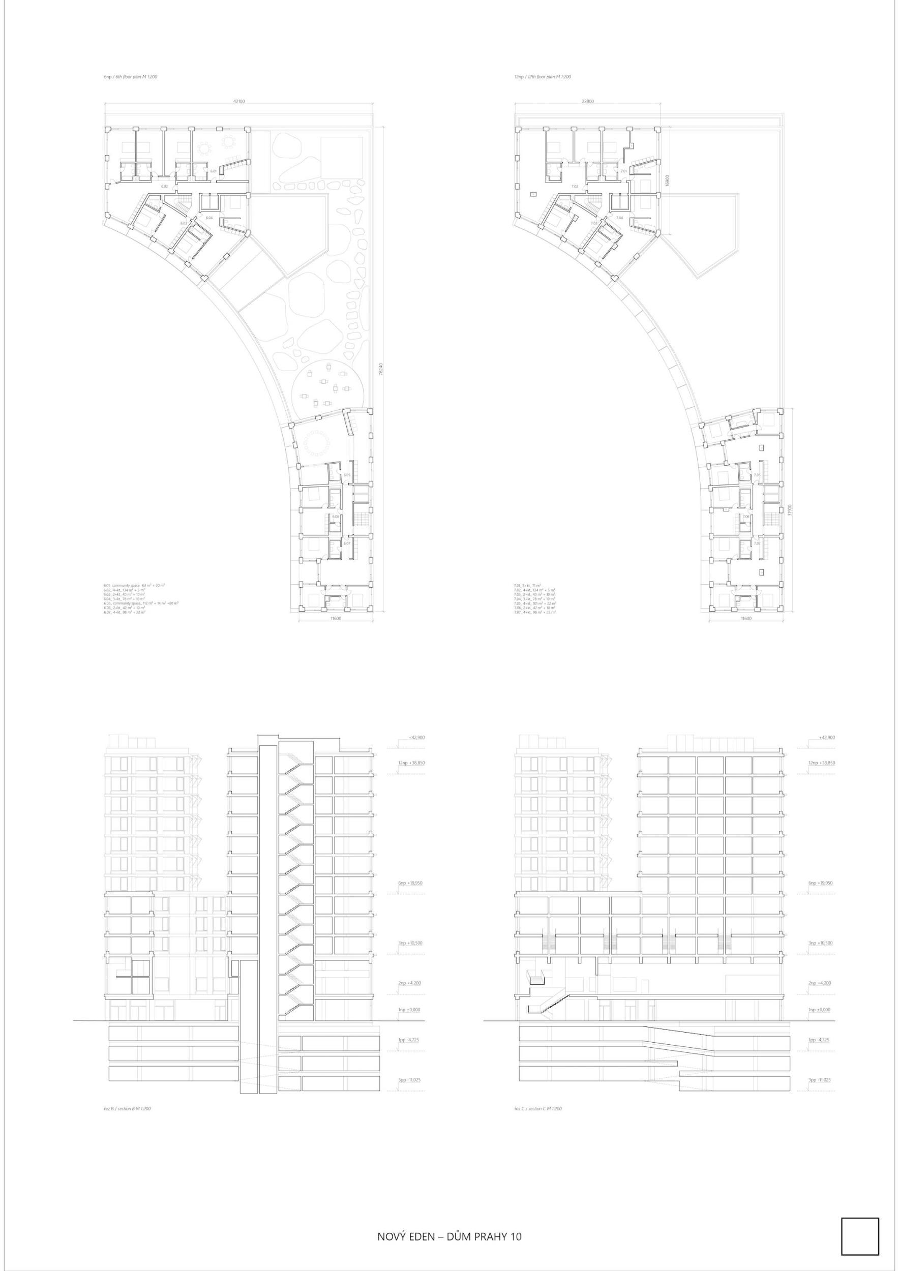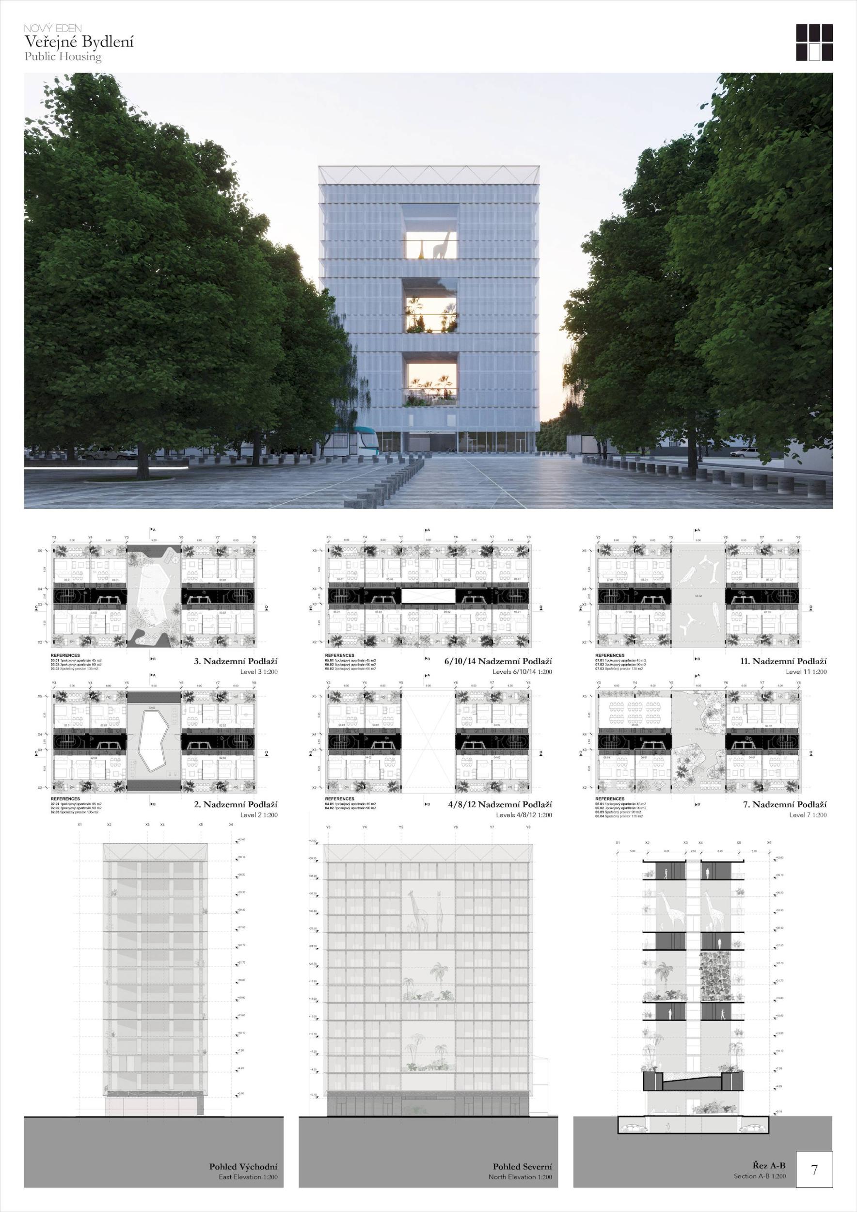 ZCELA NOVÝ EDEN. Vybudovat v takto prostorově a provozně složité situaci bytový dům s kulturním centrem je složitý úkol o mnoha rovinách. Náš návrh vstupuje do místa s ambicí napravit historické chyby a se snahou doplnit nabídku funkcí a prostorů, které povedou k postupné proměně sídliště v žádanou městskou adresu. Naším primárním cílem je tvorba místa, které se stane cílem. Cílem procházky, cílem setkání. Návrh pracuje s volnou strukturou blízkého panelového sídliště, v mikroměřítku tuto strukturu reinterpretuje a využívá zároveň terénní schod pro vznik celé řady nových městských prostor. Dům představuje v Praze neotřelou formu nájemního bydlení, které klade důraz na tvorbu zdravé a rozmanité komunity. Dům má ambici stát se ikonou potřebnou pro budování vztahu k místu.