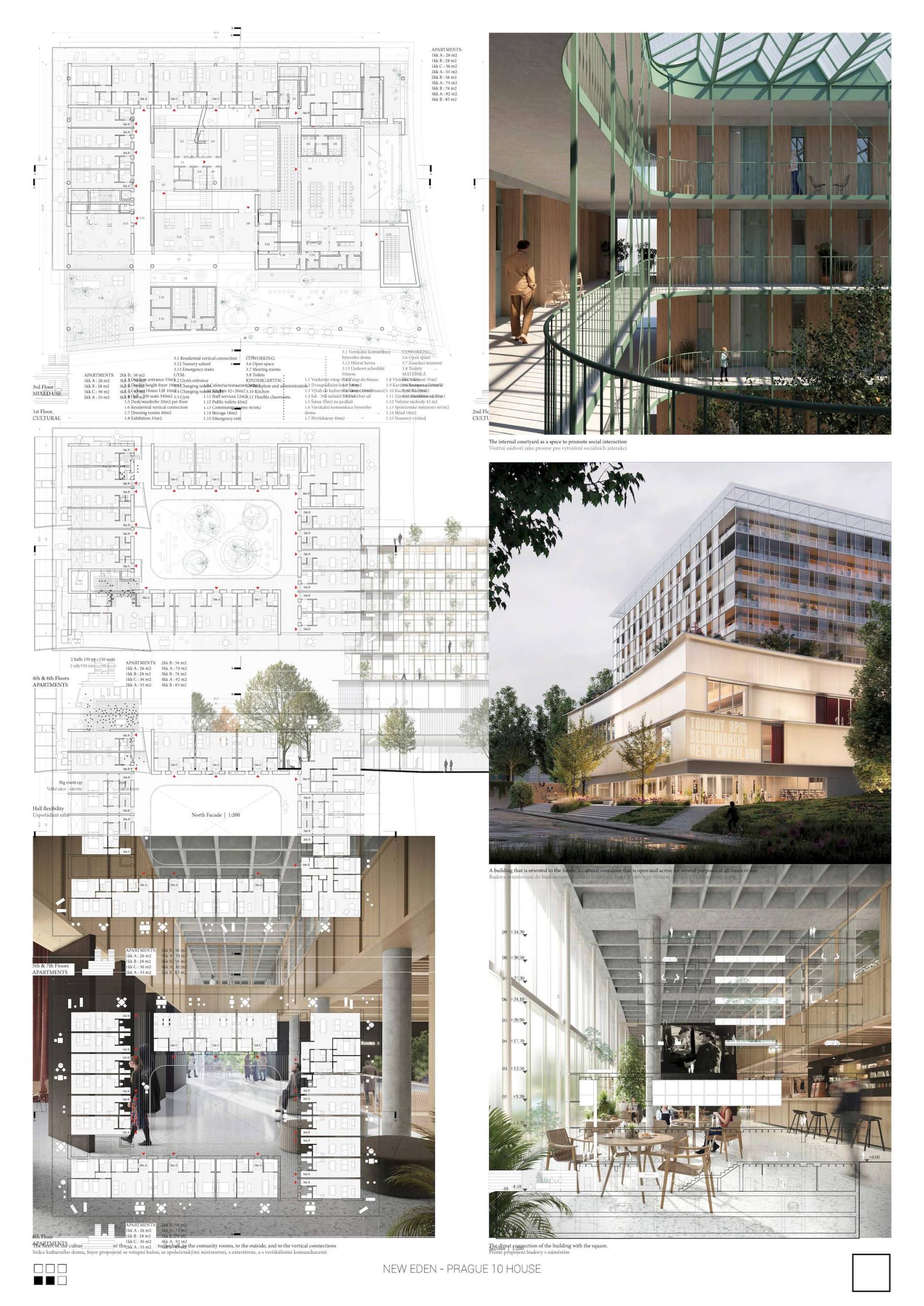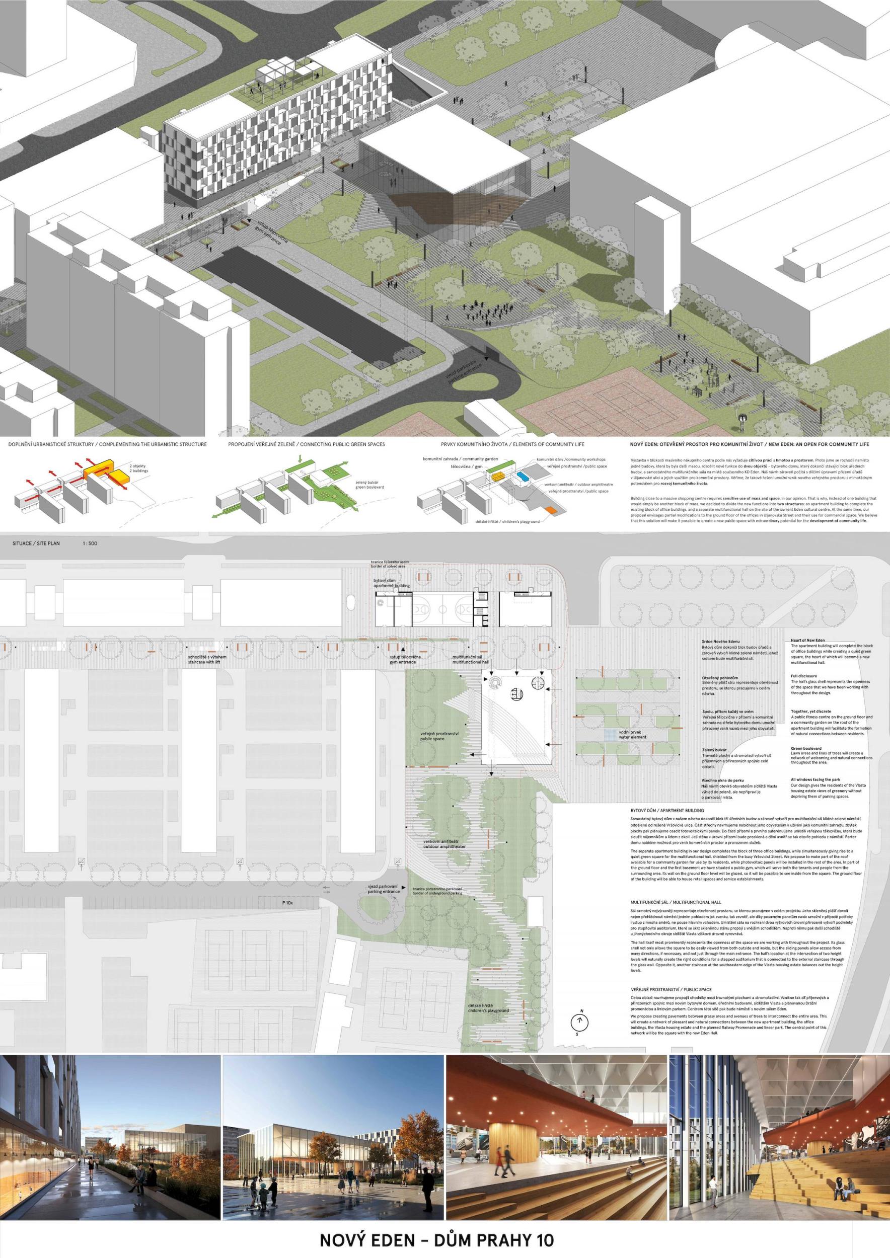 Projekt „Zcela nový Eden“ s respektem spojuje všechny důležité funkční prvky požadované soutěží a zároveň dodává oblasti živost a nový životní styl. Urbanisticky návrh respektuje nejen polohu původního domu Eden, ale na úrovni mikroměřítka navazuje i na linii panelových domů. Navíc je efektivně řešena automobilová doprava, aby byl ponechán prostor veřejným funkcím, zeleni, pěším a cyklistickým trasám. Z architektonického hlediska budova využívá požadované kulturní a multifunkční služby jako inteligentní městskou spojnici v přízemí, a poskytuje tak živou platformu veřejného života mezi interiérem a exteriérem. Tyto prostory jsou rozmanité, přístupné, inspirativní a zajišťují sociální interakce mezi nájemníky a kolemjdoucími. Porota oceňuje důraz na zelené plochy, které jsou dále obohaceny propojením lávky s jižním zeleným pásem. Koncepty zapojení komunity, rozmanitosti a přístupnosti jsou nejlépe zdůrazněny v návrhu typologie bydlení, který umožňuje sdílené prostory interakce na balkonech a v průchodech v každém patře. Tento odvážný krok by mohl být dokonce typologickým řešením pražské bytové problematiky, neboť poskytuje novou a svěží myšlenku, stále respektující historické a kulturní zvyklosti českých občanů.