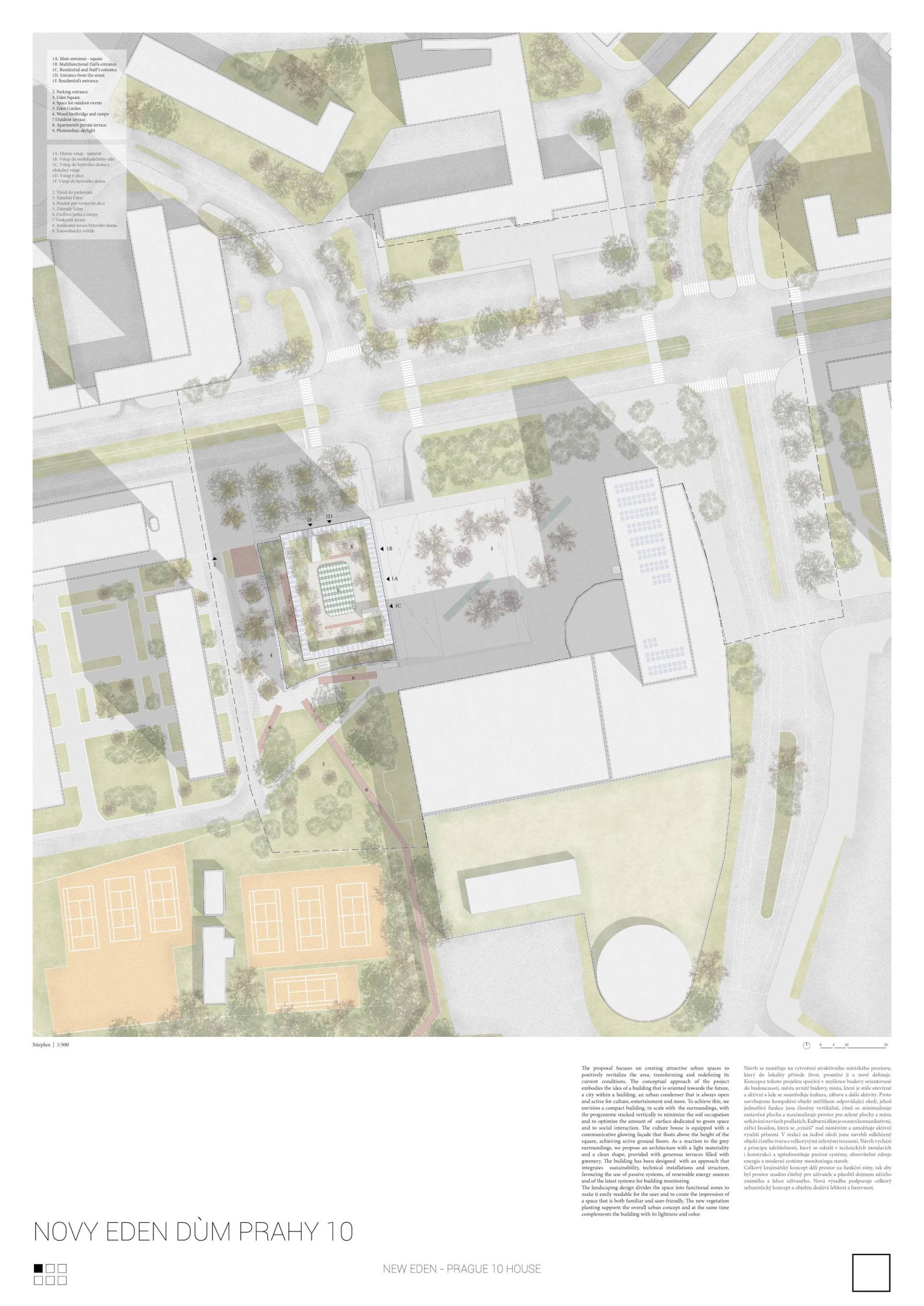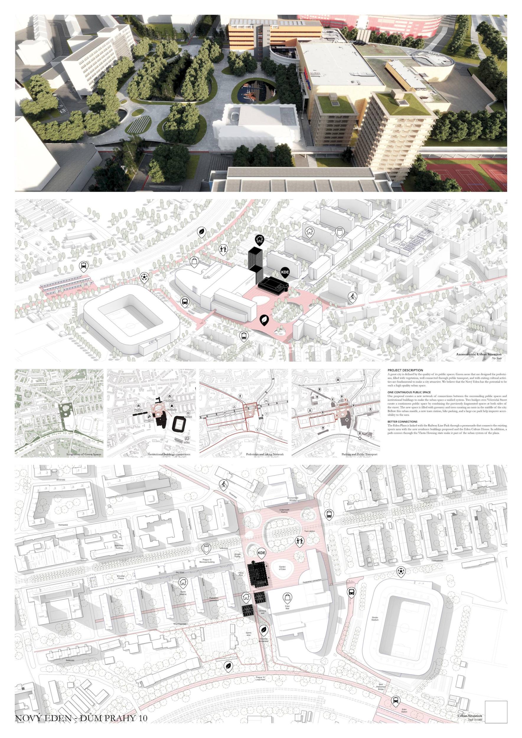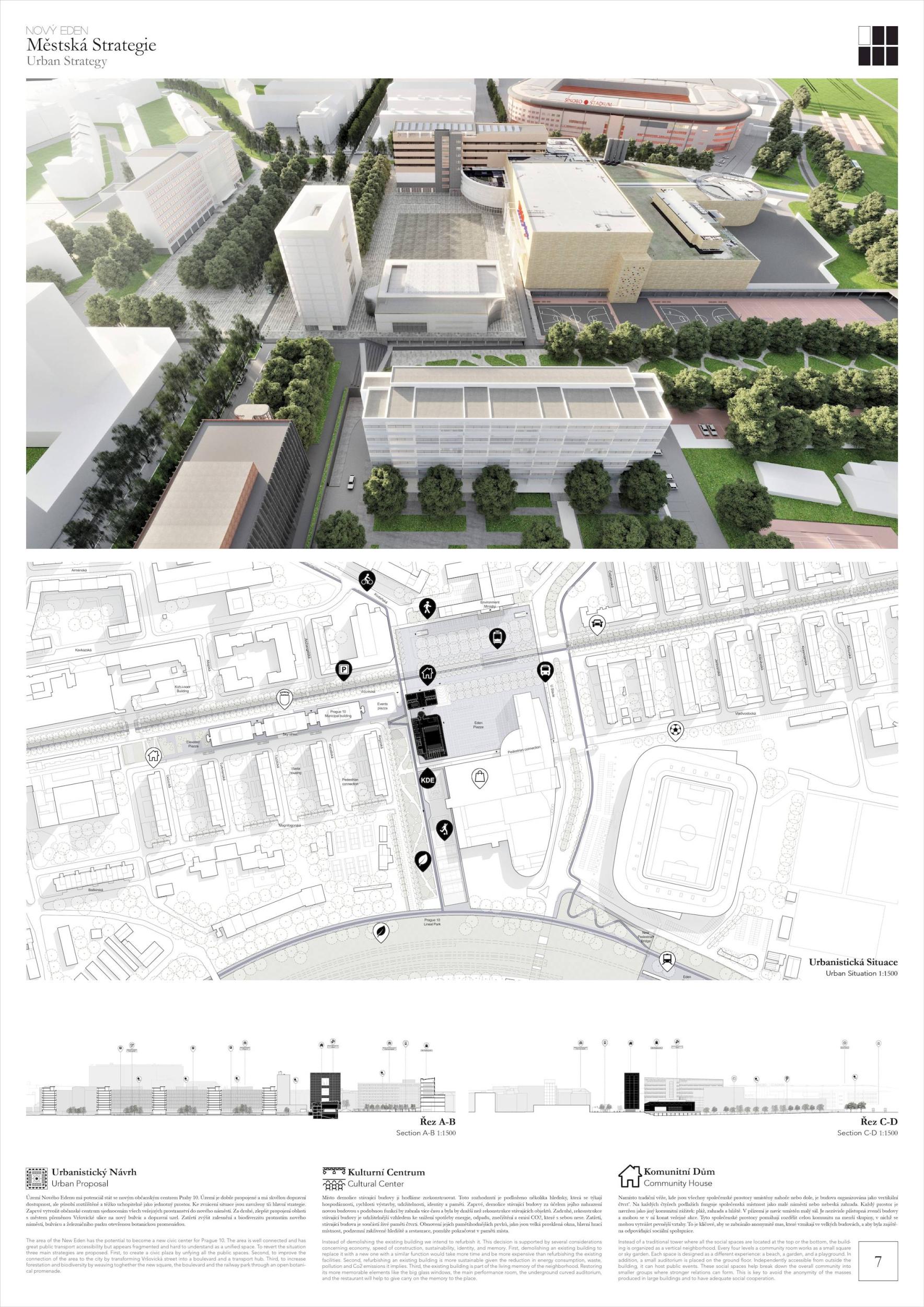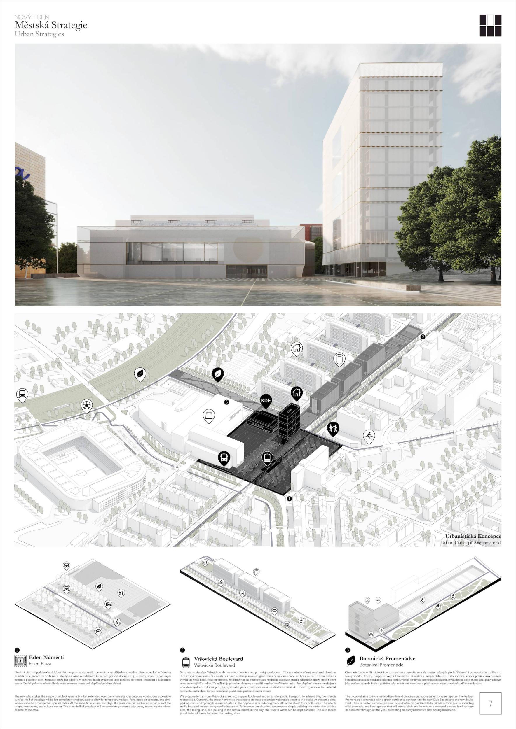 Území Nového Edenu má potenciál stát se novým občanským centrem Prahy 10. Území je dobře propojené a má skvělou dopravní dostupnost, ale působí roztříštěně a těžko uchopitelně jako jednotný prostor. Ke zvrácení situace jsou navrženy tři hlavní strategie. Zaprvé vytvořit občanské centrum sjednocením všech veřejných prostranství do nového náměstí. Za druhé, zlepšit propojení oblasti s městem přeměnou Vršovické ulice na nový bulvár a dopravní uzel. Zatřetí zvýšit zalesnění a biodiverzitu protnutím nového náměstí, bulváru a železničního parku otevřenou botanickou promenádou. Místo demolice budovy ji hodláme zrekonstruovat. Toto rozhodnutí je podloženo několika hledisky, která se týkají hospodárnosti, rychlosti výstavby, udržitelnosti, identity a paměti. Zaprvé, demolice stávající budovy za účelem jejího nahrazení novou budovou s podobnou funkcí by zabrala více času a byla by dražší než rekonstrukce stávajících objektů. Zadruhé, rekonstrukce stávající budovy je udržitelnější vzhledem ke snížení spotřeby energie, odpadu, znečištění a emisí CO2, které s sebou nese. Zatřetí, stávající budova je součástí živé paměti čtvrti. Obnovení jejích pamětihodnějších prvků, jako jsou velká prosklená okna, hlavní hrací místnost, podzemní zakřivené hlediště a restaurace, pomůže pokračovat v paměti místa.