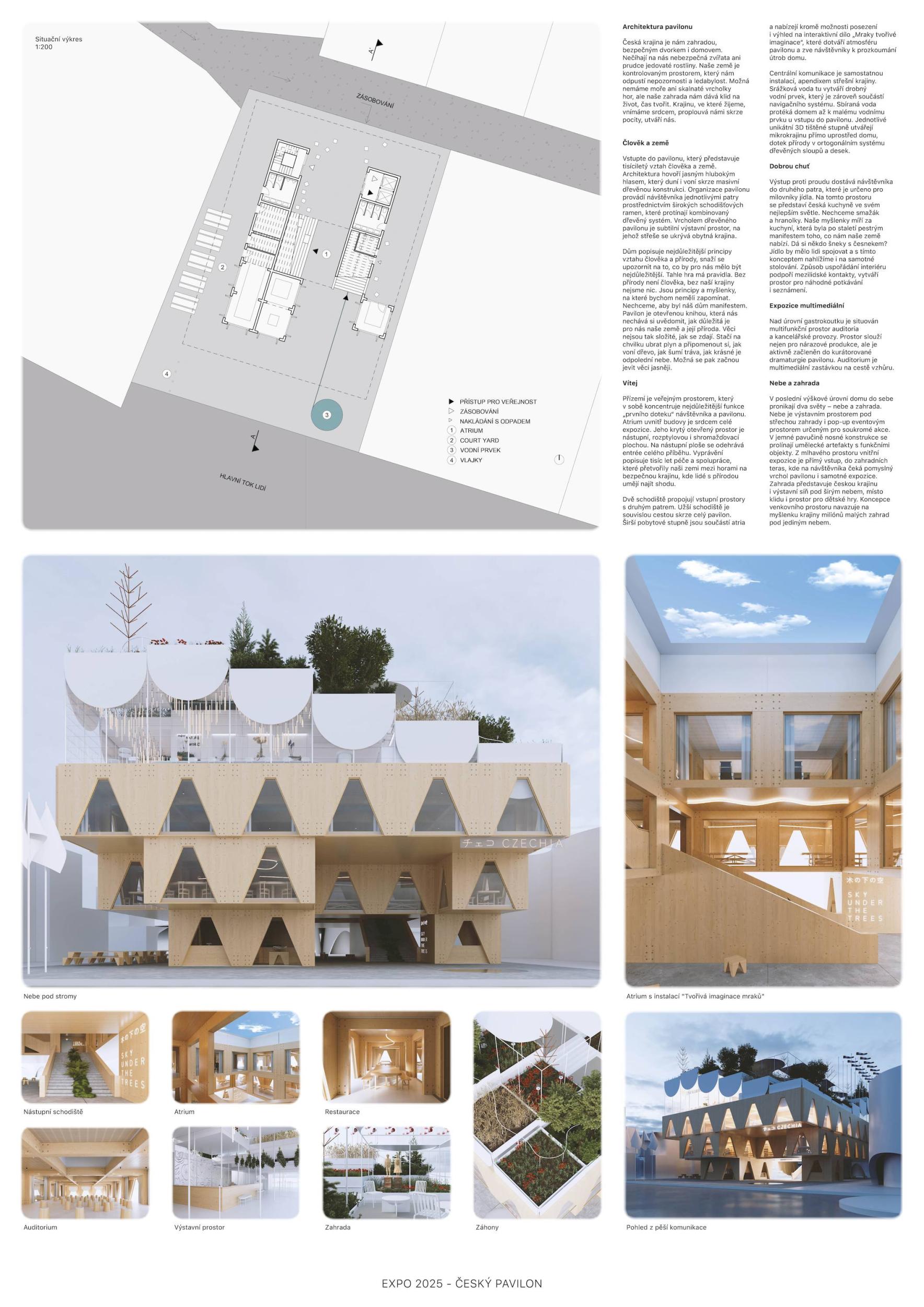 WOODEN TEMPLE. Výstavní pavilon České republiky má formu dřevěné strukturální skulptury představující stylizovaný les, jako jedno z nejdostupnějších a nejpopulárnějších míst trávení volného času Čechů. Těží z prominent-ní polohy na nábřežní promenádě. Je snadno identi-fikovatelný zblízka i z výhledů z Fujimotovi kolonády v laguně. Má jasný, měřítkově nadnesený, snadno zapamatovatelný výraz. Lesní katedrála je vyabstrahovanou hrou vertikál dřevěných lamel, překrývajících se v průhledech a vrstvících se v plánech. Světlo prostupuje ze všech stran, interferuje klenbou. Vnitřní prostor volně stoupá a klesá, dynamicky pulzuje, otevírá se a zahaluje, vzpíná se proti nebi. Postupně se odlupují jeho jednotlivé vrstvy. Návrh využívá maximální míře efektů přirozeného prostředí bez audiovizuálních technologií. Je reakcí na přetechnizovanou a virtuální realitu.