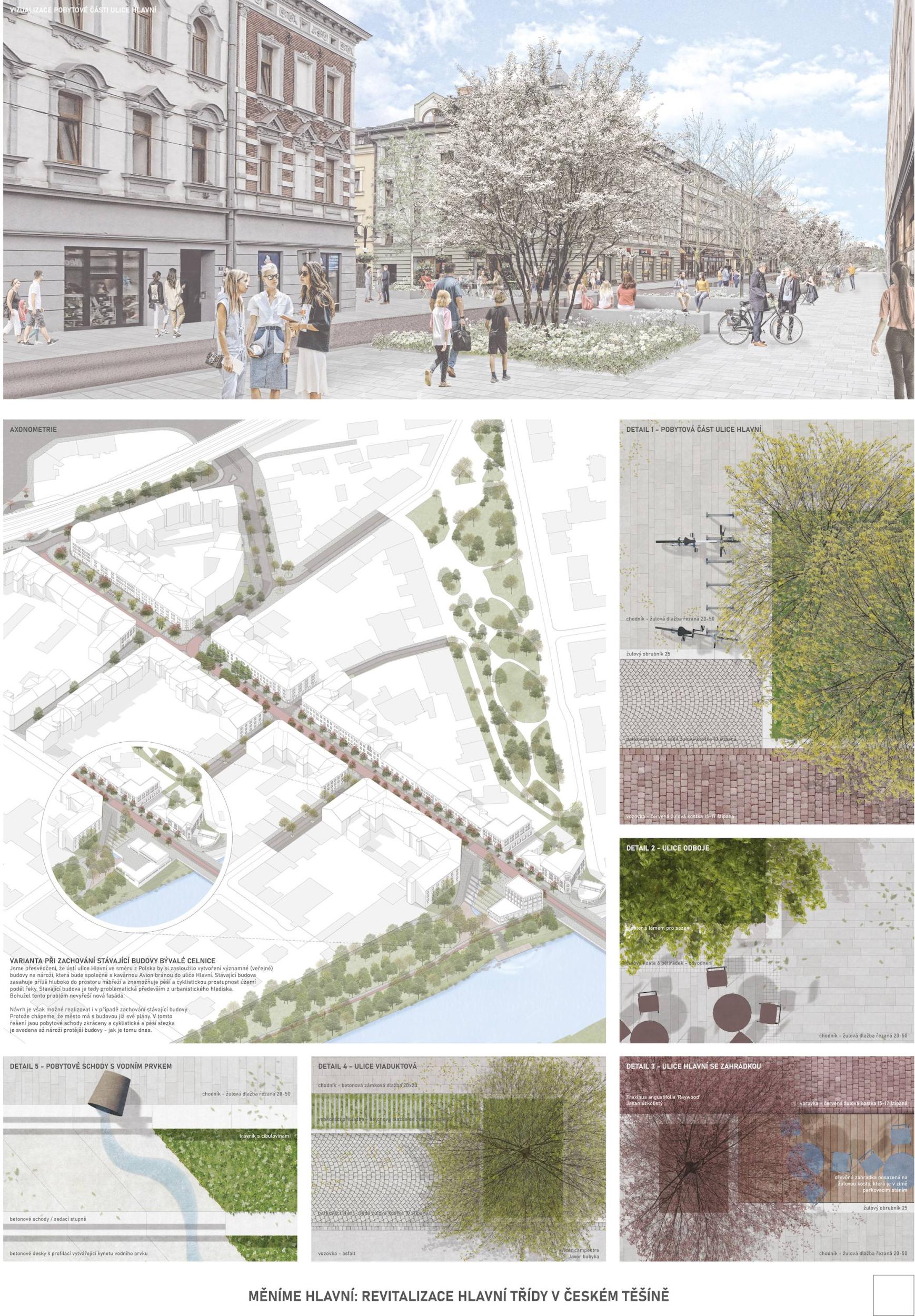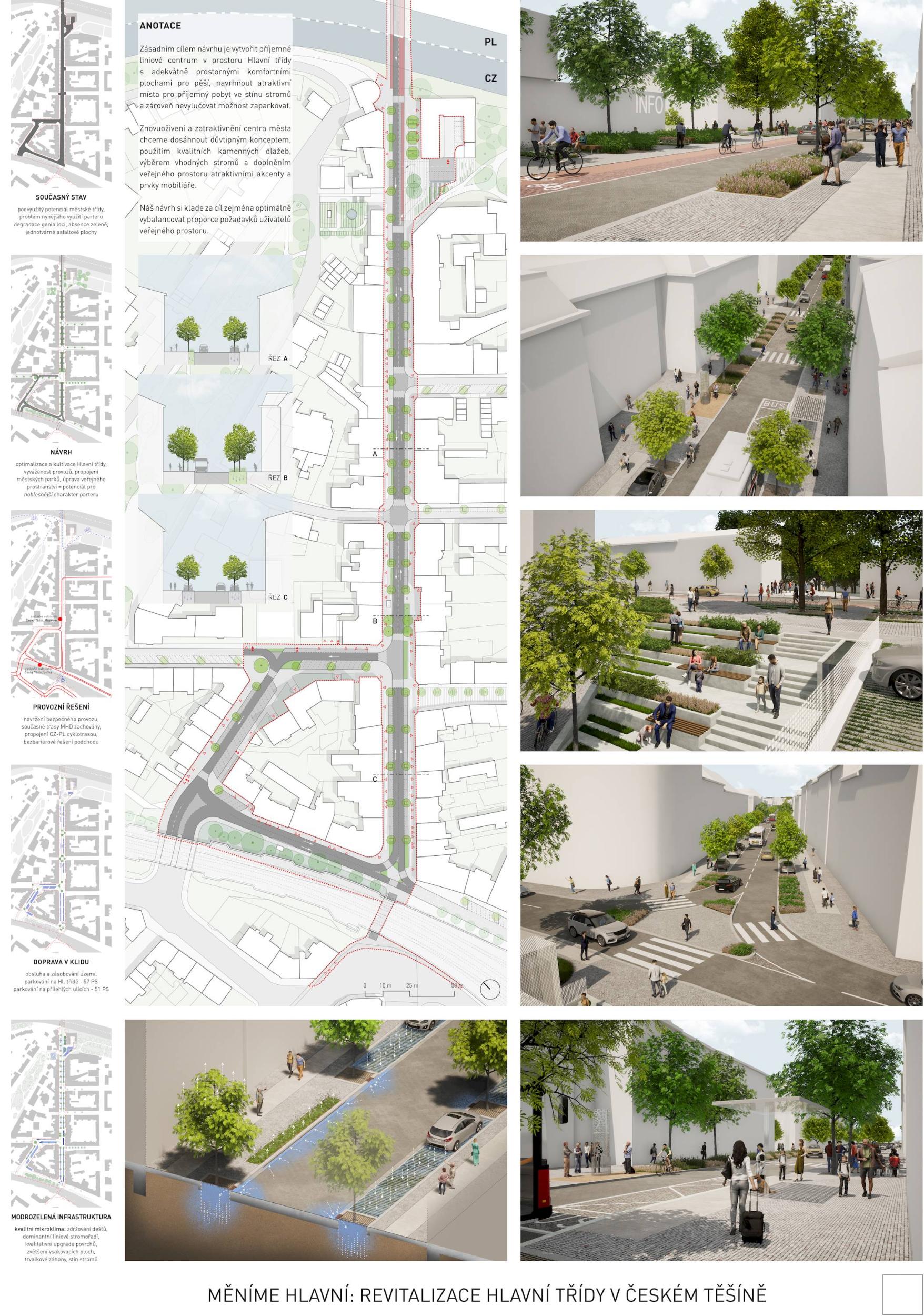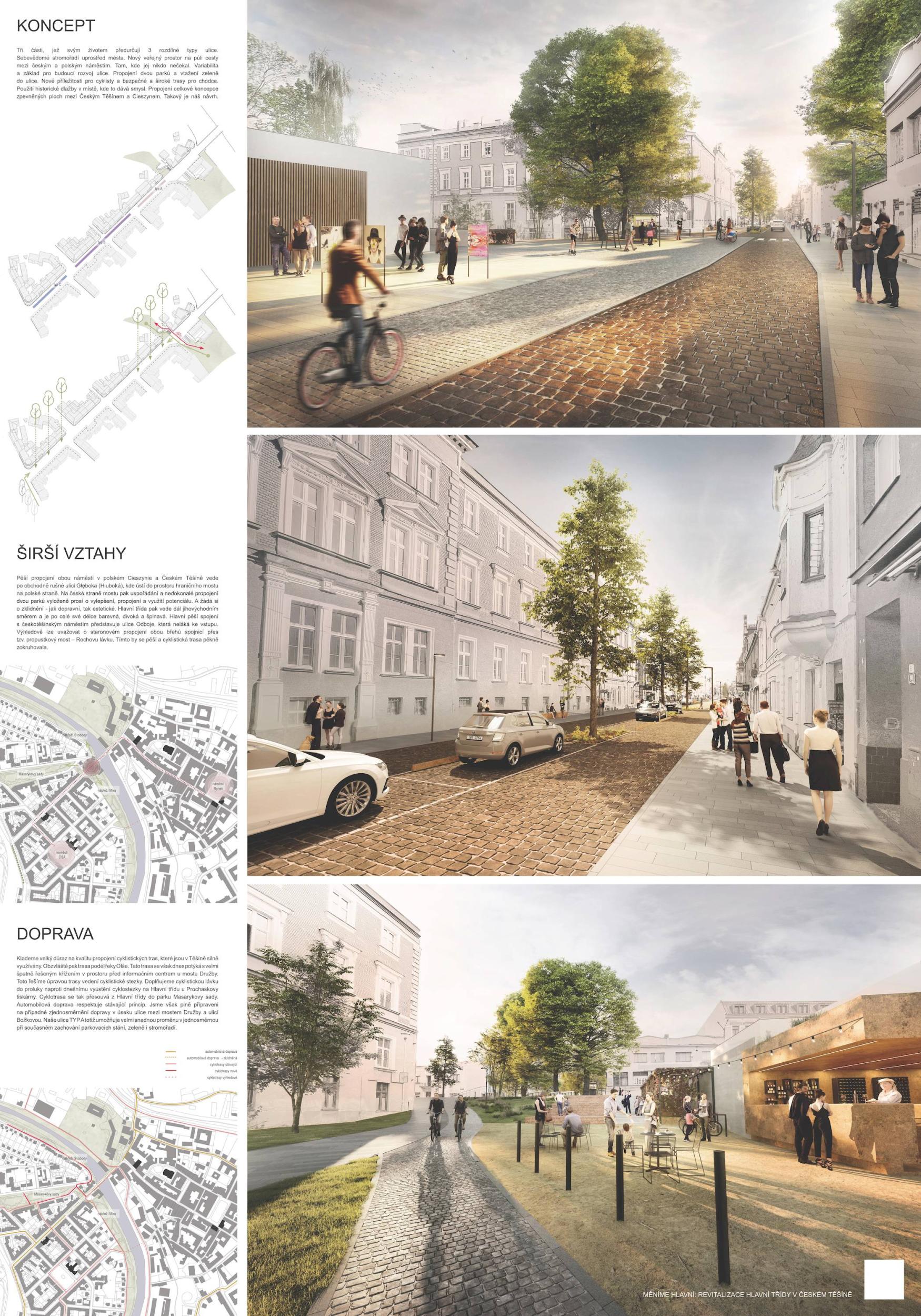 Těšínská Hlavní třída je dlouhou ulicí jednoznačně vymezenou uličními frontami. Není však ulicí jednotvárnou. V každém úseku žije jiným životem, potřebuje plnit jinou funkci a nabízí jiné možnosti. Tři části, jež svým životem předurčují 3 rozdílné typy ulice. Sebevědomé stromořadí uprostřed města. Nový veřejný prostor na půli cesty mezi českým a polským náměstím. Tam, kde jej nikdo nečekal. Variabilita a základ pro budoucí rozvoj ulice. Propojení dvou parků a vtažení zeleně do ulice. Nové příležitosti pro cyklisty a bezpečné a široké trasy pro chodce. Použití historické dlažby v místě, kde to dává smysl. Propojení celkové koncepce zpevněných ploch mezi Českým Těšínem a Cieszynem. Takový je náš návrh.