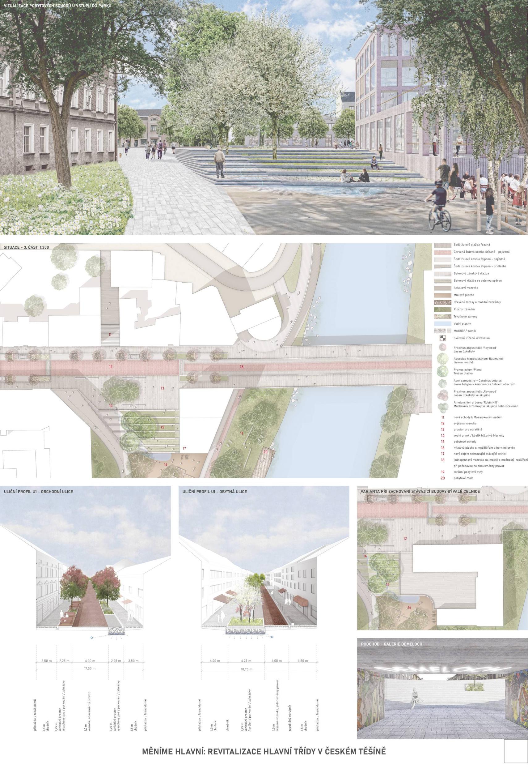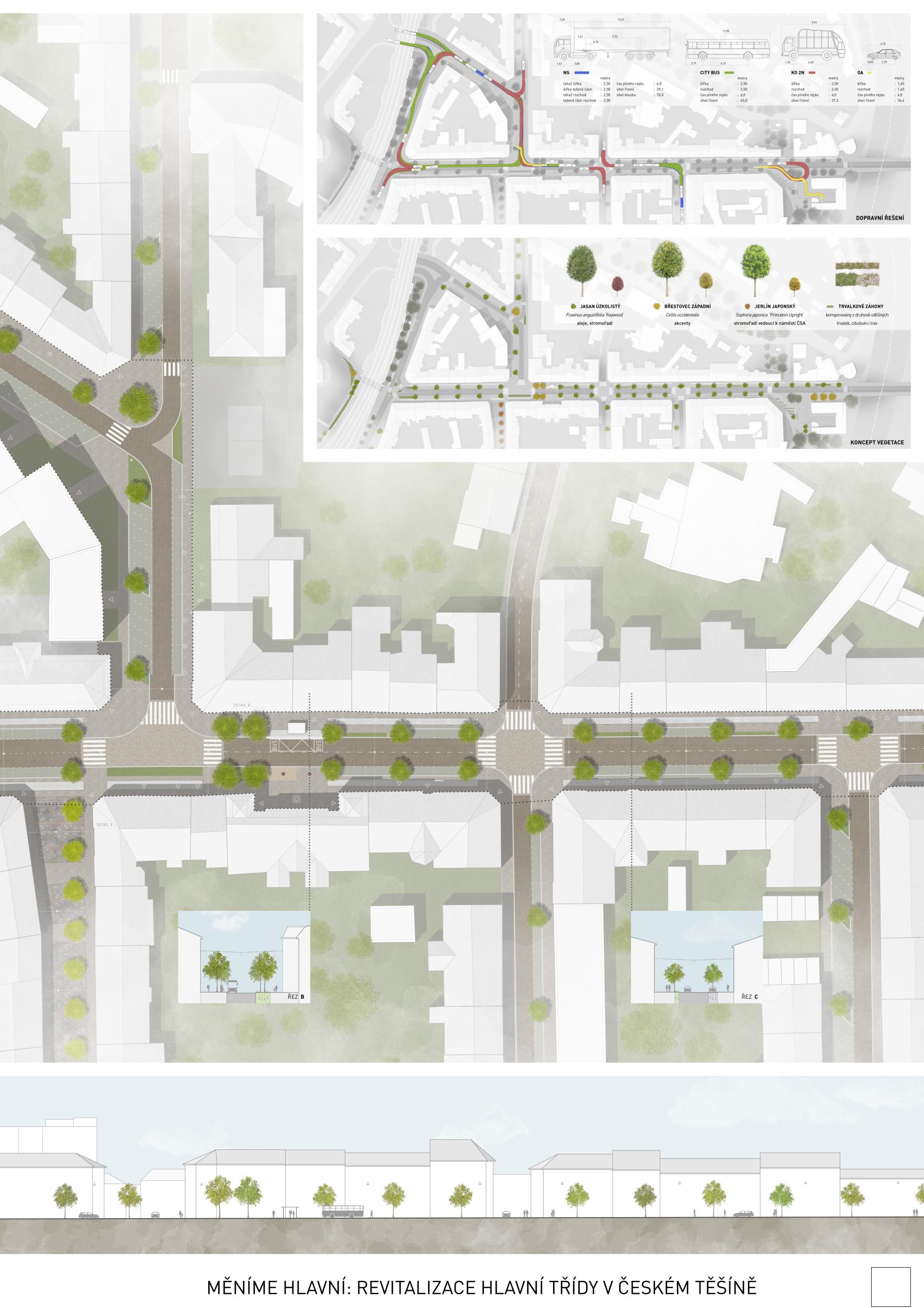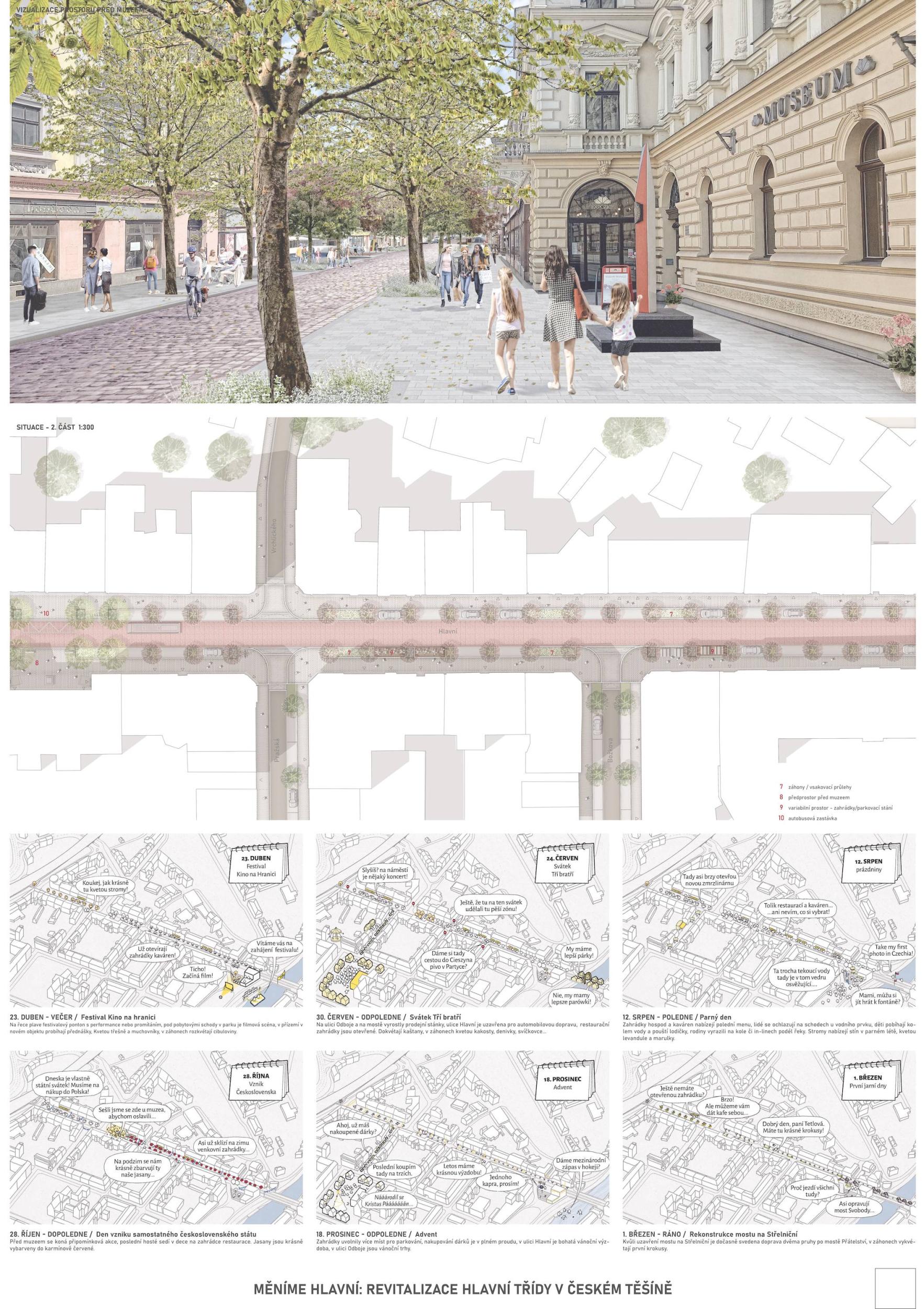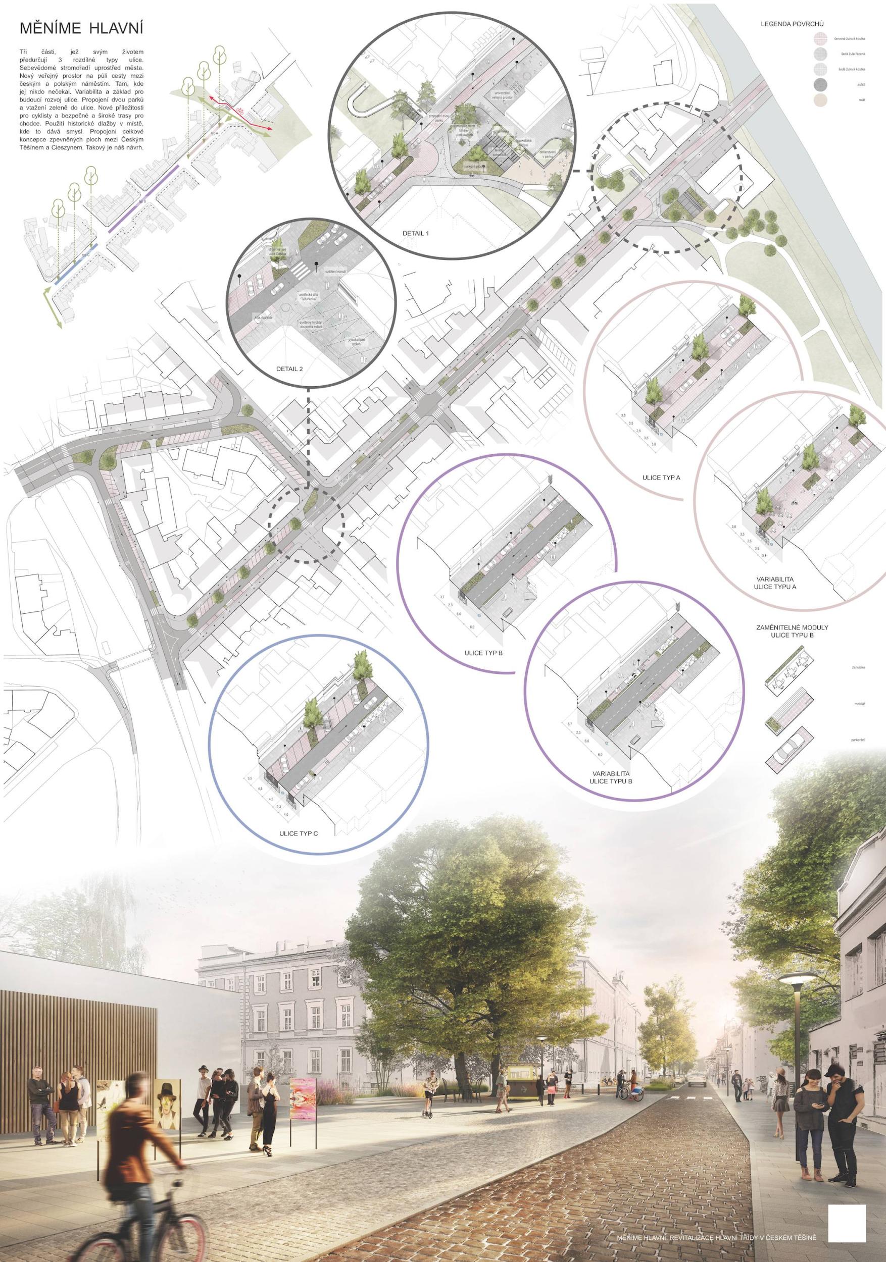 Těšínská Hlavní třída je dlouhou ulicí jednoznačně vymezenou uličními frontami. Není však ulicí jednotvárnou. V každém úseku žije jiným životem, potřebuje plnit jinou funkci a nabízí jiné možnosti. Tři části, jež svým životem předurčují 3 rozdílné typy ulice. Sebevědomé stromořadí uprostřed města. Nový veřejný prostor na půli cesty mezi českým a polským náměstím. Tam, kde jej nikdo nečekal. Variabilita a základ pro budoucí rozvoj ulice. Propojení dvou parků a vtažení zeleně do ulice. Nové příležitosti pro cyklisty a bezpečné a široké trasy pro chodce. Použití historické dlažby v místě, kde to dává smysl. Propojení celkové koncepce zpevněných ploch mezi Českým Těšínem a Cieszynem. Takový je náš návrh.