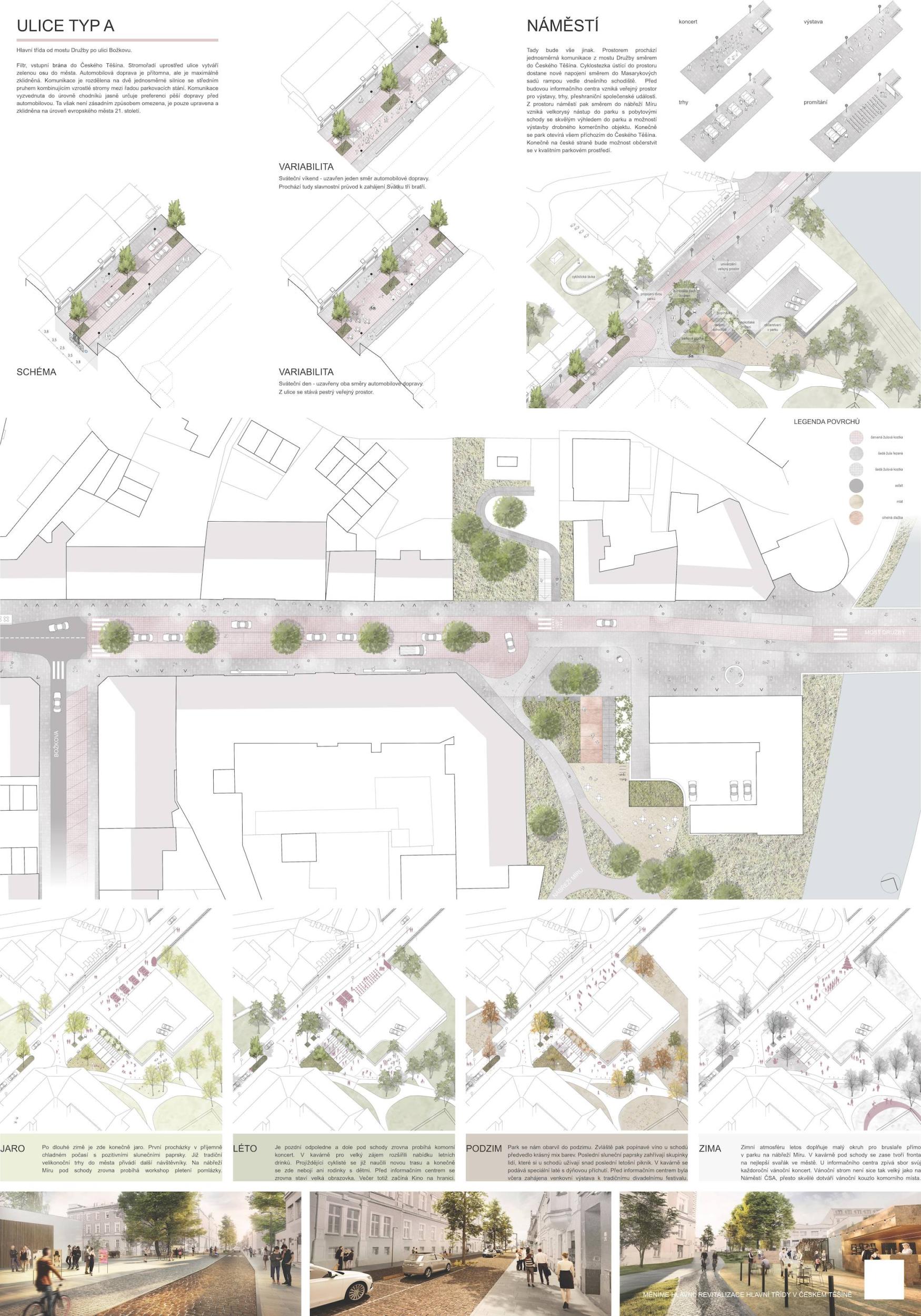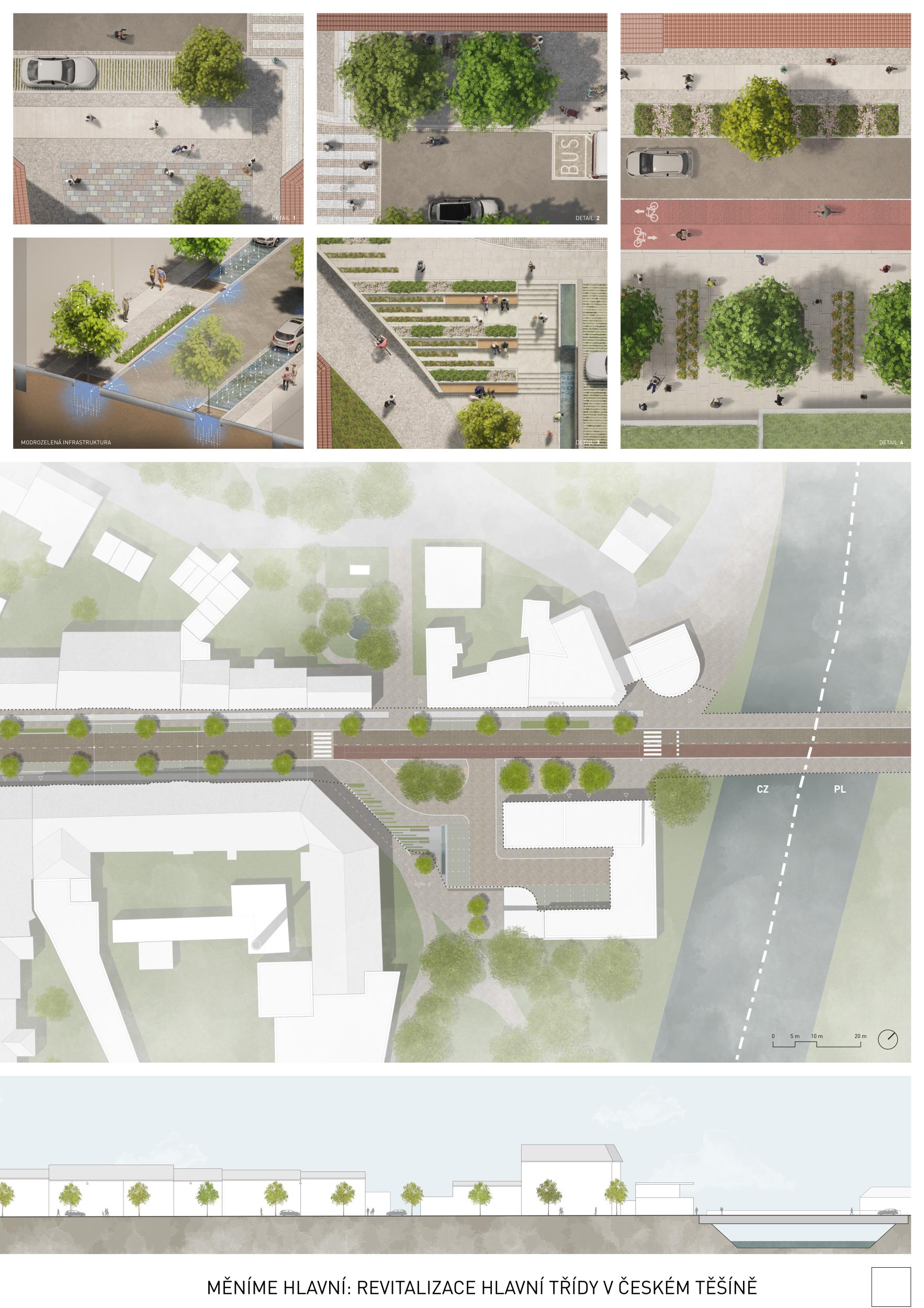 Citlivou revitalizací a doplněním jedné z klíčových tepen města jsme v návrhu vytvořili atraktivní pobytový bulvár, ve kterém ožívá jeho historie. Rezidenty města i jeho návštěvníky přivítá svou sympatickou atmosférou připomínající období první republiky se současnými prvky architektury a intervencemi, které z Hlavní třídy v Českém Těšíně vytvoří přitažlivý veřejný prostor pro všechny věkové kategorie a vyhledávané místo k setkávání odpovídající nárokům 21. století.