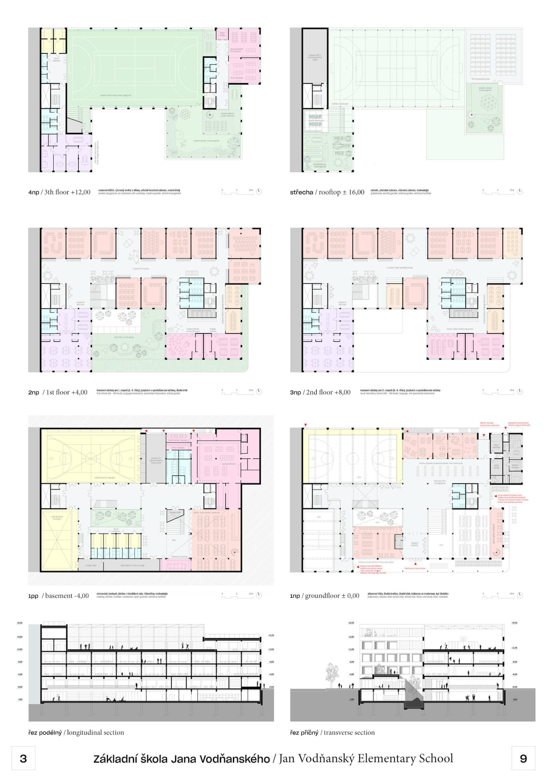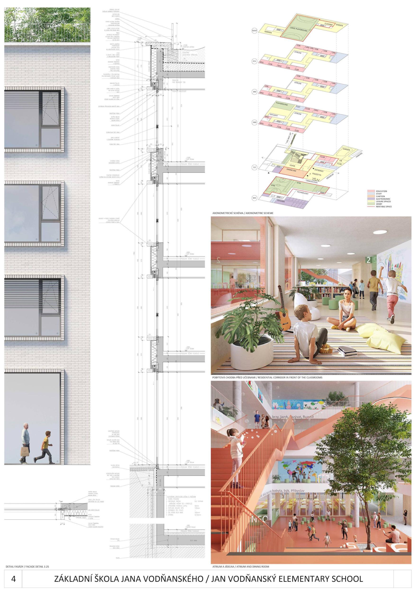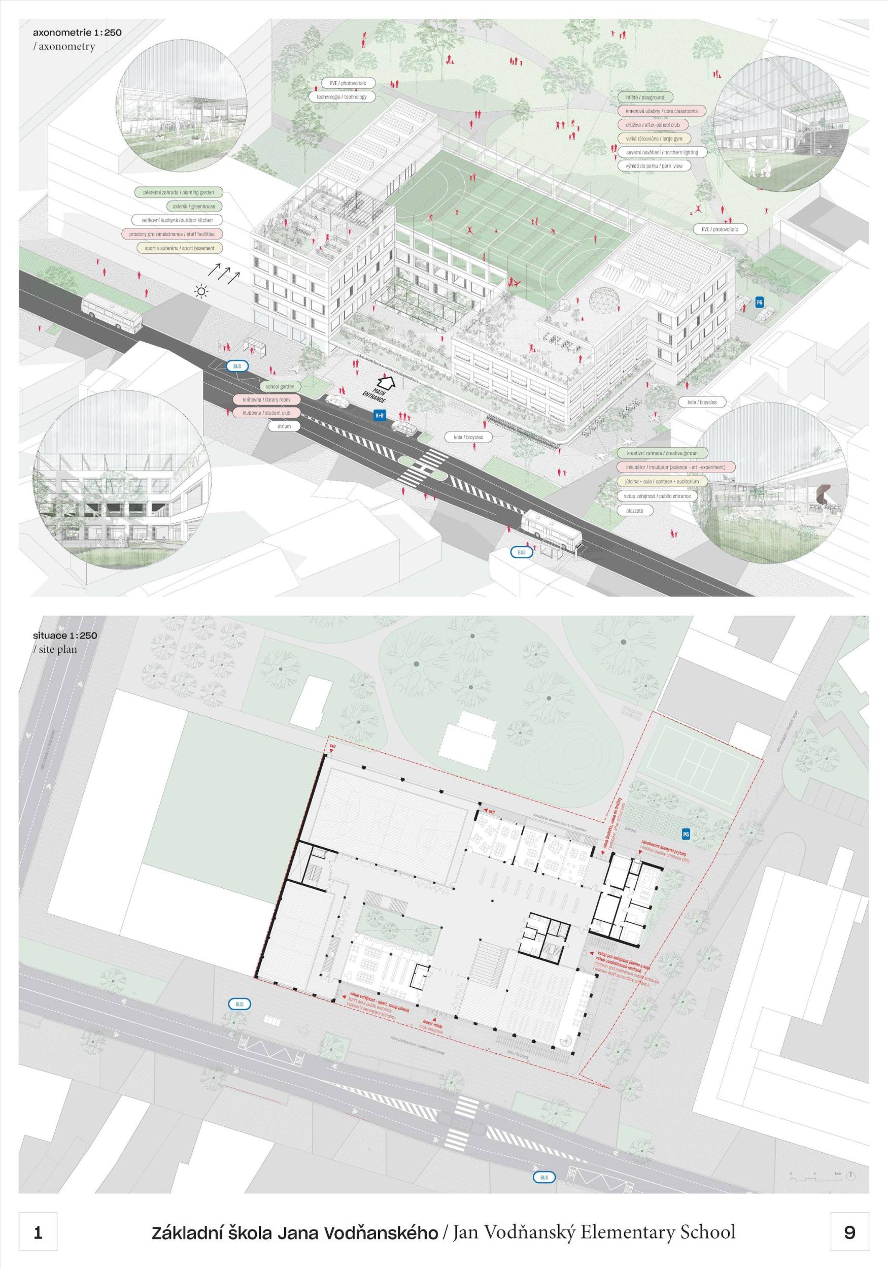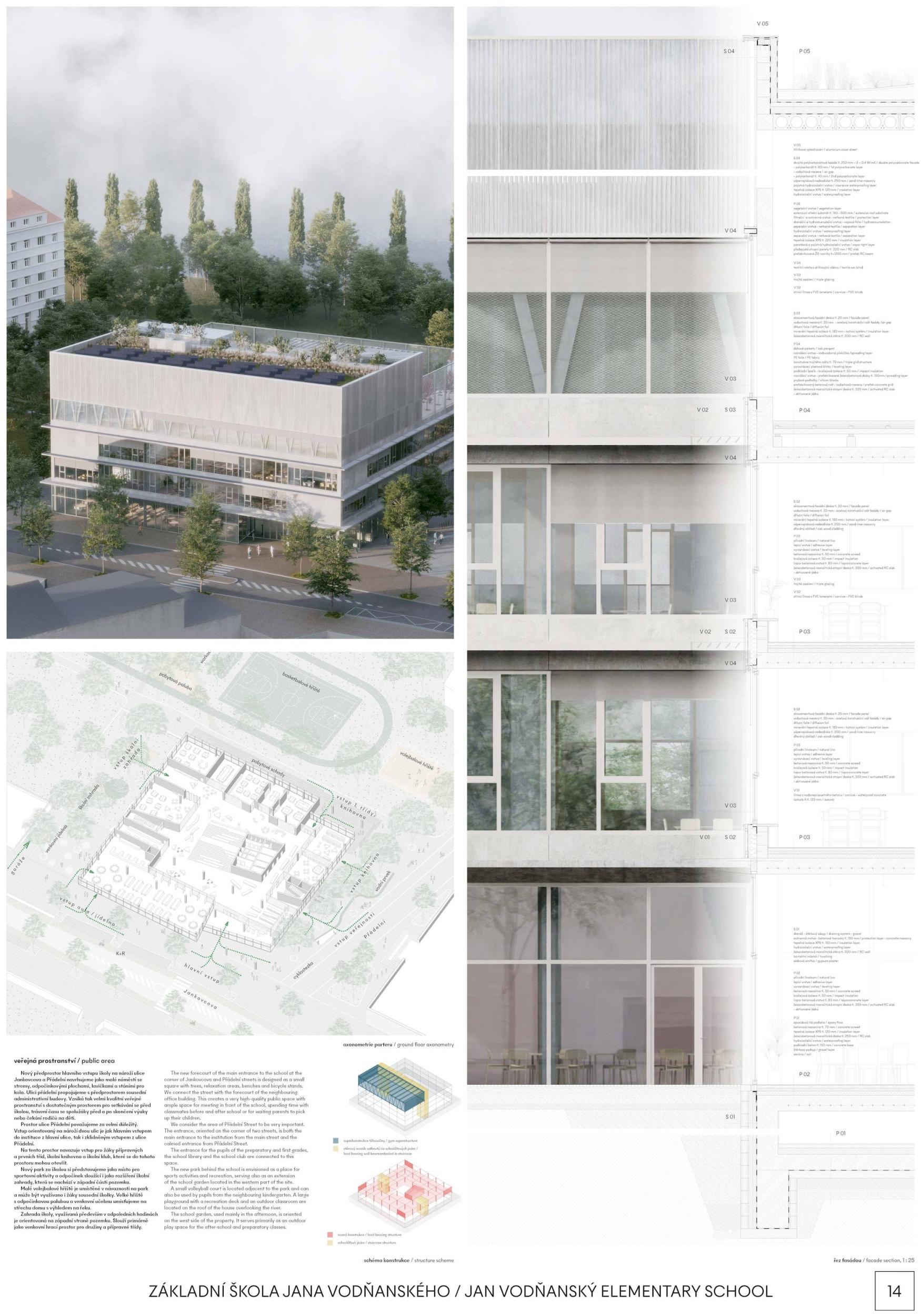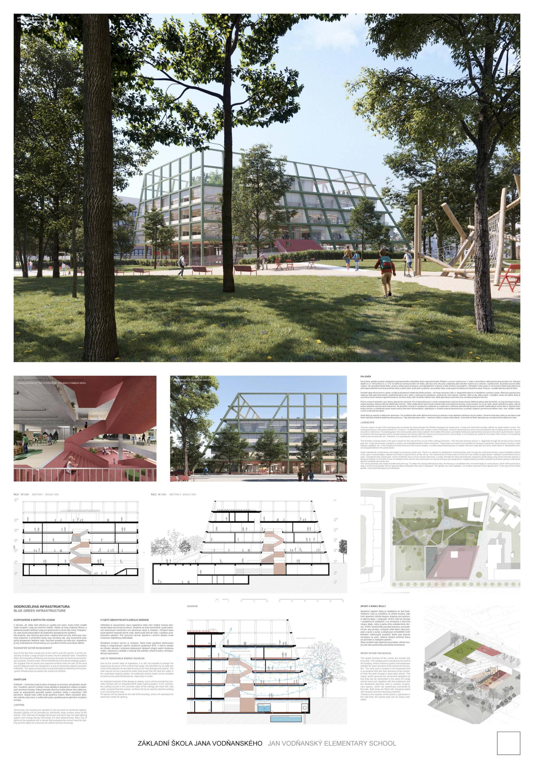V centru Prahy 7 vzniká nové centrum. Mezi stromy, podél malého parku, se jako kopec z rovinaté krajiny zvedá nová základní škola JANA VODŇANSKÉHO. Stojí tam otevřená, přívětivá a plná života! Na všech úrovních budovy, uvnitř i venku, nabízí dětem místo k učení i ke hře. Venkovní učebny na střeše, sportoviště a prostorné terasy odrážejí život uvnitř školy a oživují její okolí. Všichni jsou vítáni! Je to místo společenství nejen pro děti ze školy, ale také pro děti a obyvatele z okolí. Z urbanistického hlediska hraje budova s terasami, sportovními a zelenými plochami zvláštní roli ve svém okolí a má tvořit nové centrum pro vzdělávání a komunitu.