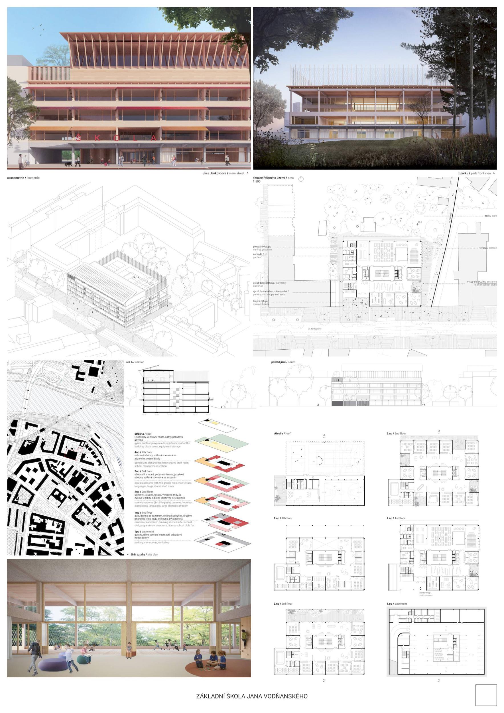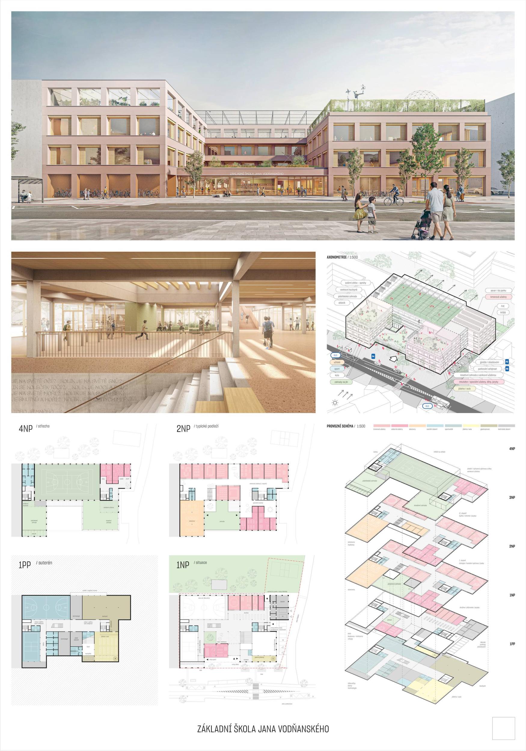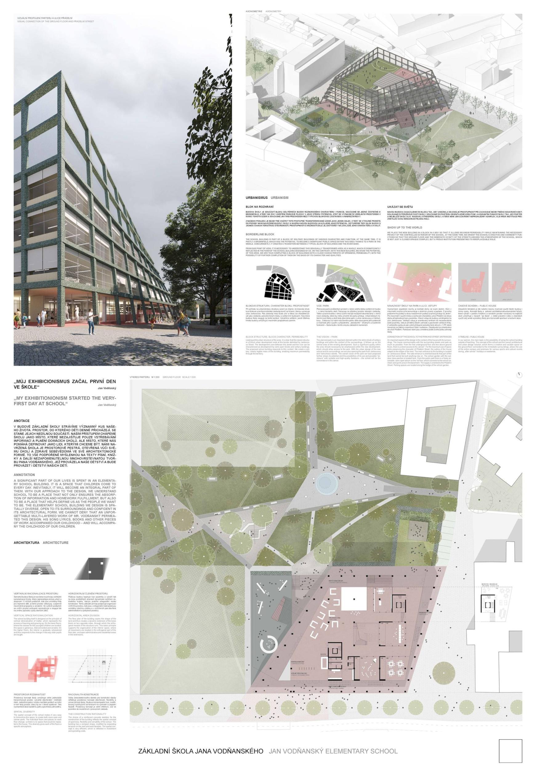 V budově základní školy strávíme významný kus našeho života. Prostor, do kterého děti denně přicházejí, se stane jejich nedílnou součástí. Naším přístupem chápeme školu jako místo, které nezajišťuje pouze vstřebávání informací a plnění domácích úkolů, ale místo, které nás pomáhá definovat jako lidi, kterými chceme být. Námi navržená škola je prostorově pestrá, otevřená vůči svému okolí a zdravě sebevědomá ve své architektonické formě. To vše podpořené myšlenkou na texty písní, knížky a další nezapomenutelnou mnohovrstevnatou tvorbu pana Vodňanského, jež provázela naše dětství a bude provázet i dětství našich dětí.