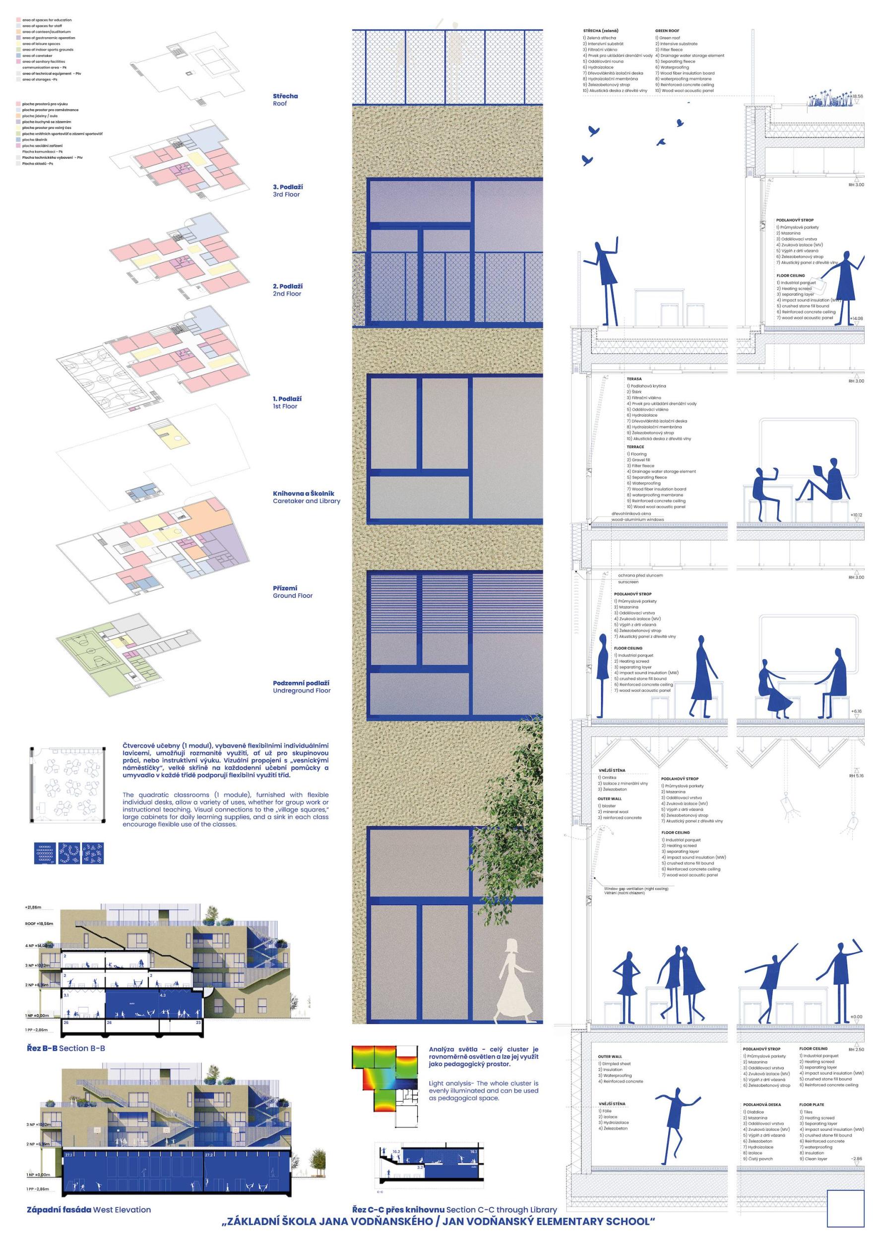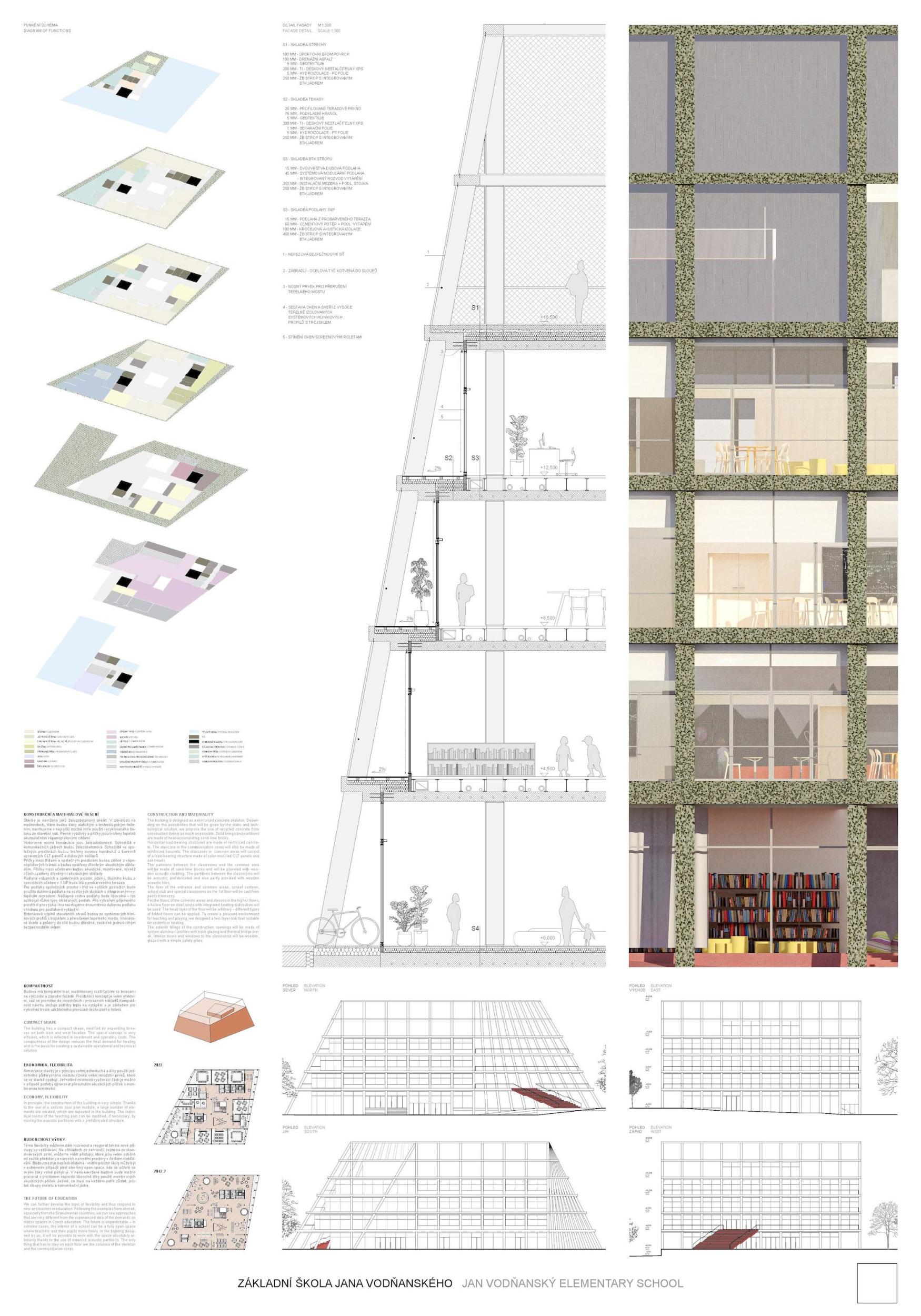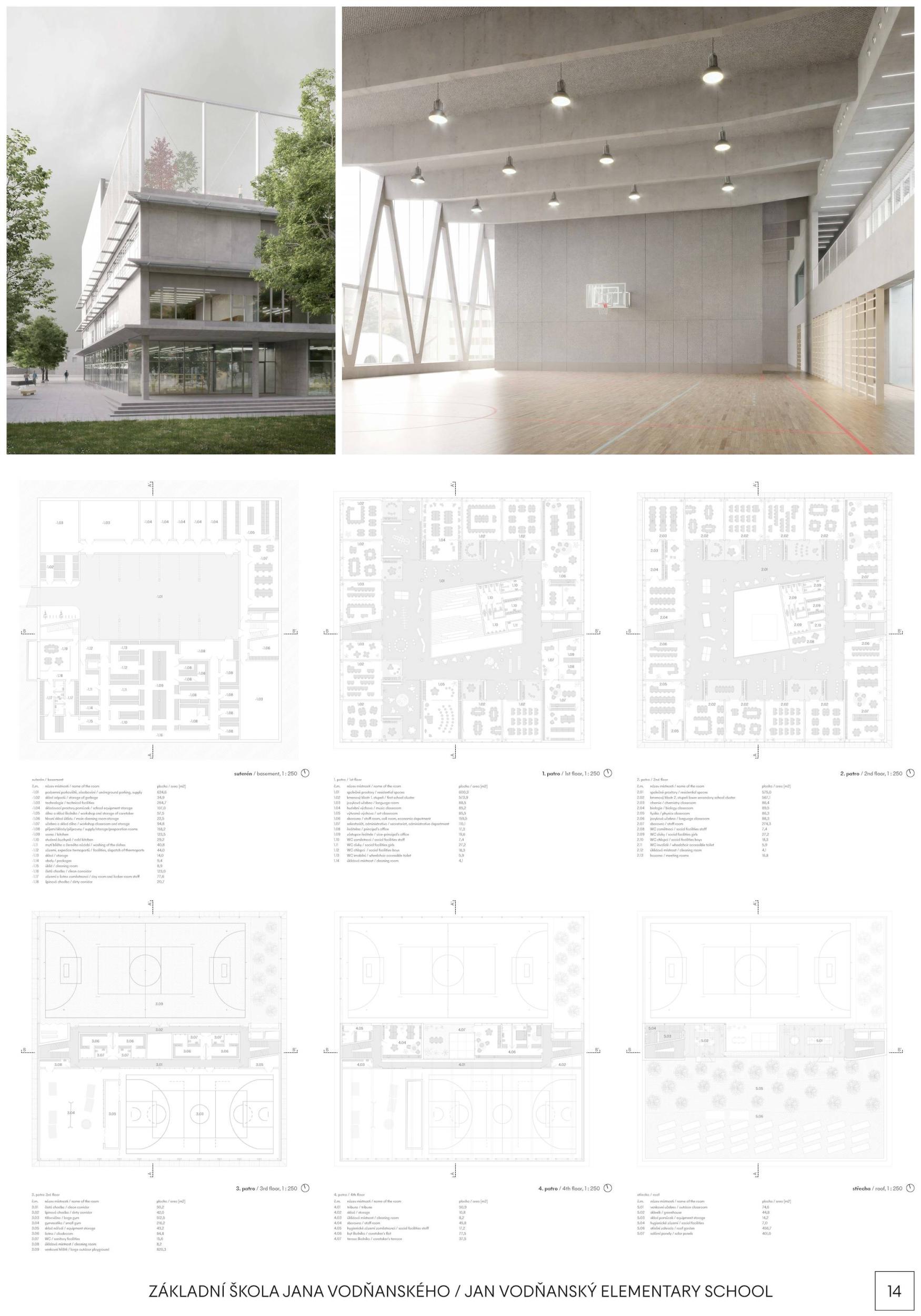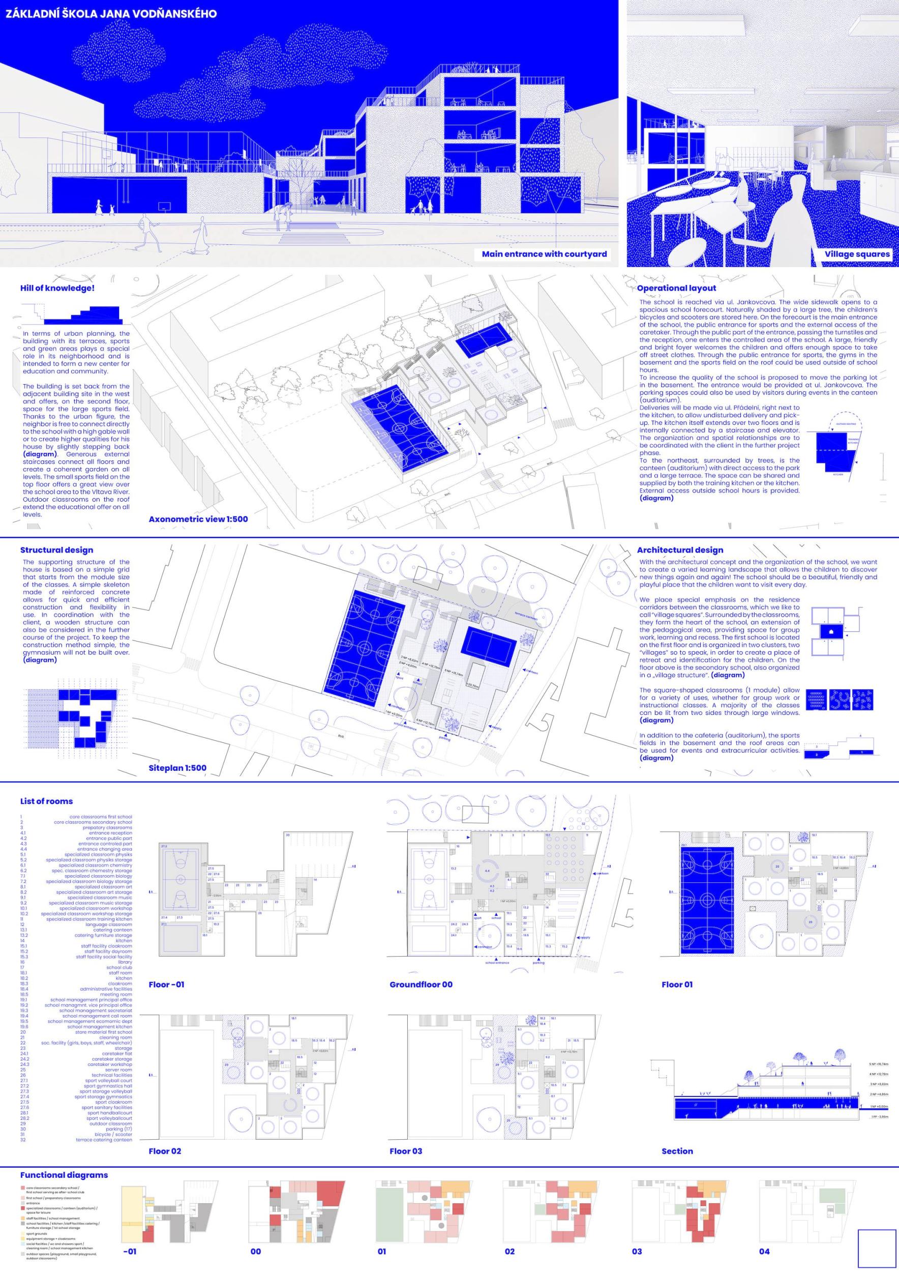 V budově základní školy strávíme významný kus našeho života. Prostor, do kterého děti denně přicházejí, se stane jejich nedílnou součástí. Naším přístupem chápeme školu jako místo, které nezajišťuje pouze vstřebávání informací a plnění domácích úkolů, ale místo, které nás pomáhá definovat jako lidi, kterými chceme být. Námi navržená škola je prostorově pestrá, otevřená vůči svému okolí a zdravě sebevědomá ve své architektonické formě. To vše podpořené myšlenkou na texty písní, knížky a další nezapomenutelnou mnohovrstevnatou tvorbu pana Vodňanského, jež provázela naše dětství a bude provázet i dětství našich dětí.