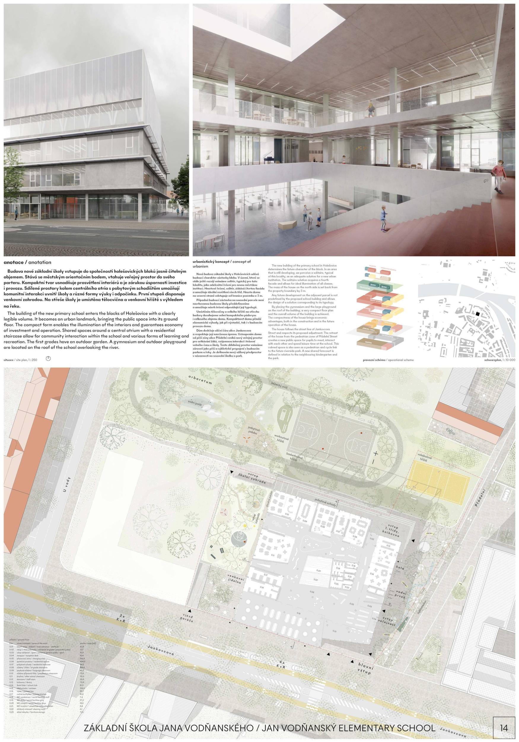 Návrh nové základní školy do Holešovic nabízí příjemné prostředí pro žáky, rodiče, učitele a další zaměstnance. Navrhované prostory neslouží pouze pro vzdělávání žáků, ale mají také inspirovat a podněcovat ke kreativitě. Velký důraz je kladen na aktivity dětí mimo vlastní výuku, kdy si osvojují především sociální dovednosti. Prostory mimo učebny nabízejí velmi širokou škálu veřejných, poloveřejných až intimních míst, a to v interiéru i exteriéru. Budova je záměrně co nejnižší, horizontální a působí klidně a solidně. V protilehlých rozích budovy jsou otevřené exteriérové plochy. Jihovýchodní otevřený roh na nároží Jankovcovy a Přádelní vítá žáky "otevřenou náručí". Skrz celý dům se vine velkorysá vertikální komunikace "cesta nahoru" s charakterem divadelního prostoru s galeriemi. Jedná se o hlavní orientační prvek budovy.