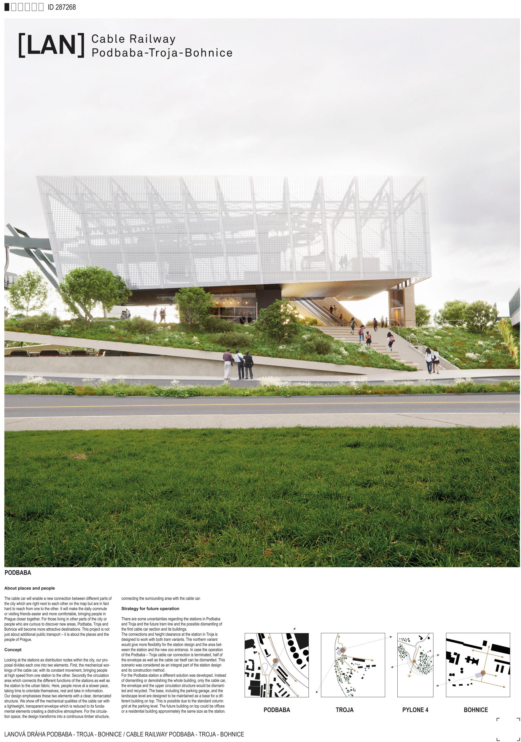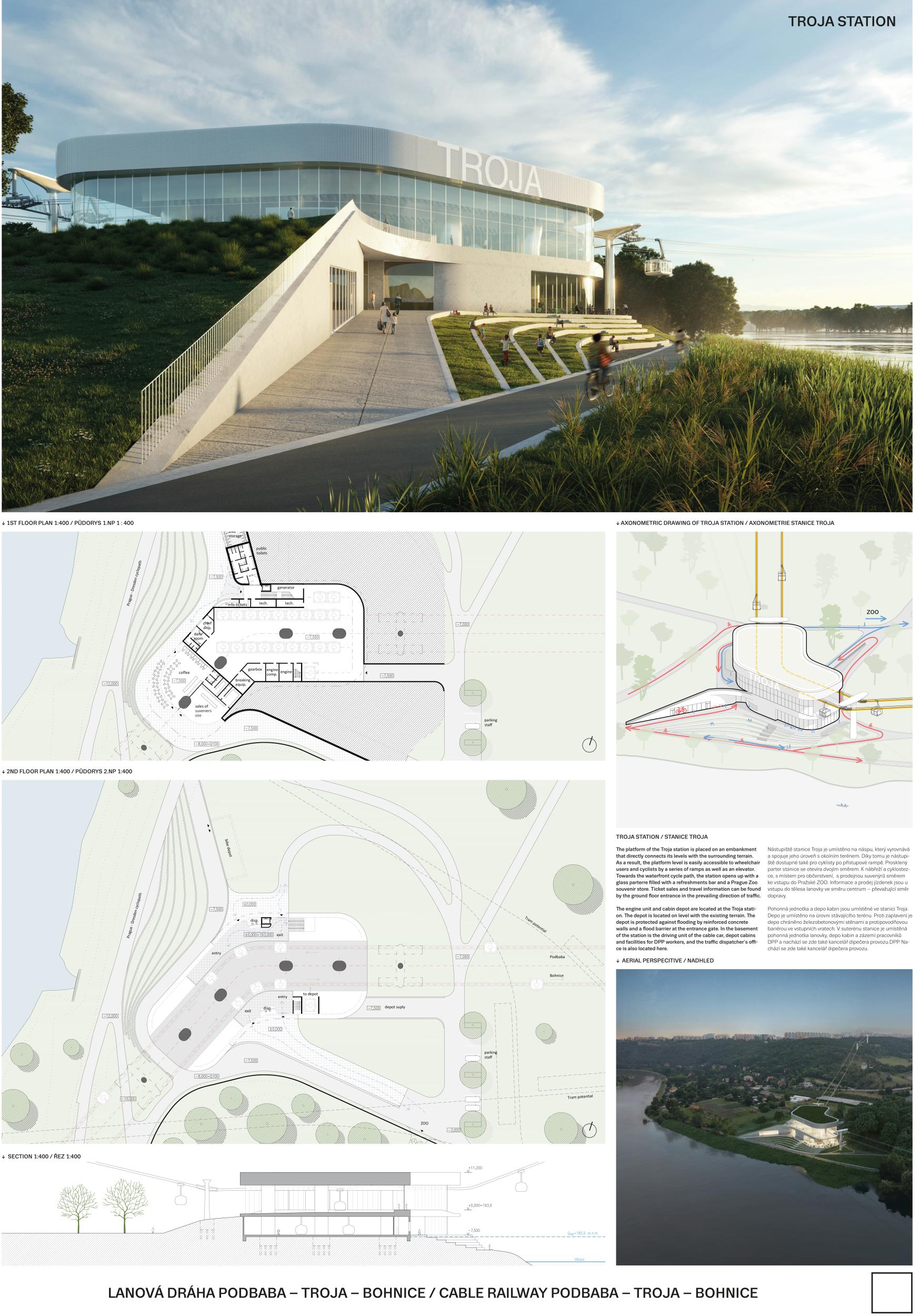 Lanová dráha propojuje pražské čtvrti Dejvice, Troju a Bohnice, překlenuje Vltavu a prochází jedním z nejvýznamnějších přírodních prvků Prahy - Trojskou kotlinou. Návrh jemně vstupuje do tohoto fascinujícího prostředí kompaktně navrženými stanicemi, jejichž střechy se průběžně proměňují a reagují na svoje bezprostřední okolí, a také návrhem jednoduchých pylonů, které v rámci jedné formy elegantně integrují veškerou potřebnou technickou infrastrukturu. Nová pražská lanová dráha je vysoce udržitelným, rychlým, efektivním ale i příjemným propojením městských čtvrtí, které Praha tak nutně potřebuje.