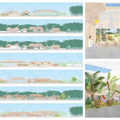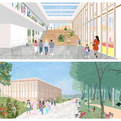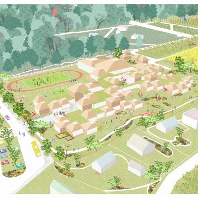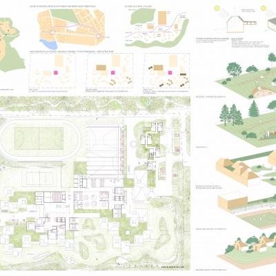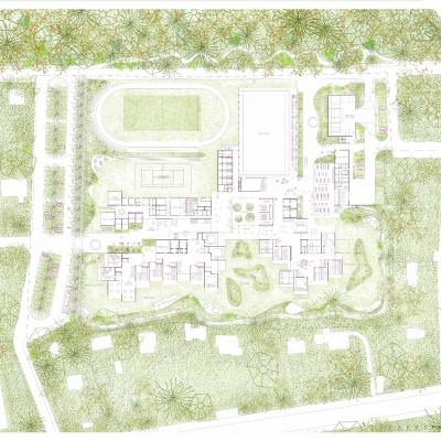 V přírodní oblasti ovlivněné lesy a jezery musí být návrh nové školy v souladu s okolním prostředím. V rámci celého komplexu jsme se rozhodli udržovat nízkou výšku budov, udržovat horizontální tvary, abychom zachovali vizuální propustnost a vztahy s krajinou ve všech směrech. Podle morfologie země se nové osídlení rozvíjí ve dvou různých úrovních, vyšší je na severní straně a nižší na jižní straně a je spojeno systémem interiérových / exteriérových ramp.
