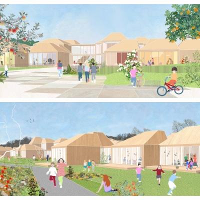 Nový přístup ke vzdělávání dětí vyžaduje svébytnou architektonickou formu. Navrhujeme školu atriovou přízemní, bez bariér, školu, která umožní dětem učit se i trávit přestávky venku a zároveň v bezpečí jejich zdí. Neuzavírá se však sama do sebe. Areál je umístěný v krásném prostředí na hraně lesa, škola je s ním v maximálním vizuálním kontaktu, otevírá se též do nového parku s hřišti a sadem, který využije i veřejnost. Budovy jsou navrženy jako dřevěné rámové skelety. Dřevo je patrné vně i uvnitř a spolu se zelenými střechami se začleňuje do kontextu místa.