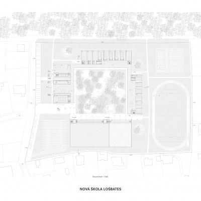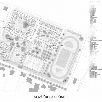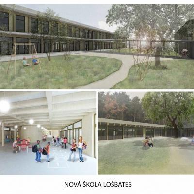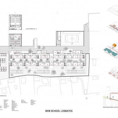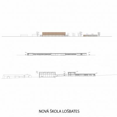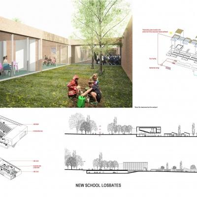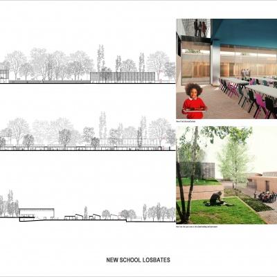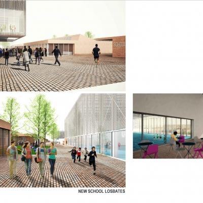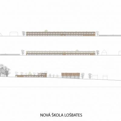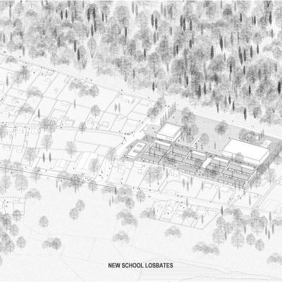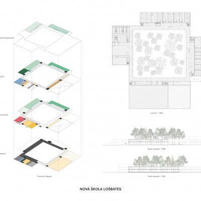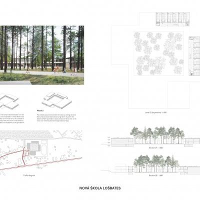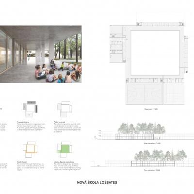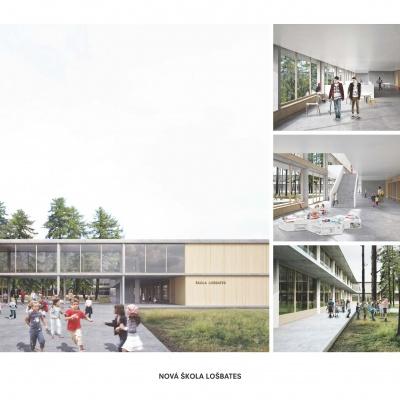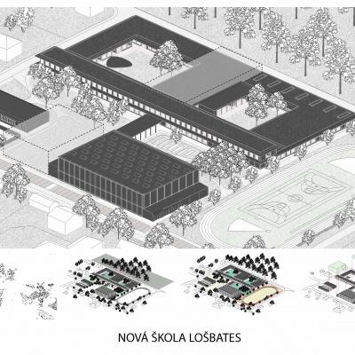 Lesní klášter Cílem školy je vytvořit nové srdce a symbol pro sjednocení LOŠBATES. Návrh je koncipován jako otevřený klášter, kloubový multifunkční prstenec spojující čtyři oddělené klastry do koherentní podoby kolem malého lesíku. Tento klášter je vizuálně i funkčně flexibilní. Slouží jako vstup, jako chodba, jako krytá venkovní plocha, jako prostor pro shromažďování, jako neformální třída a mnohem více. Na rozdíl od tradičního kláštera je otevřený a propustný.