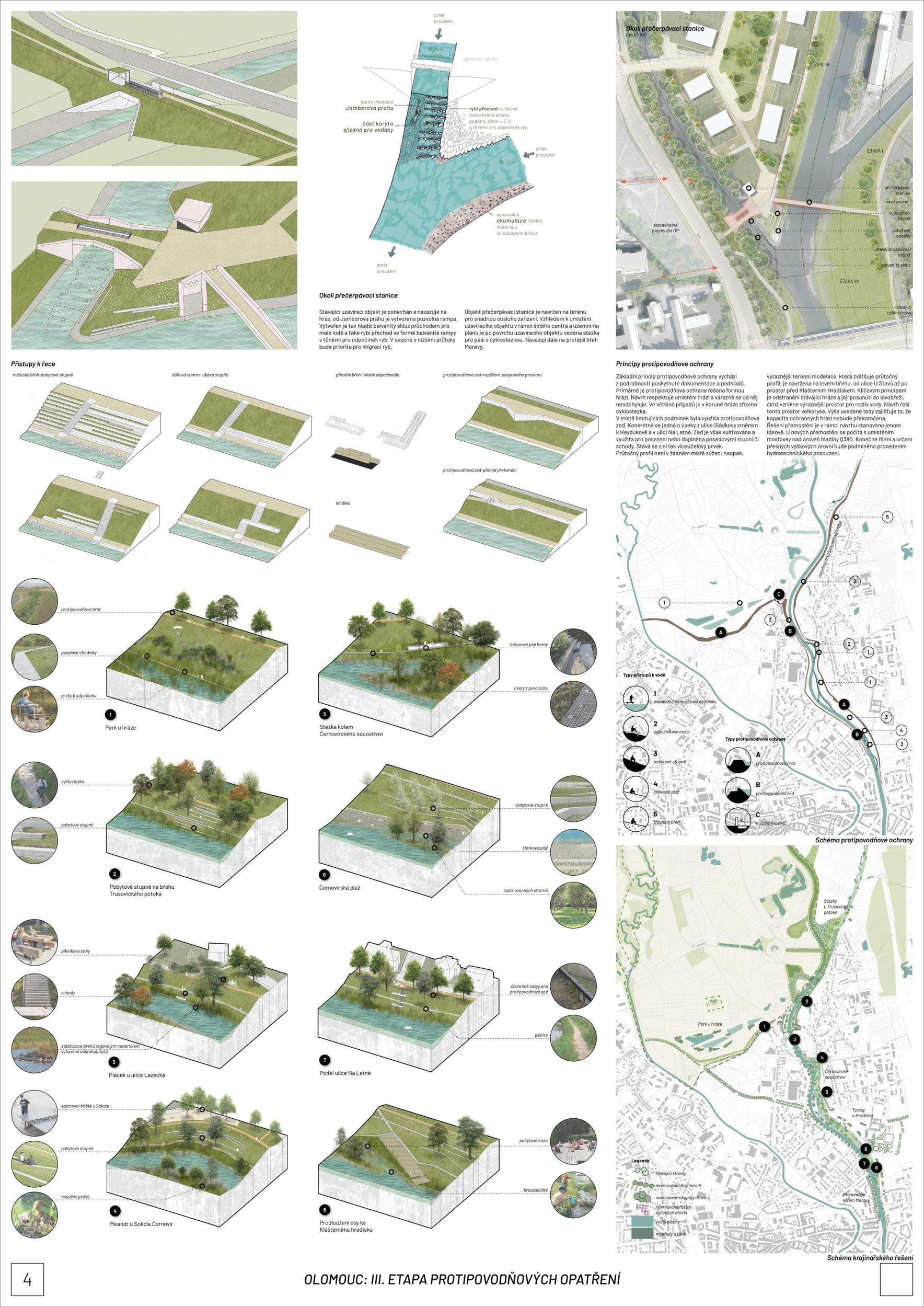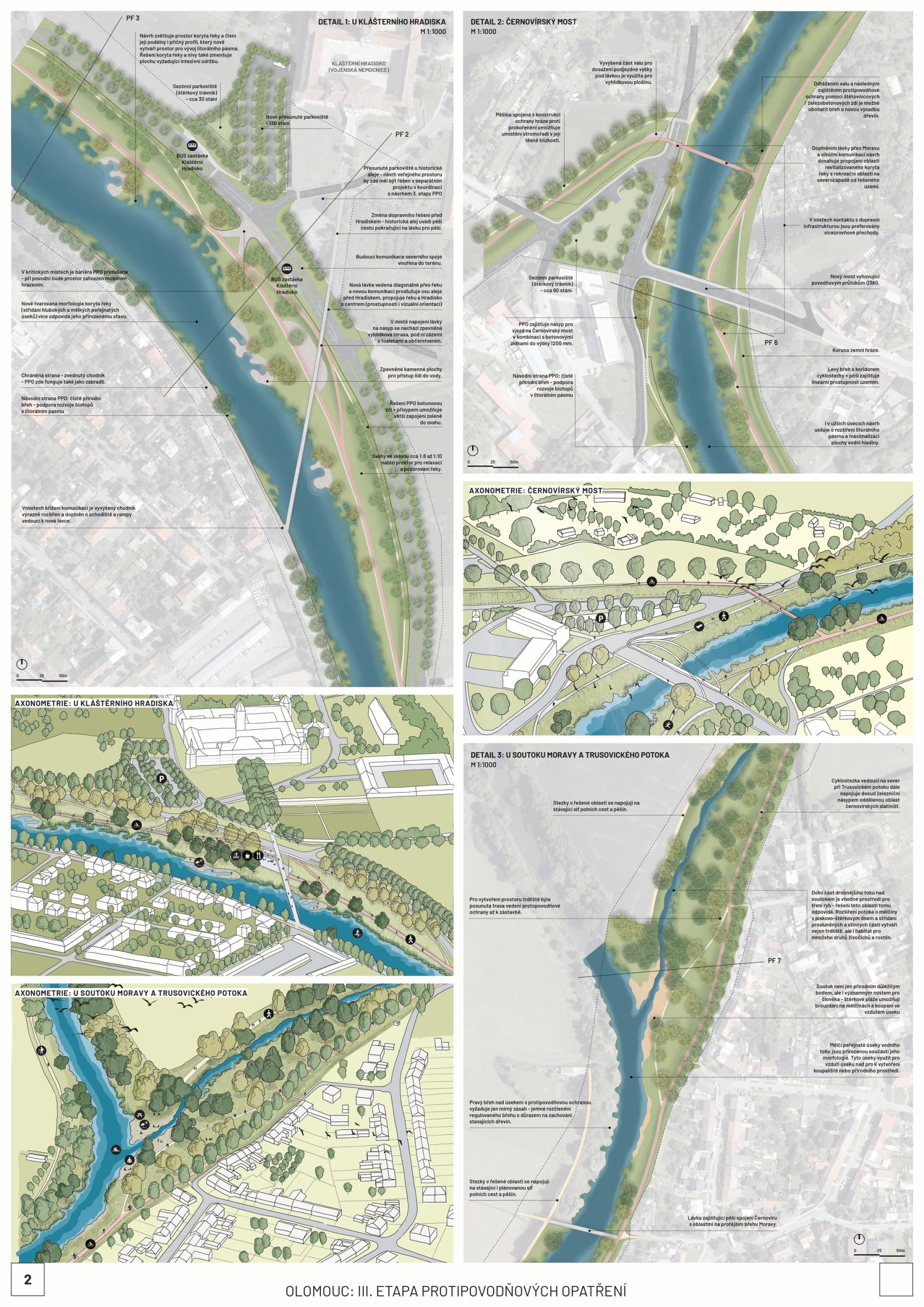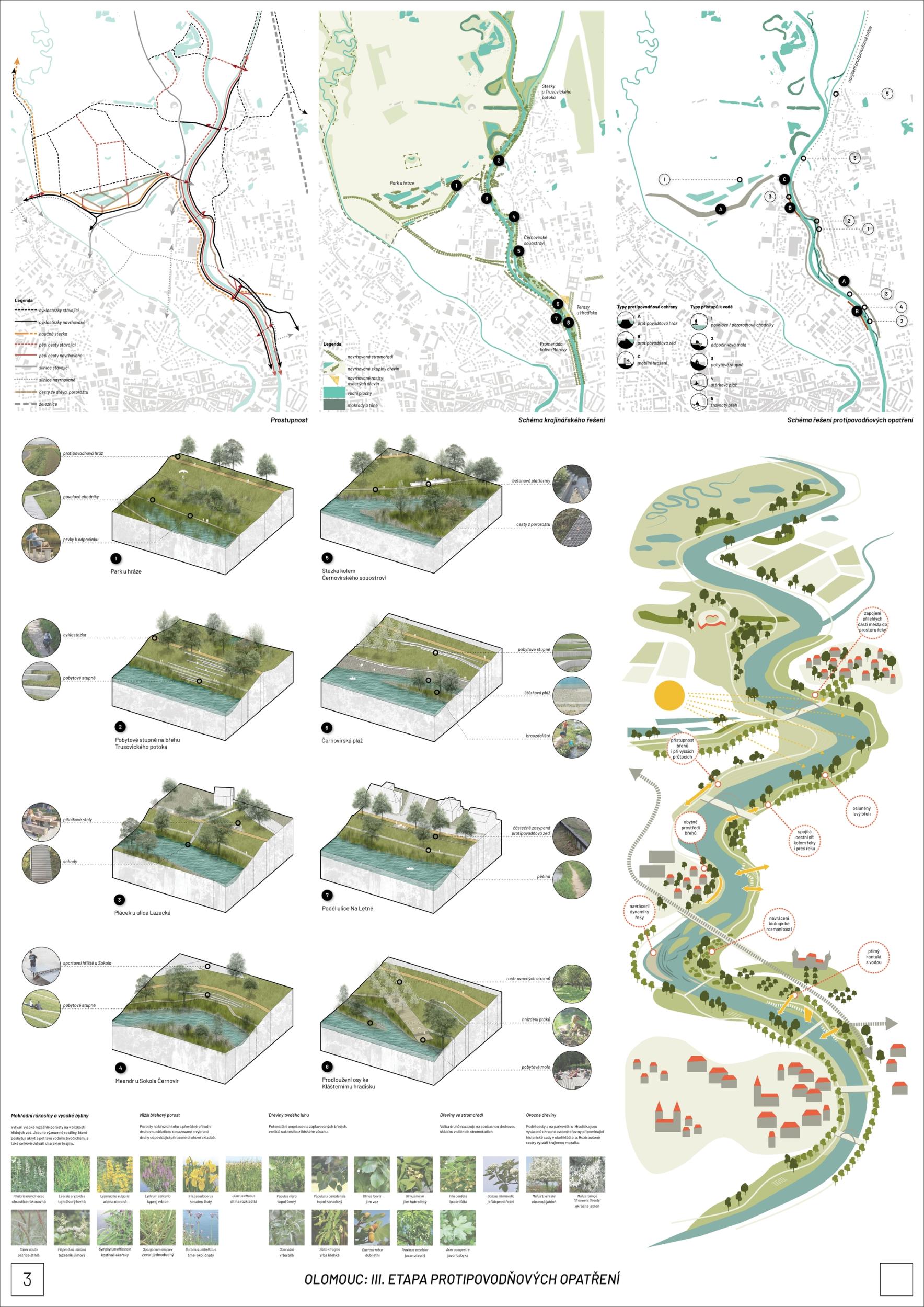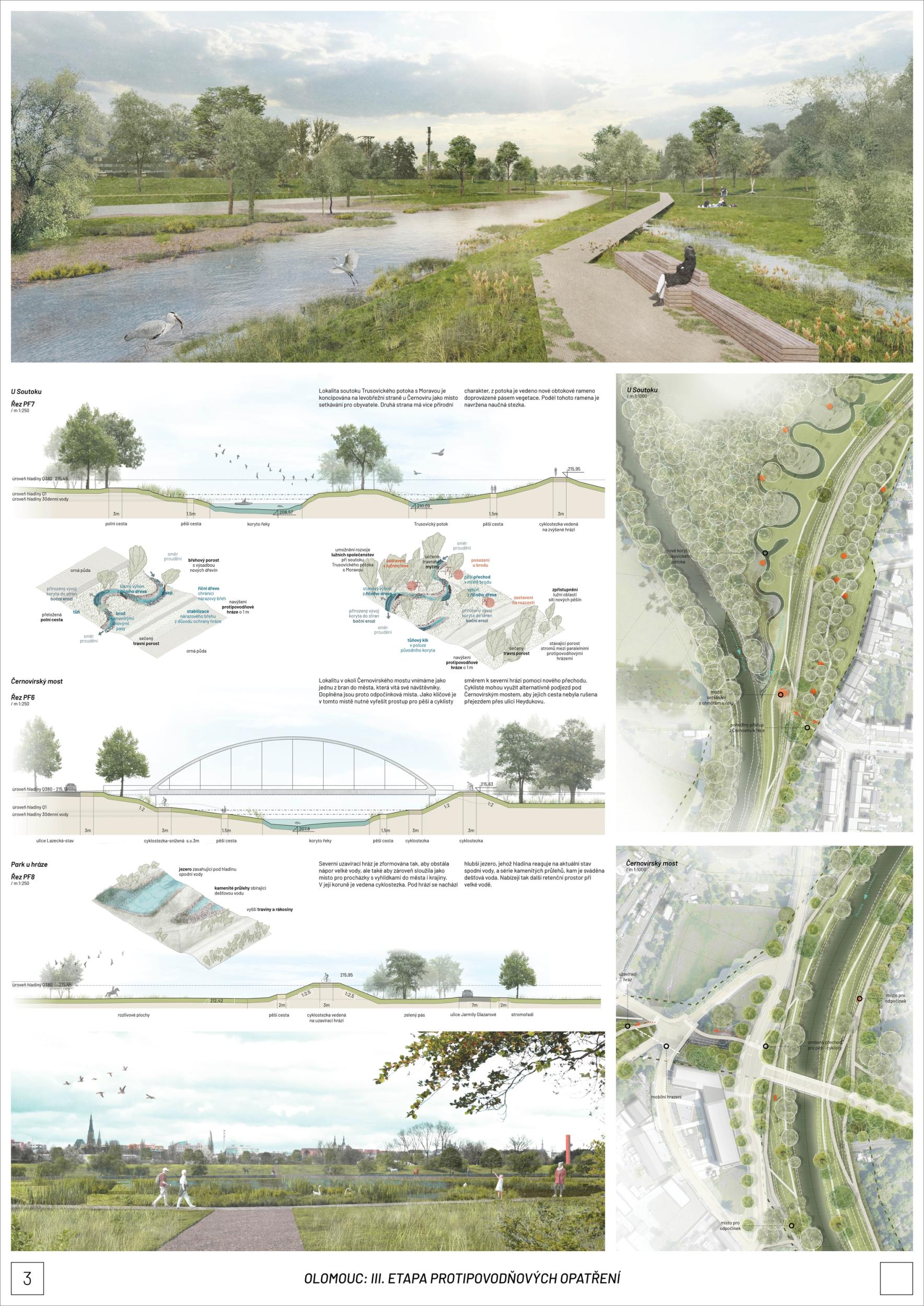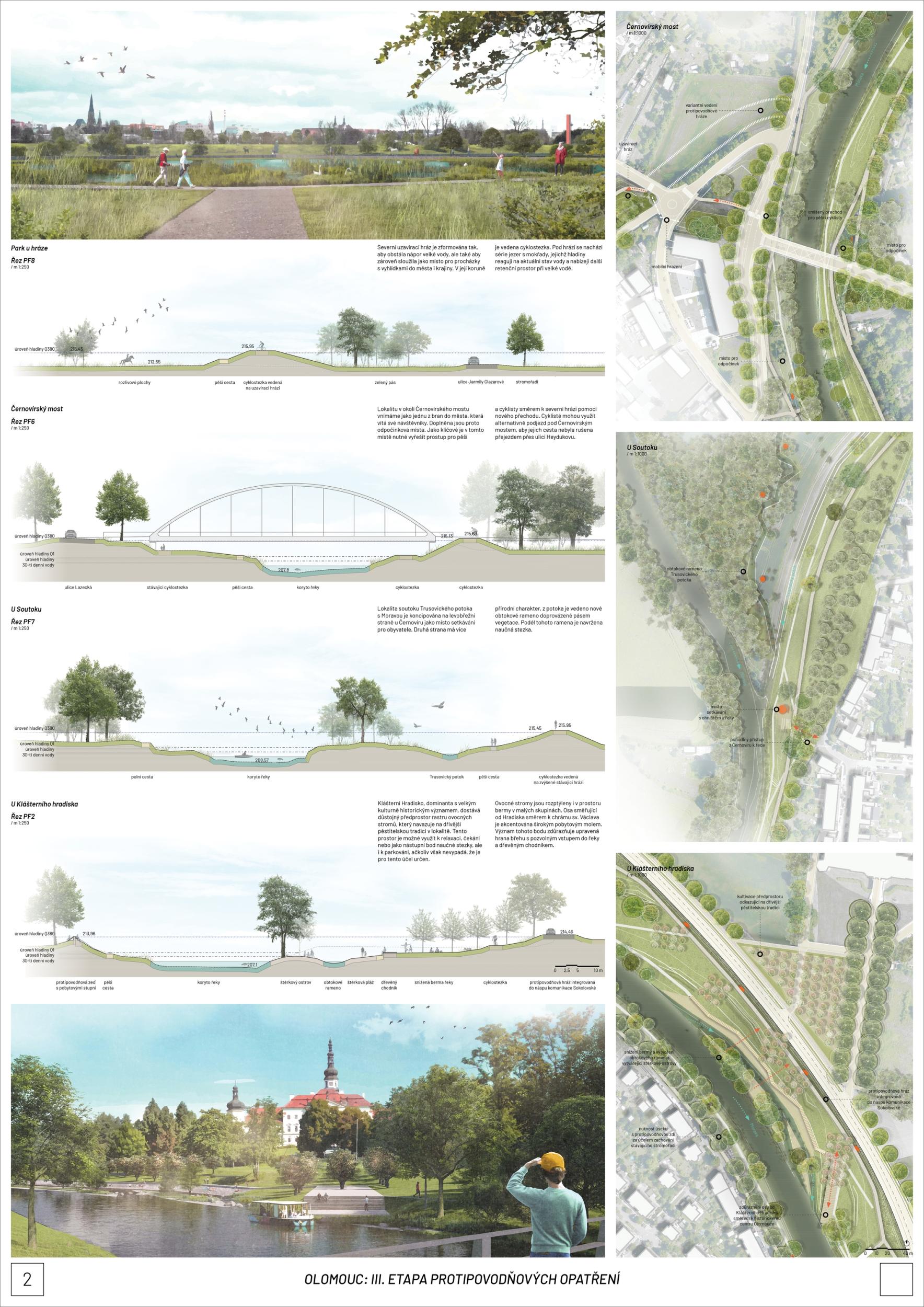 Návrh, který získal druhou cenu, vykazuje střídmý a racionální přístup k řešení území. Mezi jeho největší přednosti patří zejména práce s trasováním ramene Moravy a využitím jeho potenciálu k ochraně zástavby před povodněmi. Přestože na první pohled působí návrh stroze, naplňuje požadavky na přírodě blízké řešení zásahů v kombinaci s vhodnou morfologií řeky. Jedním z hlavních přínosů návrhu je jeho schopnost využít území k přirozenému rozlivu povodní bez nadměrného použití betonových prvků. Řešení se vyhýbá zbytečným revitalizačním zásahům a klade důraz na maximální využití přírodních prvků. Tento přístup podporuje přirozený charakter lokality a také minimalizuje škody při průchodu povodně. V rekreačním kontextu návrh funguje především jako parková plocha. Navrženy jsou různé možnosti pohybu podél řeky – stezky na každém břehu jsou koncipovány odlišně, což umožňuje jejich různé zaměření na chodce nebo cyklisty. Potenciál řeky jako veřejného prostoru je využit v několika místech, která jsou tomu morfologicky přizpůsobena, například v rozšířeních či na ostrovech. Střídmá náplň programu v koridoru řeky jej po povodni dělá relativně lehce obnovitelný, a to s nízkými náklady a v relativně krátkém časovém období. Návrh se nicméně potýká s některými slabinami. Přes extenzivní grafické vyjádření v podobě vizualizací území je čitelnost jeho myšlenek a záměrů obtížná. Absence srozumitelnosti celkového konceptu i některých jeho detailních částí bohužel ponechává řadu aspektů na volné interpretaci. Přístup k navrhovanému řešení je relativně mechanický – v některých částech připomíná spíše vyseknutý koridor bez urbanistické návaznosti na okolní lokality a město. Volba umístění jednotlivých aktivních prvků v návrhu (amfiteátr, workoutové zóny apod.) postrádá logické opodstatnění v širším kontextu. Další problematickou oblastí je přístaviště, jehož samotná funkce je sice žádaná, ale kapacitně a architektonicky je v návrhu předimenzovaná. Podobně naddimenzovaný je i amfiteátr, jehož měřítko nepůsobí citlivě vůči krajině. Z hlediska architektonických prostředků návrh pracuje s vhodnými principy, ale jejich konkrétní ztvárnění není zcela přesvědčivé. Celkově se jedná o solidní návrh, jehož hlavními přednostmi jsou respekt k přirozené morfologii řeky a promyšlené trasování, které umožňuje rekreační využití. Díky tomu jsou budoucí provozní náklady minimální. Slabší stránkou je jeho obtížná čitelnost, mechanický přístup k řešení, nevyvážené měřítko a zpracování některých prvků a chybějící propojení s okolím. I přes tyto nedostatky návrh představuje řešení s velmi vhodně vyřešenými protipovodňovými opatřeními a udržitelným přístupem k území, které má potenciál pozitivně přispět k rozvoji poříčního prostoru ve městě.