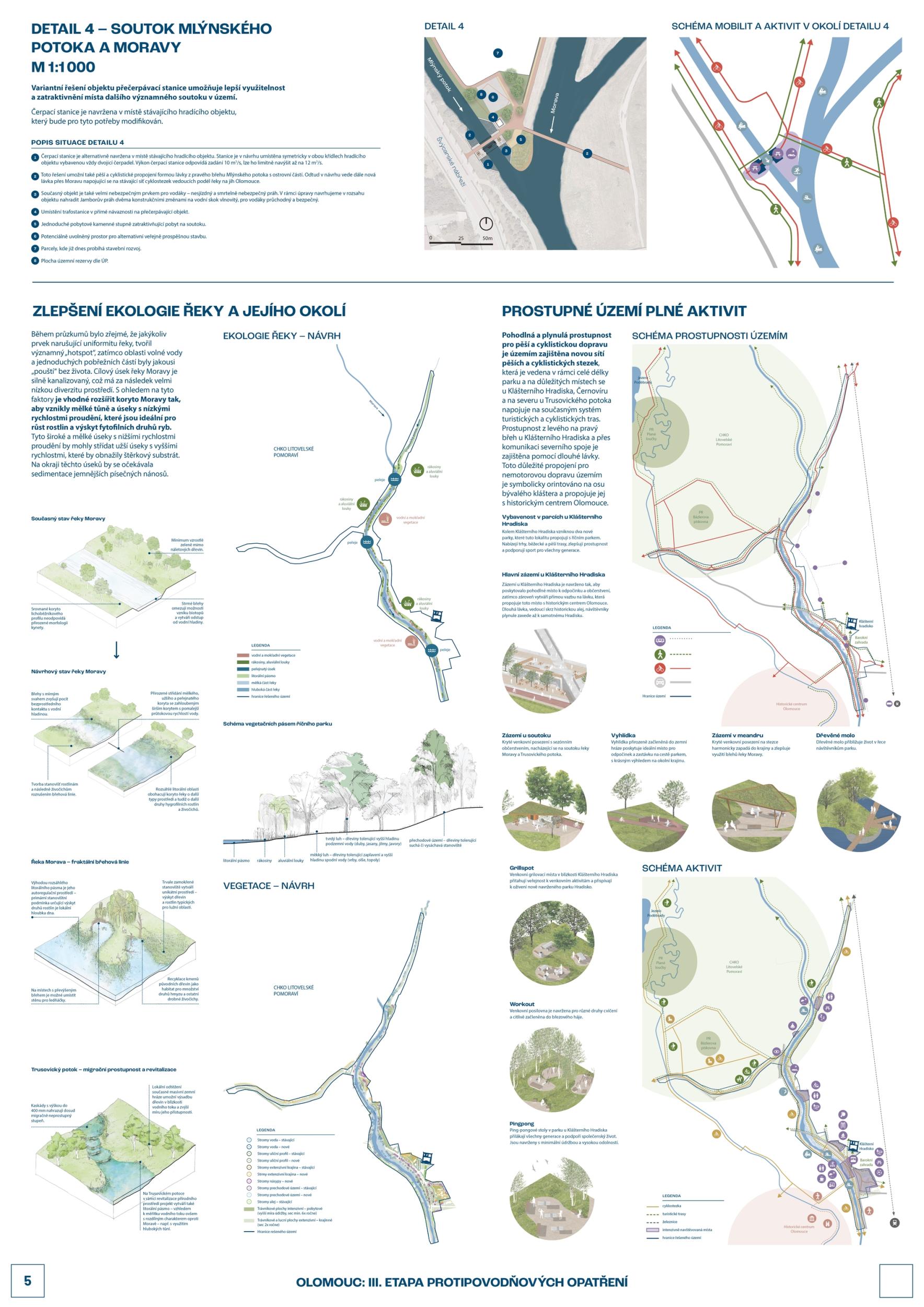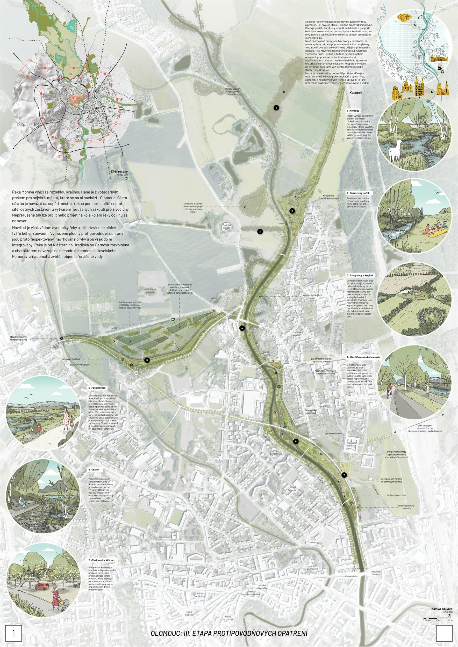 Řeka Morava vlnící se rozlehlou krajinou Hané je životadárným prvkem pro největší město, které se na ní nachází - Olomouc. Cílem návrhu je navázat na sepětí města s řekou pomocí spojité cestní sítě, četných zastavení a vytváření nerušených zákoutí pro živočichy. Nepřerušeně tak lze projít nebo projet na kole kolem řeky od jihu až na sever. Návrh si je však vědom dynamiky řeky a její odvrácené ničivé tváře během povodní. Vymezené plochy protipovodňové ochrany jsou proto respektovány, navrhované prvky jsou však do ní integrovány. Řeka je od Klášterního Hradiska po Černovír rozvolněna a charakterem navazuje na meandrující ramena Litovelského Pomoraví a napomáhá zvětšit objem přenášené vody.