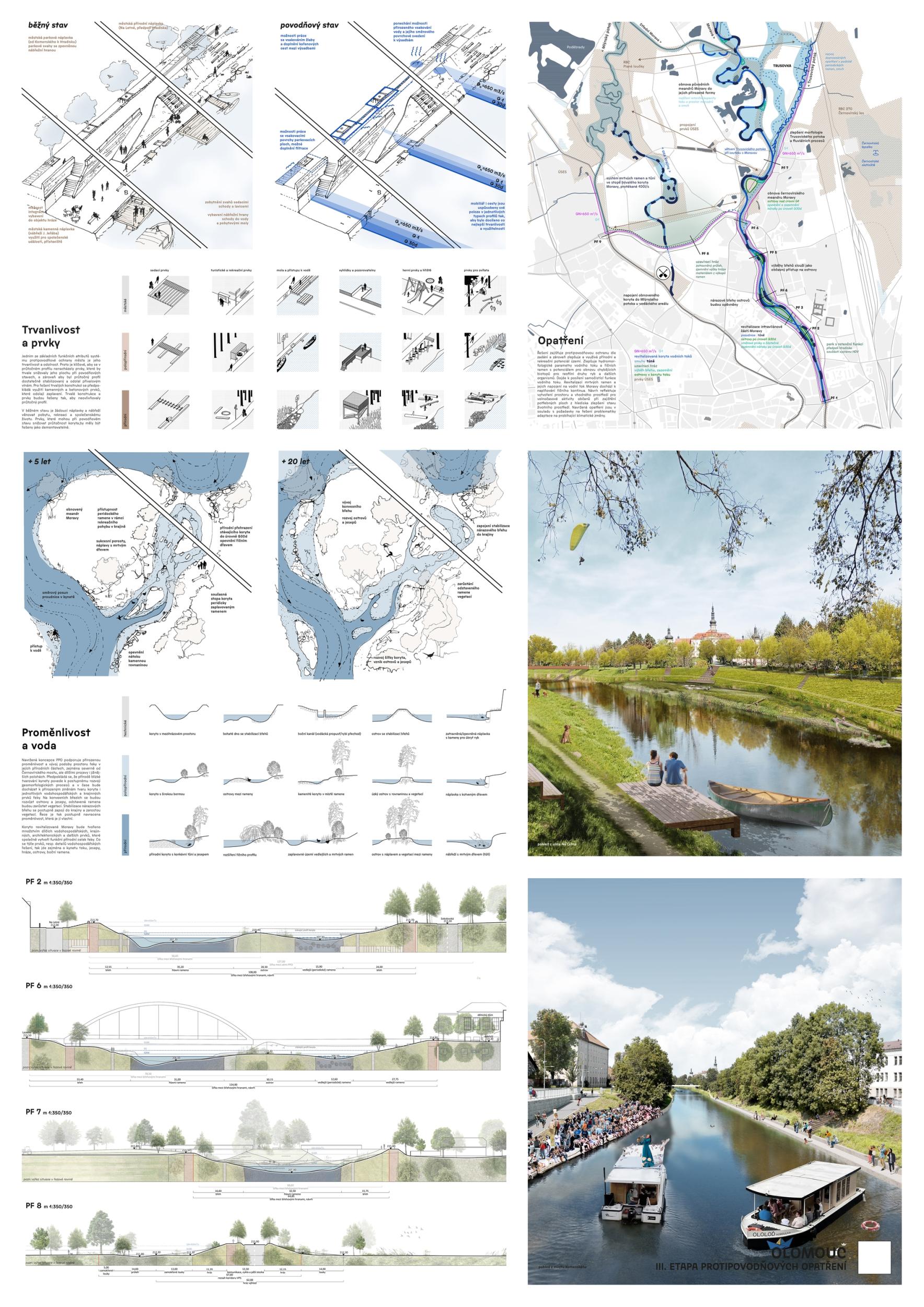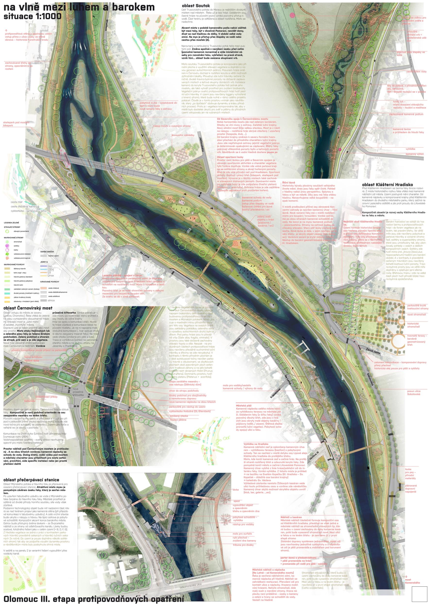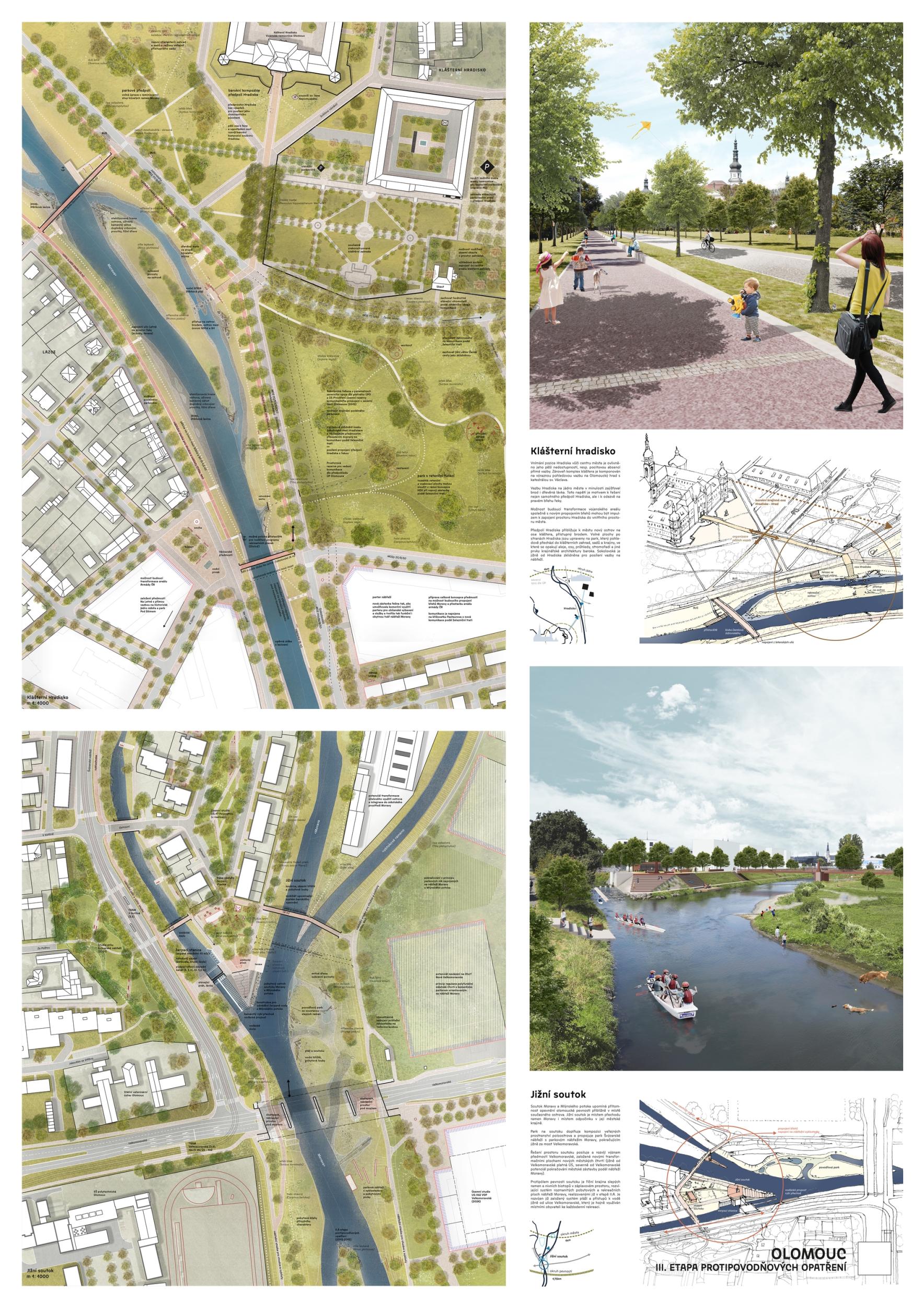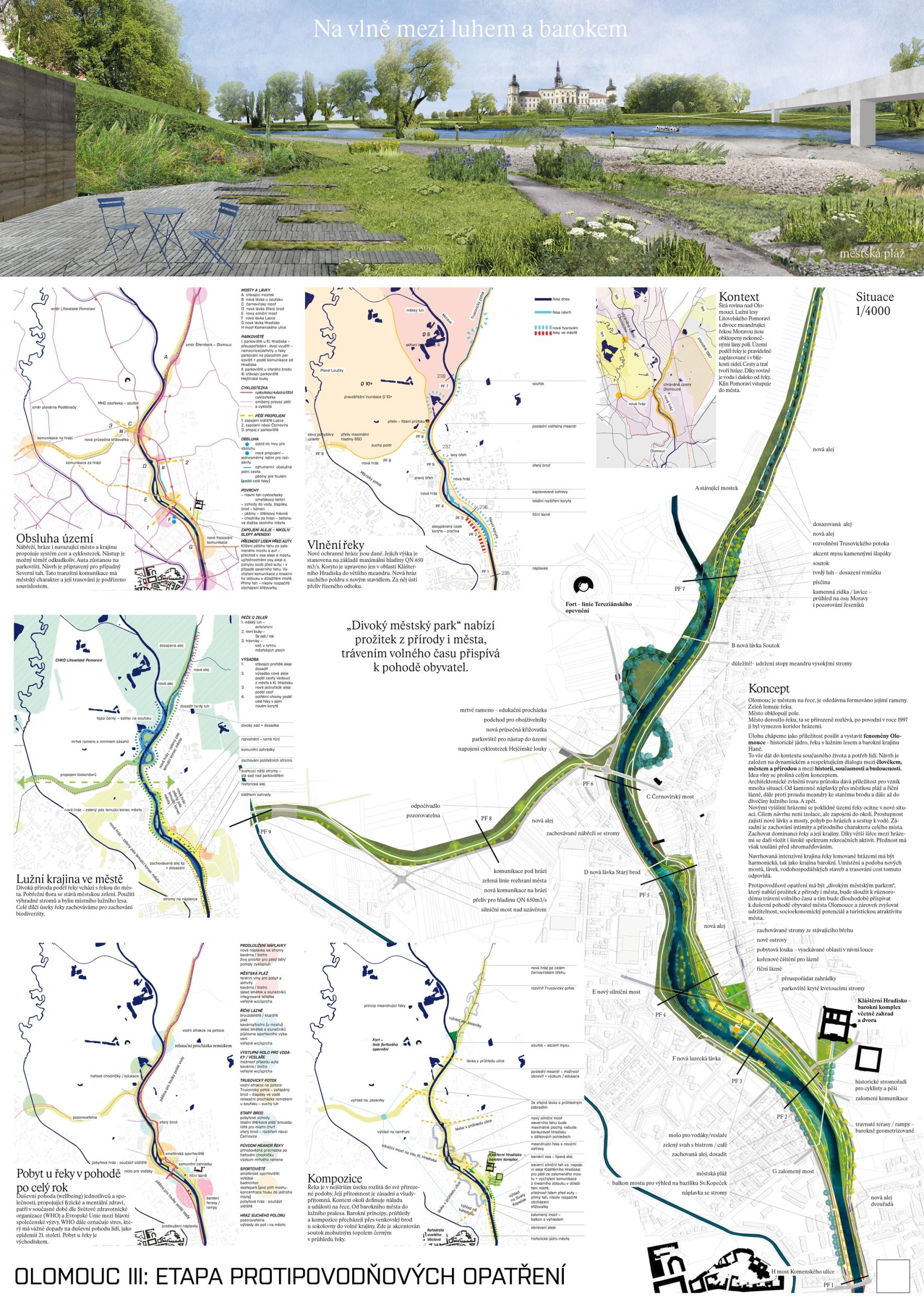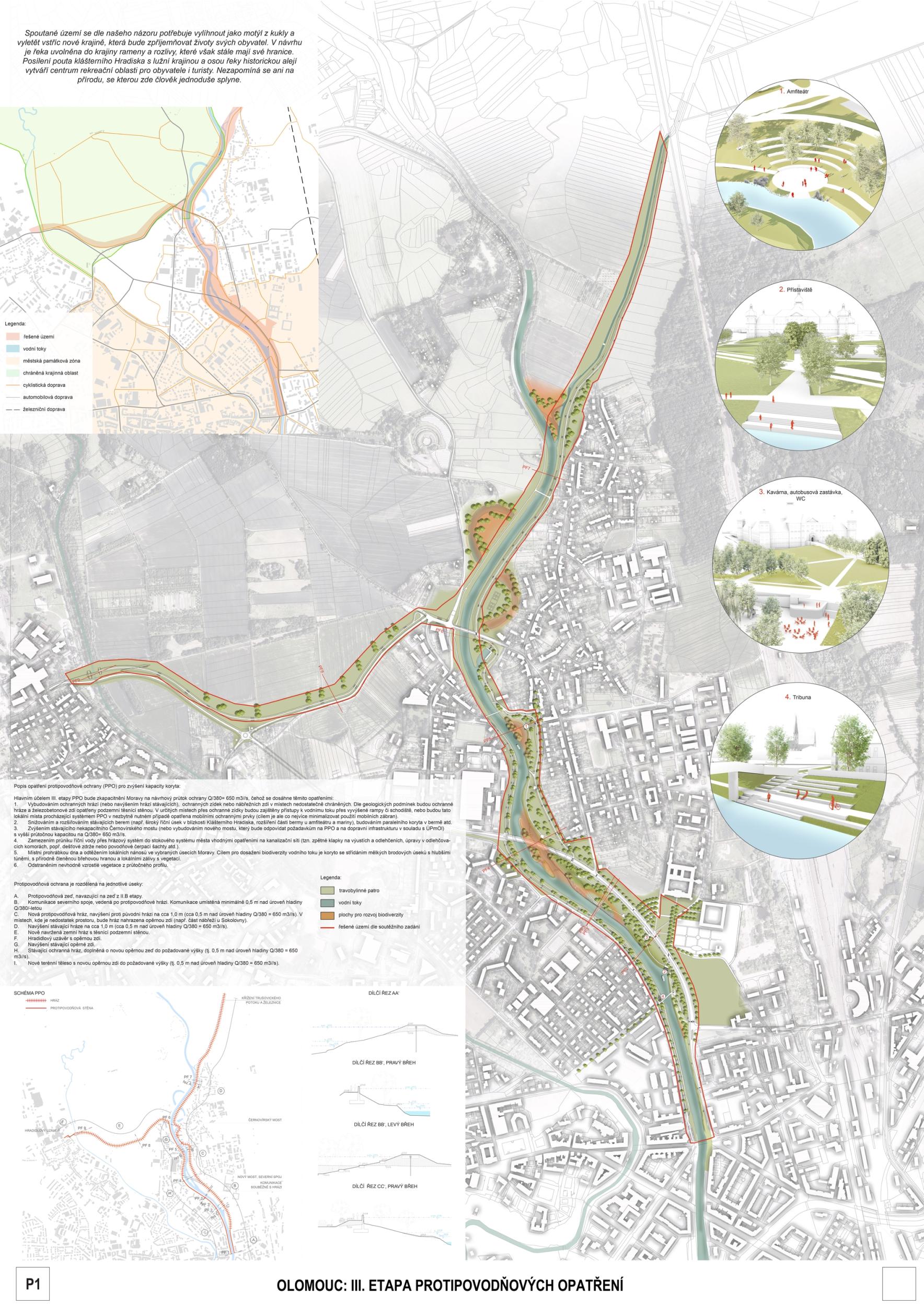 Úlohu chápeme jako příležitost posílit fenomény Olomouce - historické jádro a řeku s lužním lesem. To vše dát do kontextu současného života lidí. Zvlnění tvaru průtoku dává příležitost pro vznik mnoha situací. Od kamenné náplavky, přes městkou pláž až do divočiny lužního lesa. Kraji-na řeky lemované hrázemi má být harmonická, tak jako krajina barokní. Umístění a podoba nových hrází, mostů a cest tomuto odpovídá. „Divoký městský park“ nabízí prožitek z přírody i města, trávením volné-ho času přispívá k pohodě obyvatel.
