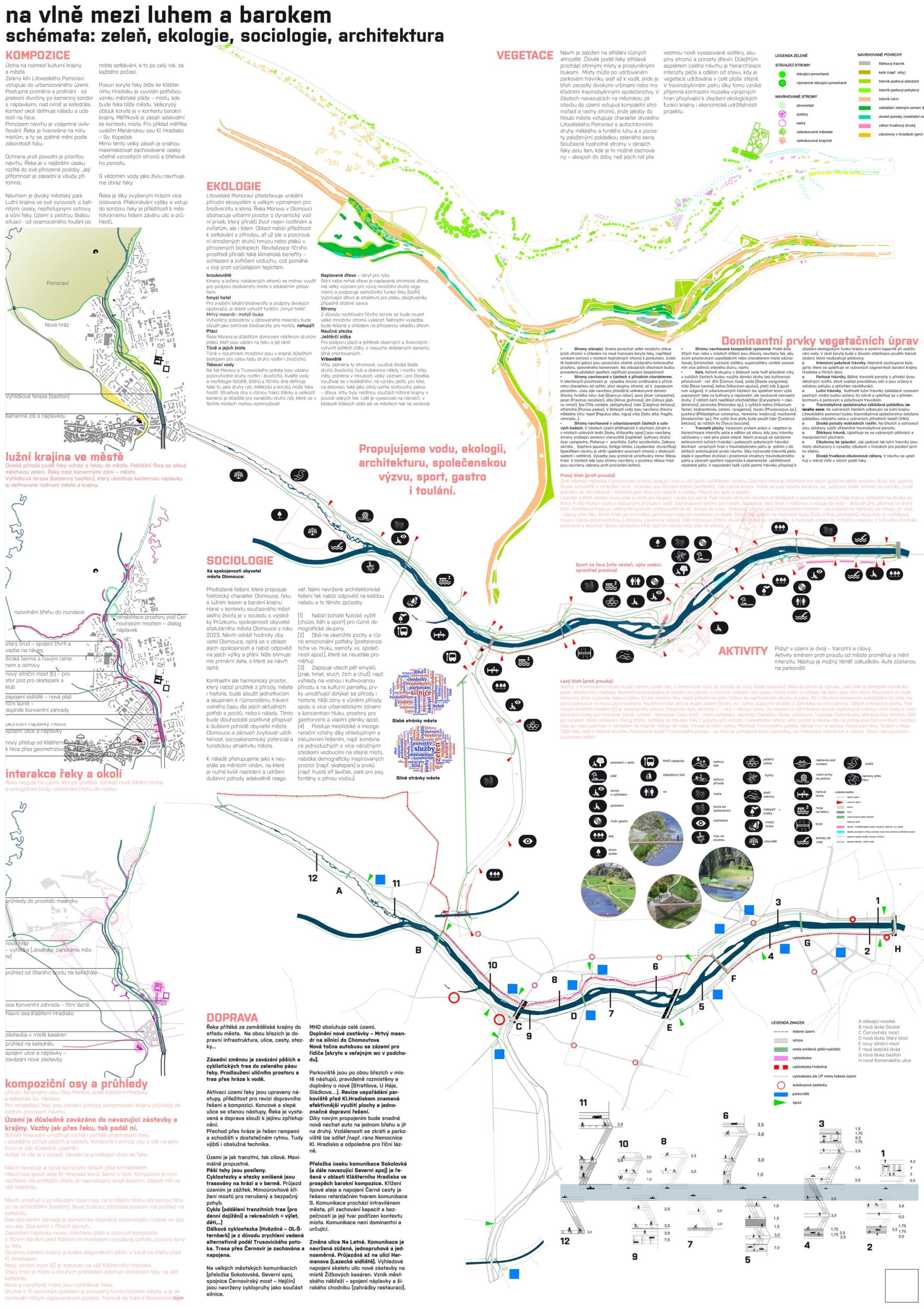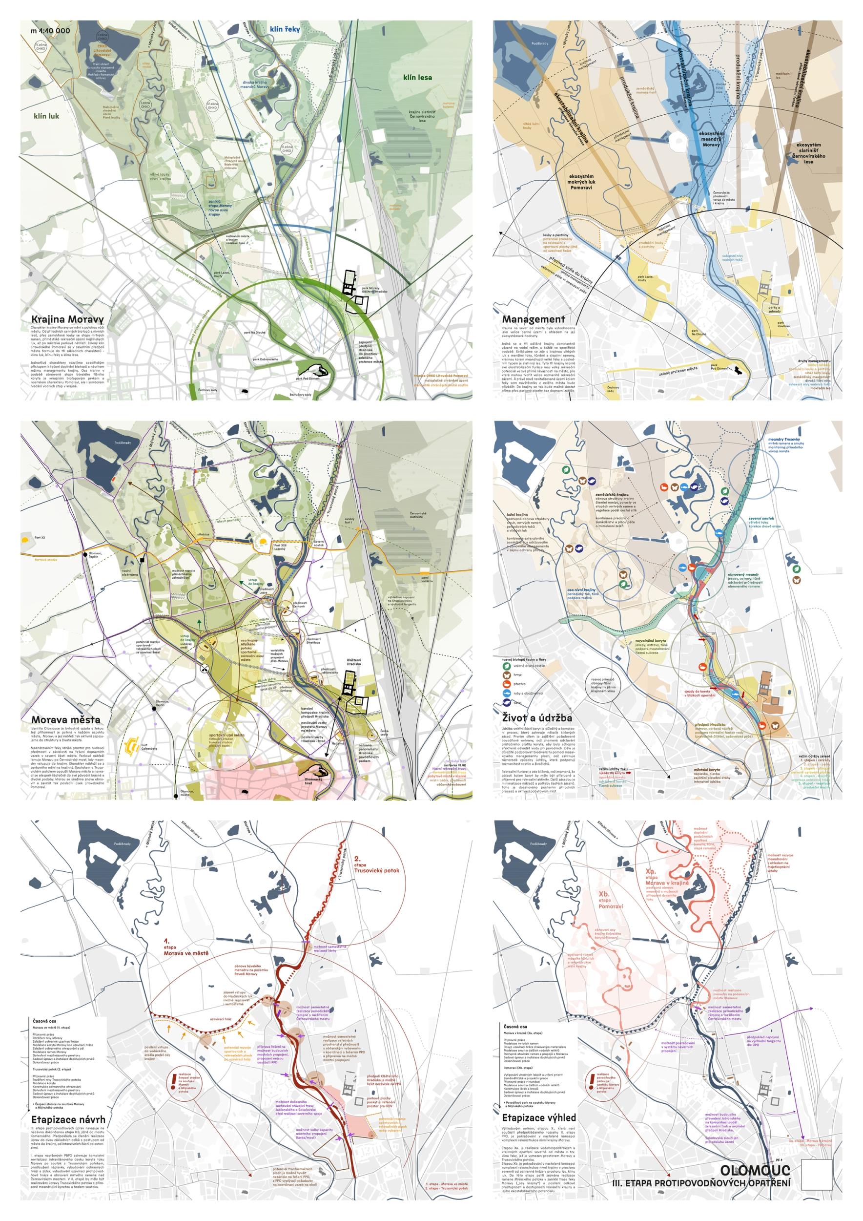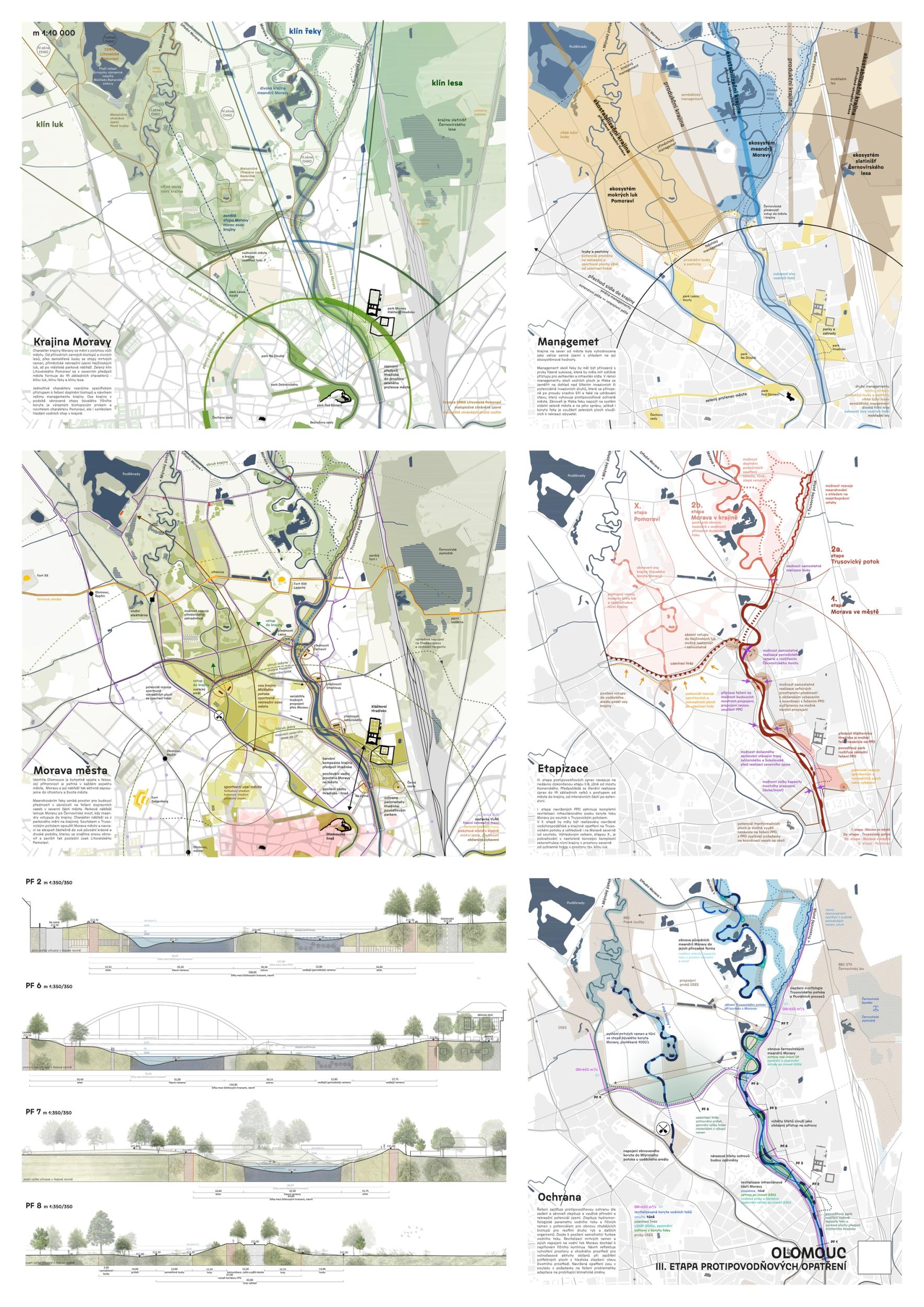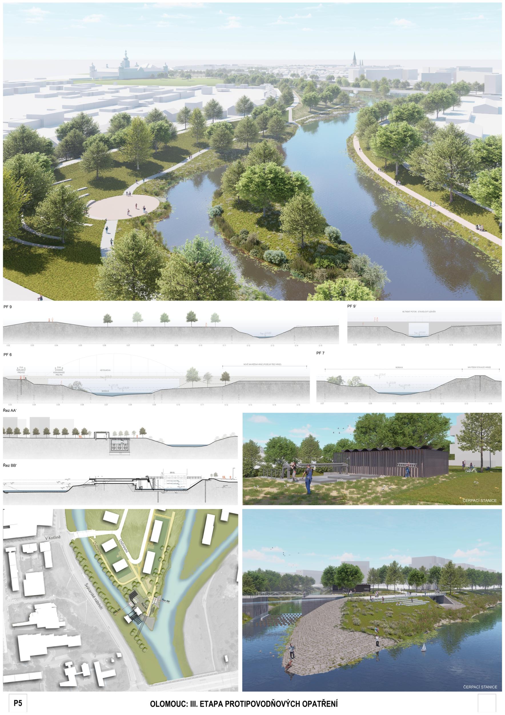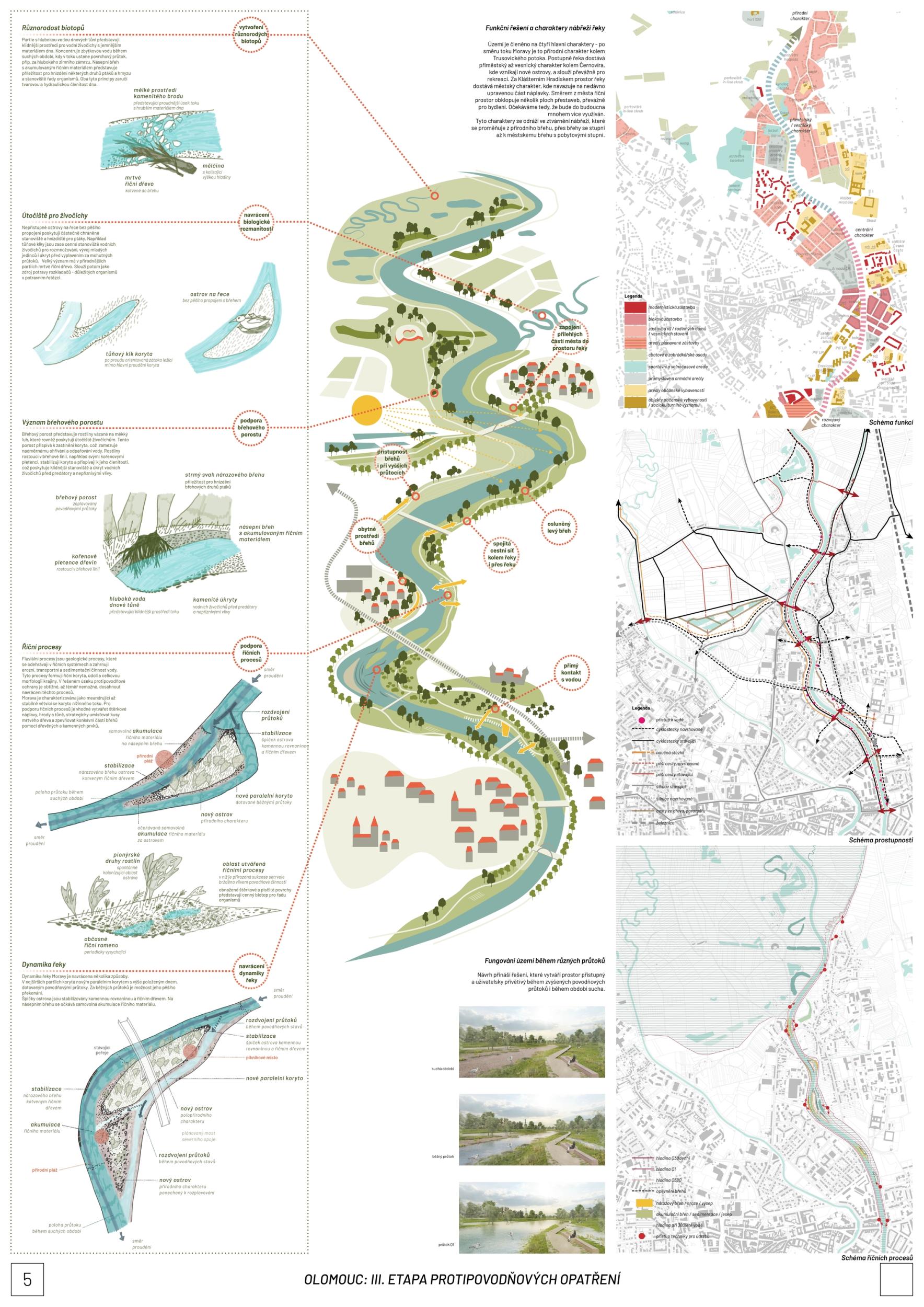 Úlohu chápeme jako příležitost posílit fenomény Olomouce - historické jádro a řeku s lužním lesem. To vše dát do kontextu současného života lidí. Zvlnění tvaru průtoku dává příležitost pro vznik mnoha situací. Od kamenné náplavky, přes městkou pláž až do divočiny lužního lesa. Kraji-na řeky lemované hrázemi má být harmonická, tak jako krajina barokní. Umístění a podoba nových hrází, mostů a cest tomuto odpovídá. „Divoký městský park“ nabízí prožitek z přírody i města, trávením volné-ho času přispívá k pohodě obyvatel.