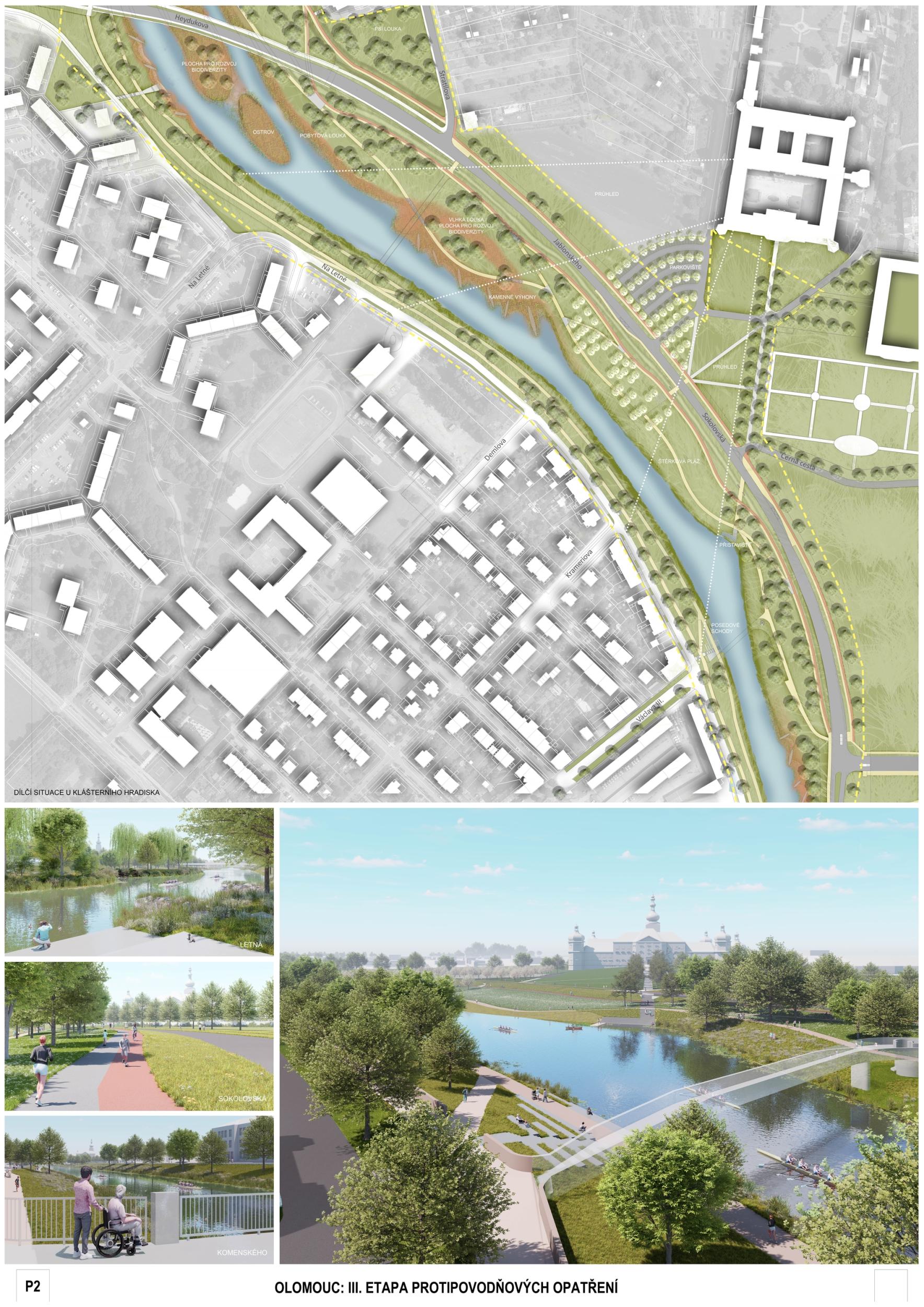 Návrh, který získal první cenu, zaujal porotu především svým širokým koncepčním uchopením území a jeho provázaností s širším okolím. Přesvědčivě definuje centra, vztahy k městu i napojení na další urbanistické a přírodní struktury. Jeho silnou stránkou je také argumentační základna, která poskytuje pevný podklad pro budoucí implementaci. Detailně zpracovaná etapizace návrhu umožňuje jeho postupnou realizaci a obhajuje širší zásah i mimo řešené území. Z funkčního hlediska je návrh promyšlený, i když některé prvky vzbuzují kontroverze. Dopravní řešení je ambiciózní a pracuje s horizontem přesahujícím 50 let, což však bude nutné přizpůsobit současným podmínkám; Návrh dopravy aktuálně neodpovídá platnému územnímu plánu. Při konzervativnějším přístupu k dopravě se návrh jeví jako jednoznačný favorit, ačkoli zpomalení průjezdu městem a neimitování dálničního průtahu může být vnímáno i jako nevýhoda v rámci funkční efektivity. Z kompozičního hlediska je patrná snaha o novodobou interpretaci barokní struktury, zejména v trasování komunikací a figuře křížení alejí a stromořadí pod Hradiskem. Toto řešení může působit nepochopitelně a nekoresponduje zcela se současnými urbanistickými principy, ale současně má potenciál podpořit logiku dopravního řešení. Jisté rezervy návrh vykazuje v práci s rozdílnými měřítky a charakterem území. Přechod mezi přírodním a městským prostředím je v návrhu řešen poměrně homogenním způsobem, což vede k absenci nuance mezi jednotlivými částmi; není zohledněn kontakt města. Koncept biodiverzity je na některých místech sporný – v určitých lokalitách působí jako uměle implantovaný prvek bez dostatečné logiky. Jedním z největších rizik návrhu je jeho řešení v nejkritičtějším místě – reakce na povodňové nebezpečí není zatím dostatečně promyšlená. Postavení hlavních prvků kolmo vůči povodni může být problematické. Přepracování však může vést i k úsporám a lepšímu logickému uspořádání. Dalším kritickým bodem je koncepční a hydraulická nefunkčnost řešení v oblasti před Hradiskem – především v otázce ostrova s biodiverzitou, jehož umístění na opačném břehu by dávalo větší smysl. Na zvážení je rovněž umístění amfiteátru do rozvojové plochy biodiverzity. Přes tyto výhrady zůstává návrh celkově nejlépe zpracovaným řešením, s vysokou mírou detailu a rozpracovanosti, což jej činí přesvědčivým základem pro budoucí rozvoj území.