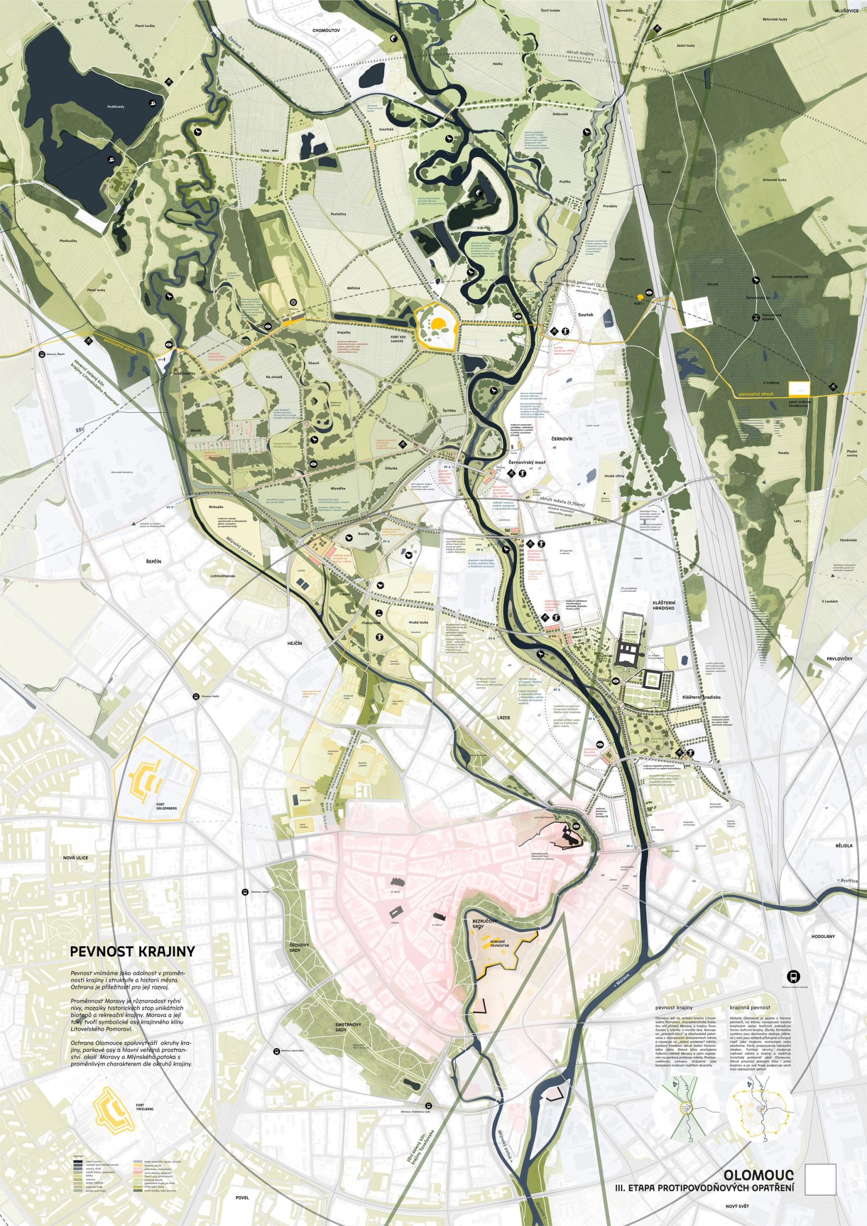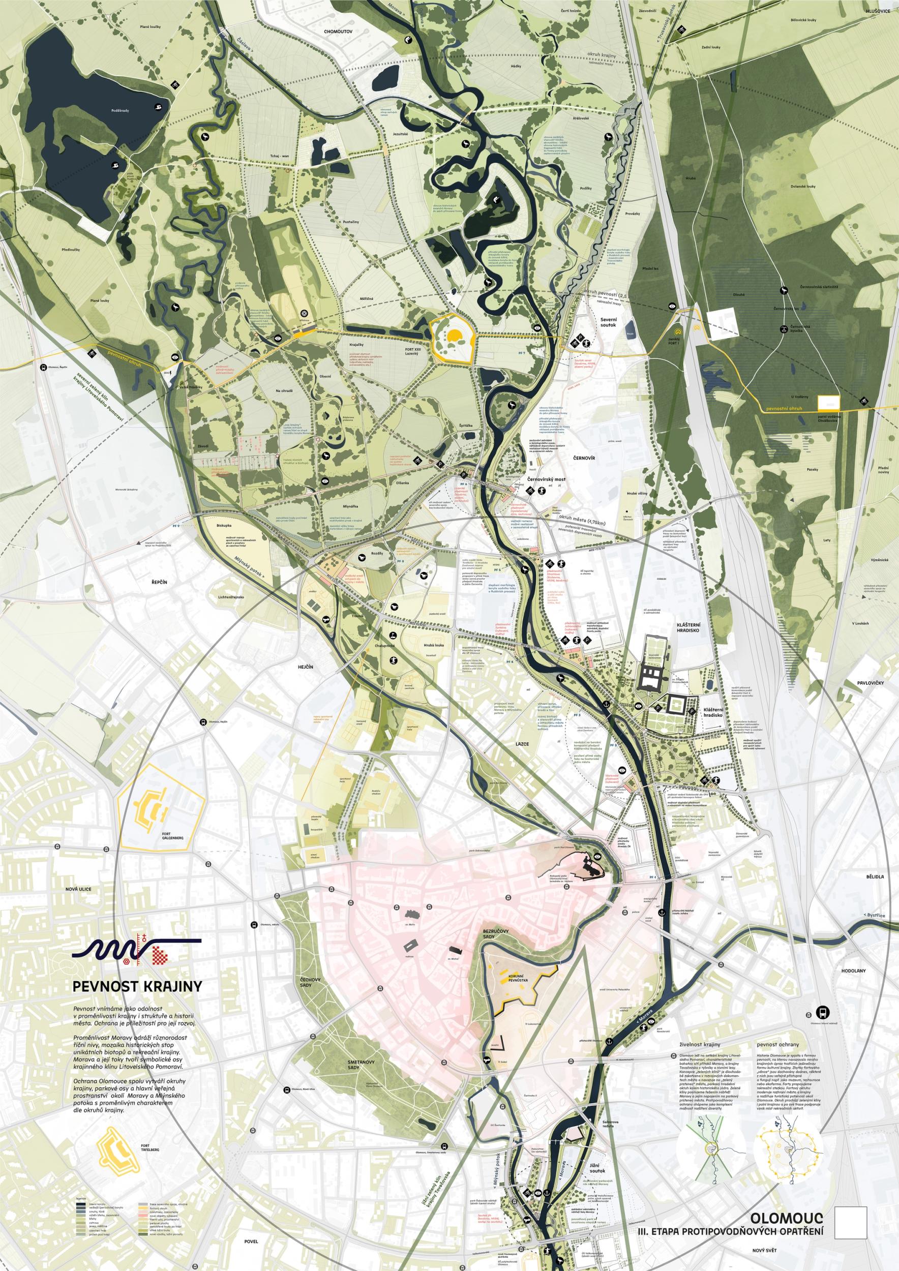 Pevnost vnímáme jako odolnost v proměnlivosti krajiny i struktuře a historii města. Ochrana je příležitostí pro její rozvoj. Proměnlivost Moravy odráží různorodost říční nivy, mozaika historických stop unikátních biotopů a rekreační krajiny. Morava a její toky tvoří symbolické osy krajinného klínu Litovelského Pomoraví. Ochrana Olomouce spolu vytváří okruhy krajiny, parkové osy a hlavní veřejná prostranství okolí Moravy a Mlýnského potoka s proměnlivým charakterem dle okruhů krajiny.