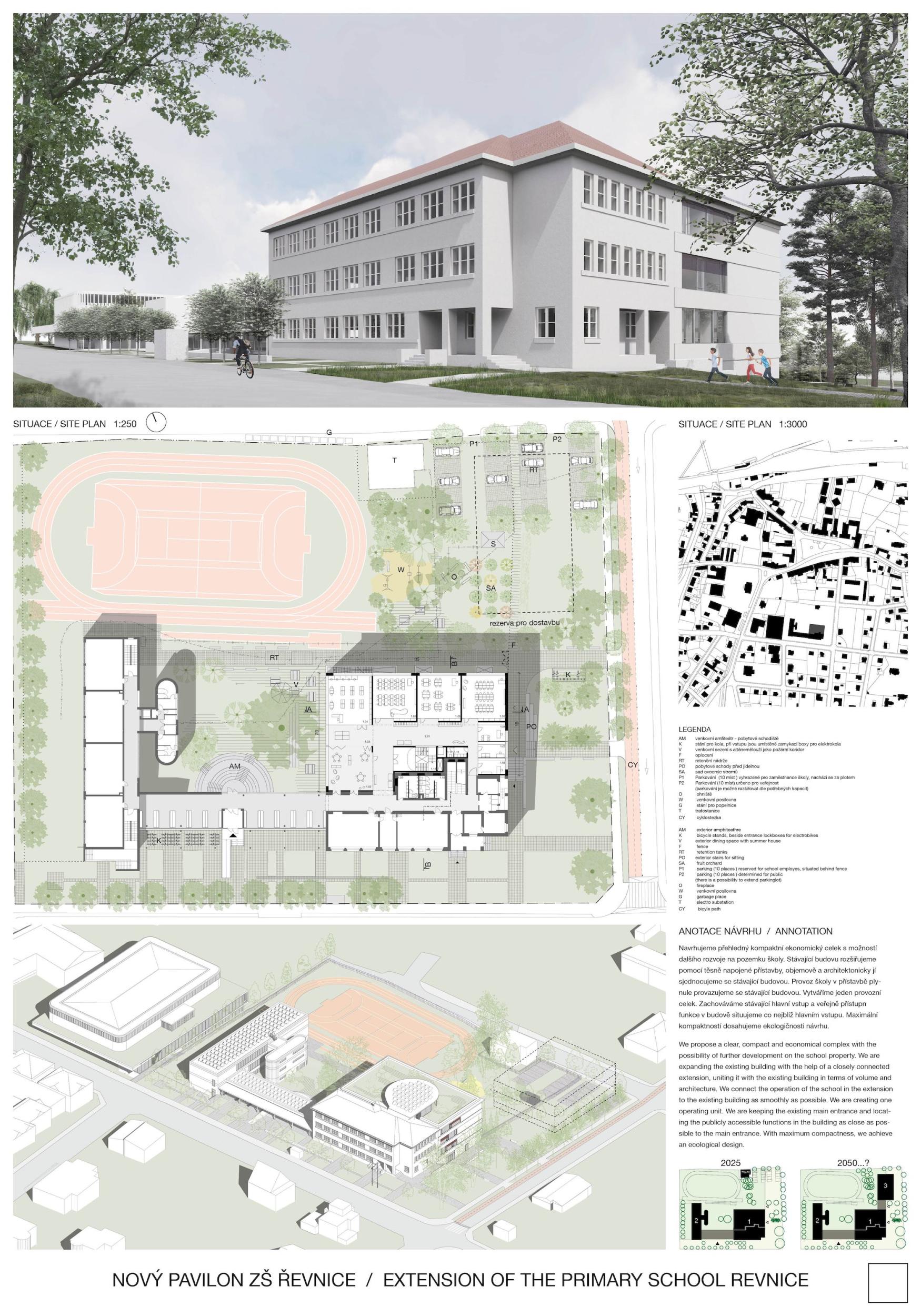 Navrhujeme přehledný kompaktní a ekonomický celek s možností dalšího rozvoje na pozemku školy. Stávající budovu rozšiřujeme pomocí těsně napojené přístavby, objemově a architektonicky jí sjednocujeme se stávající budovou. Provoz školy v přístavbě plynule provazujeme se stávající budovou. Vytváříme jeden provozní celek. Zachováváme stávající hlavní vstup a veřejně přístupné funkce v budově situujeme co nejblíž hlavnímu vstupu. Maximální kompaktností dosahujeme ekologičnosti návrhu.