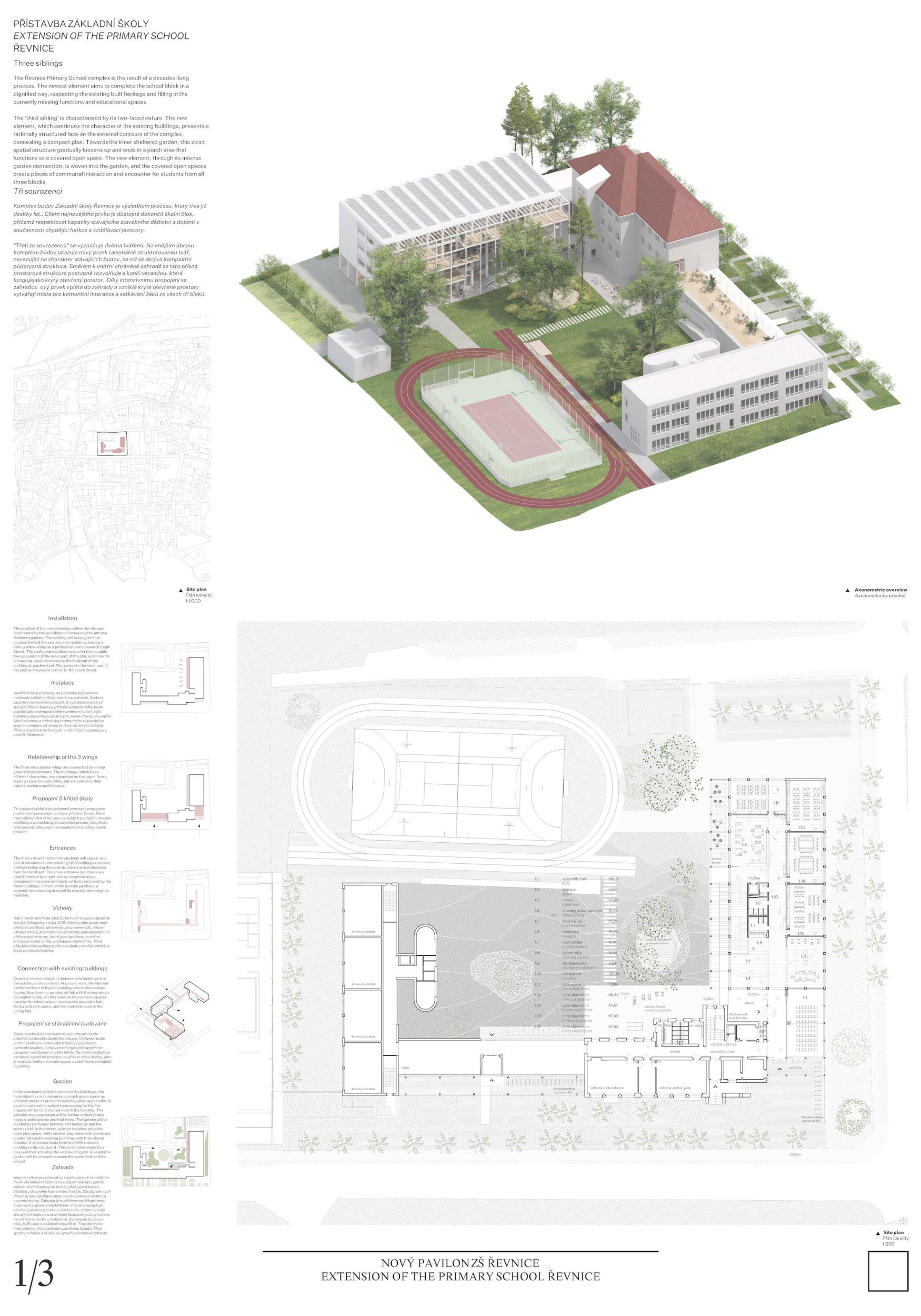 Komplex budov Základní školy Řevnice je výsledkem procesu, který trvá již desítky let. Cílem nejnovějšího prvku je důstojně dokončit školní blok, přičemž respektovat kapacity stávajícího stavebního dědictví a doplnit v současnosti chybějící funkce a vzdělávací prostory. "Třetí ze sourozenců" se vyznačuje dvěma tvářemi. Na vnějším obrysu komplexu budov ukazuje nový prvek racionálně strukturovanou tvář, navazující na charakter stávajících budov, za níž se skrývá kompaktní půdorysná struktura. Směrem k vnitřní chráněné zahradě se tato přísná prostorová struktura postupně rozvolňuje a končí verandou, která funguje jako krytý otevřený prostor. Díky intenzivnímu propojení se zahradou ový prvek vplétá do zahrady a vzniklé kryté otevřené prostory vytvářejí místa pro komunitní interakce a setkávání žáků ze všech tří bloků.